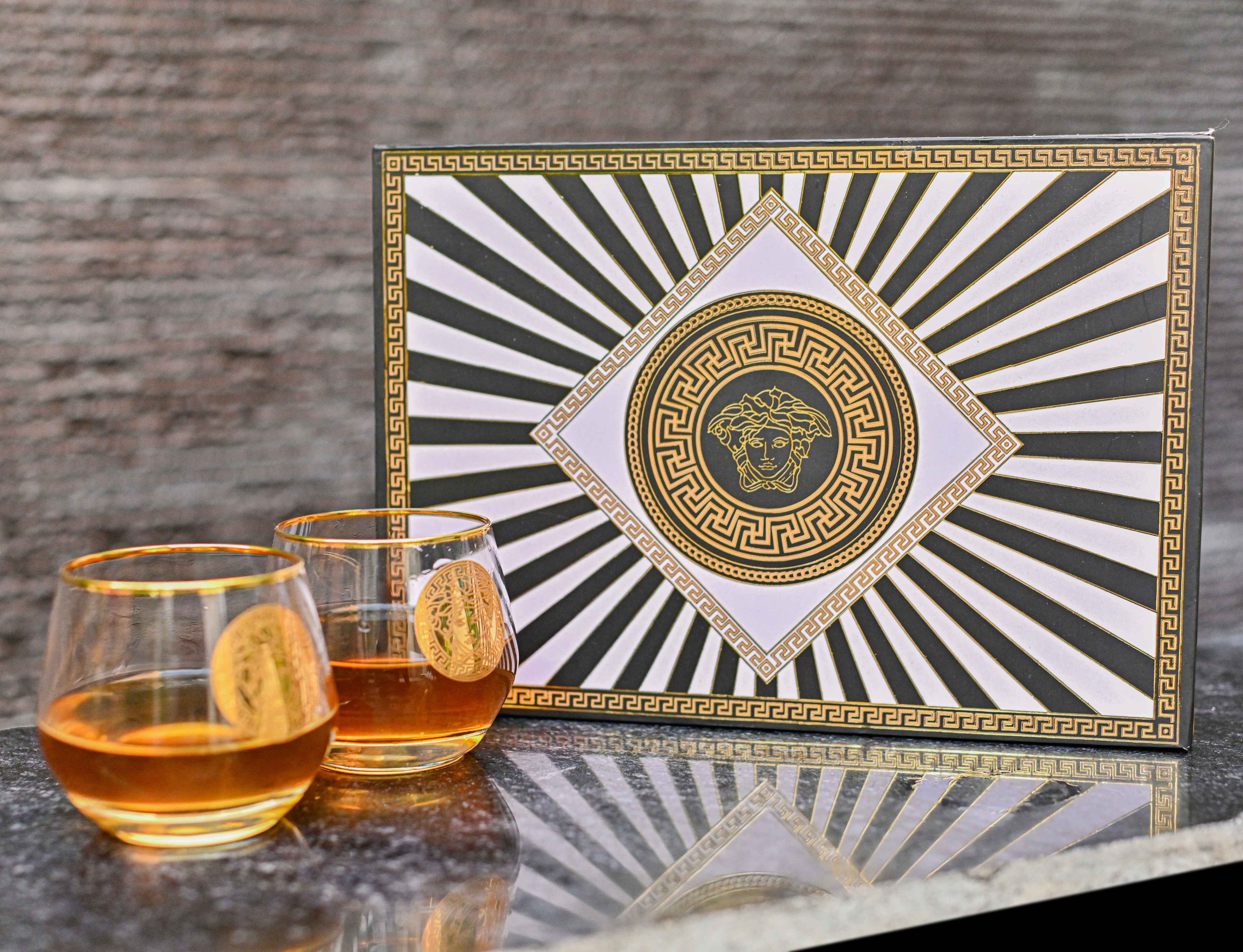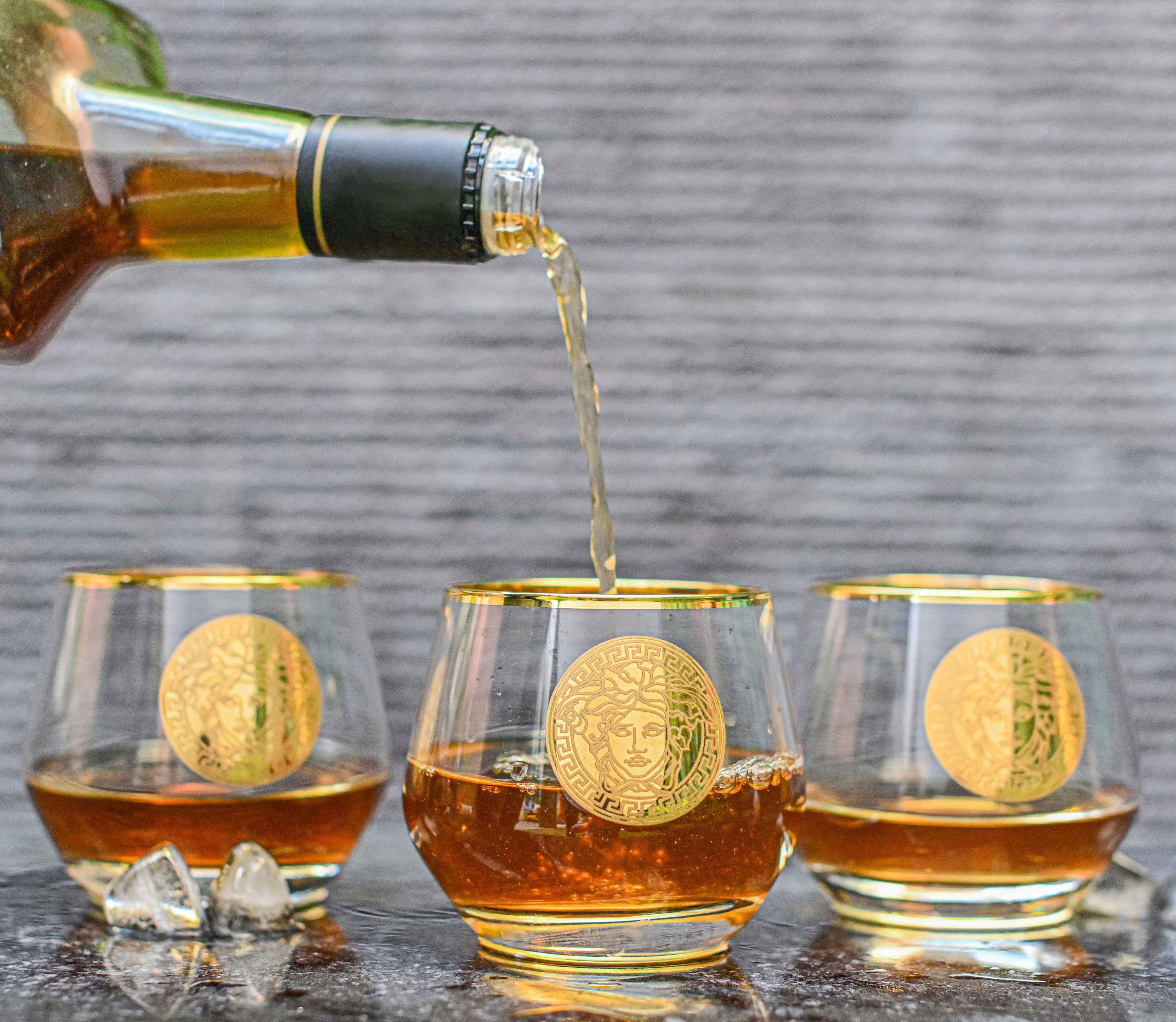 Versace gold plated 100% pure original crystal glassware is a line of high-end drinkware that boasts a gleaming golden exterior and adds a touch of glamour to elevate your drinking experience. Make a lasting impression with the shine of a golden rim on your crystal glass. These glasses are made in Turkey. This European country is renowned for its rich history of glass-making and is known for producing high-quality glass products. The skilled craftsmanship and attention to detail that goes into each piece of glassware is a testament to Turkey's heritage and expertise in the field. The addition of a golden rim enhances the aesthetic appeal of the glassware and adds a touch of luxury and elegance. Whether you're a collector of fine glassware or simply looking for a stylish way to enjoy your drinks, this crystal glass is a must-have for any connoisseur. Crystal glassware is prized for its beauty, clarity, and durability. Many people believe that crystal glassware enhances the taste of the beverage it contains. The clarity of the glass allows for a better appreciation of the color, aroma, and flavor of the drink. In addition to their luxurious design, the golden sheen of the glasses adds a touch of elegance and luxury to your dining experience. Versace glassware is an investment in quality and style that offers excellent value for money. With its luxurious design, premium materials, and meticulous craftsmanship, each piece is a work of art that will add a touch of glamour to your home. So why settle for ordinary glassware when you can have the best with Versace!