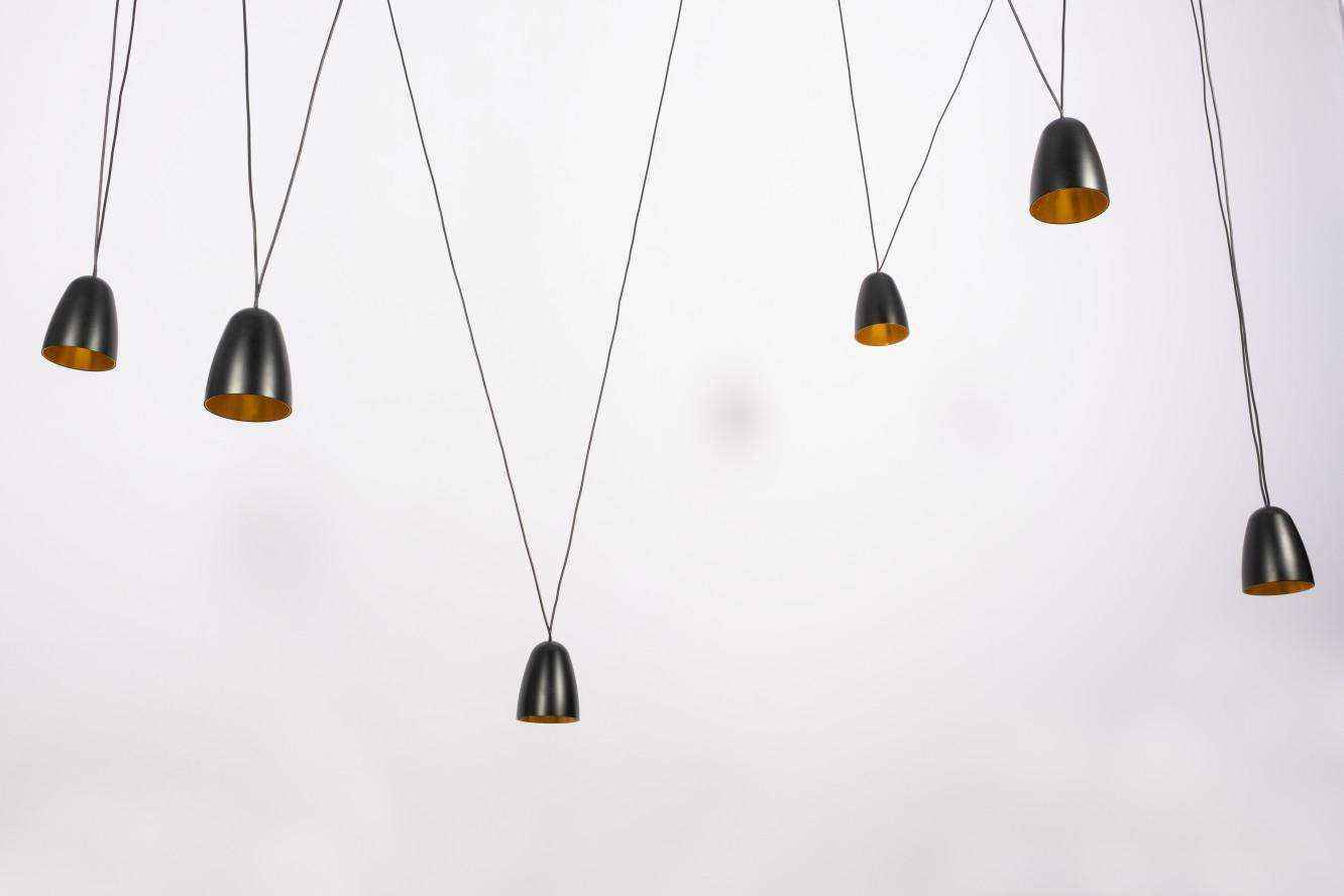 Decorate your living space with the beautifully modern look of this black six light chandelier. It comes in an open geometric frame made of several angular wire rods, resulting in an unusual design that draws the eye. The vintage-style cylindrical conical design create a welcoming diffusion of light. This design is perfect for a Mid-Century Modern or upscale loft setting. Two choices available - 3 shades and 6 shades.