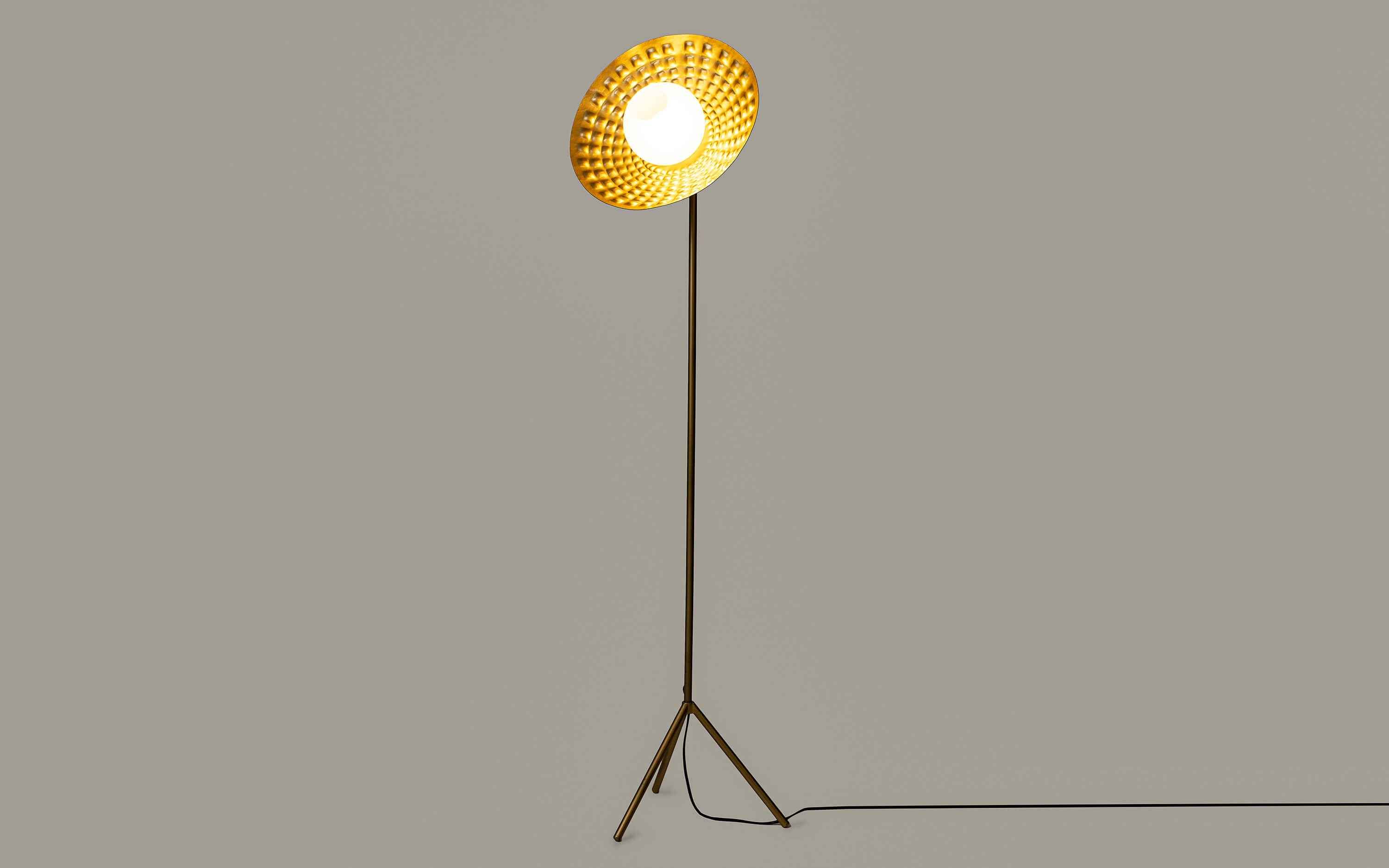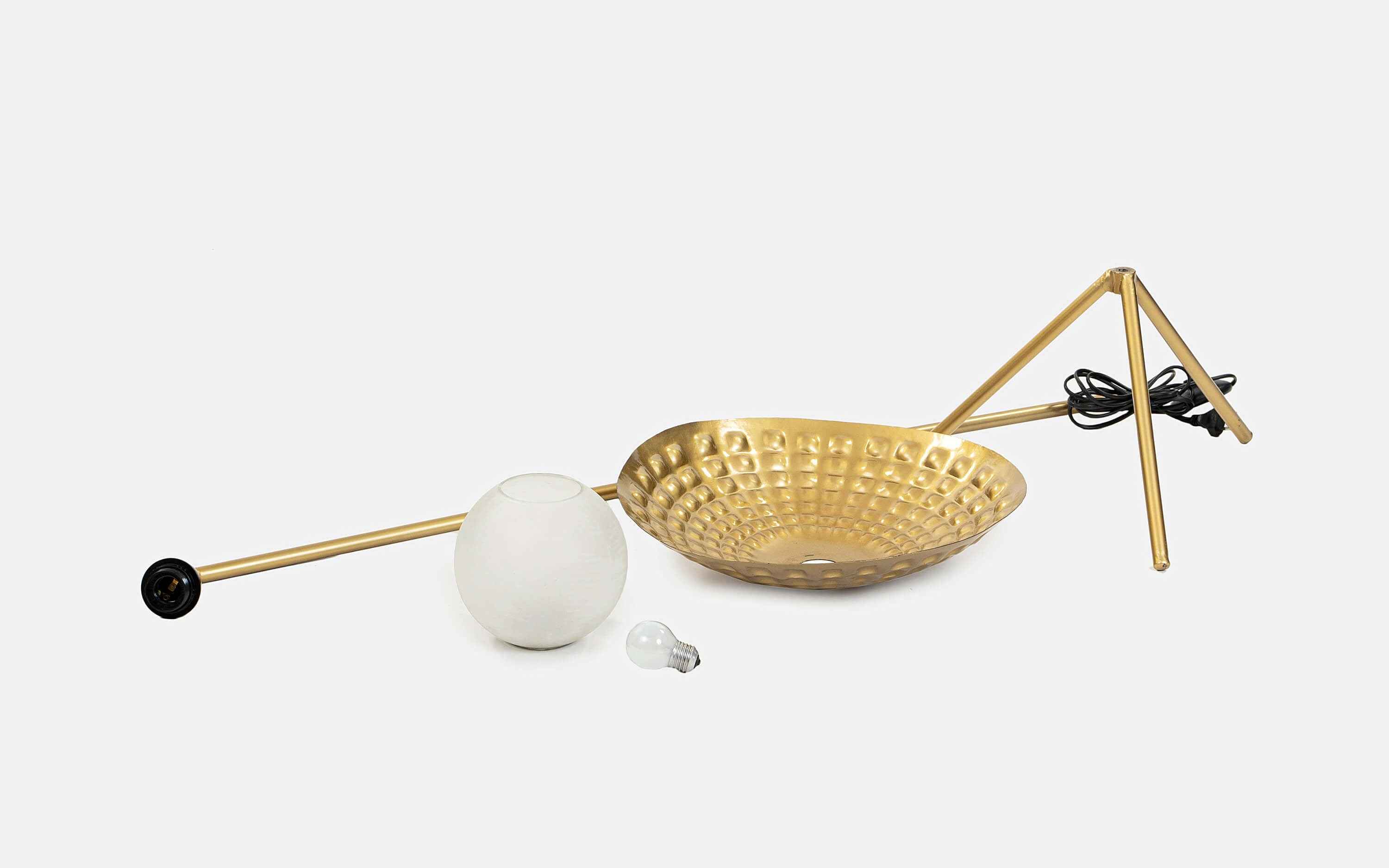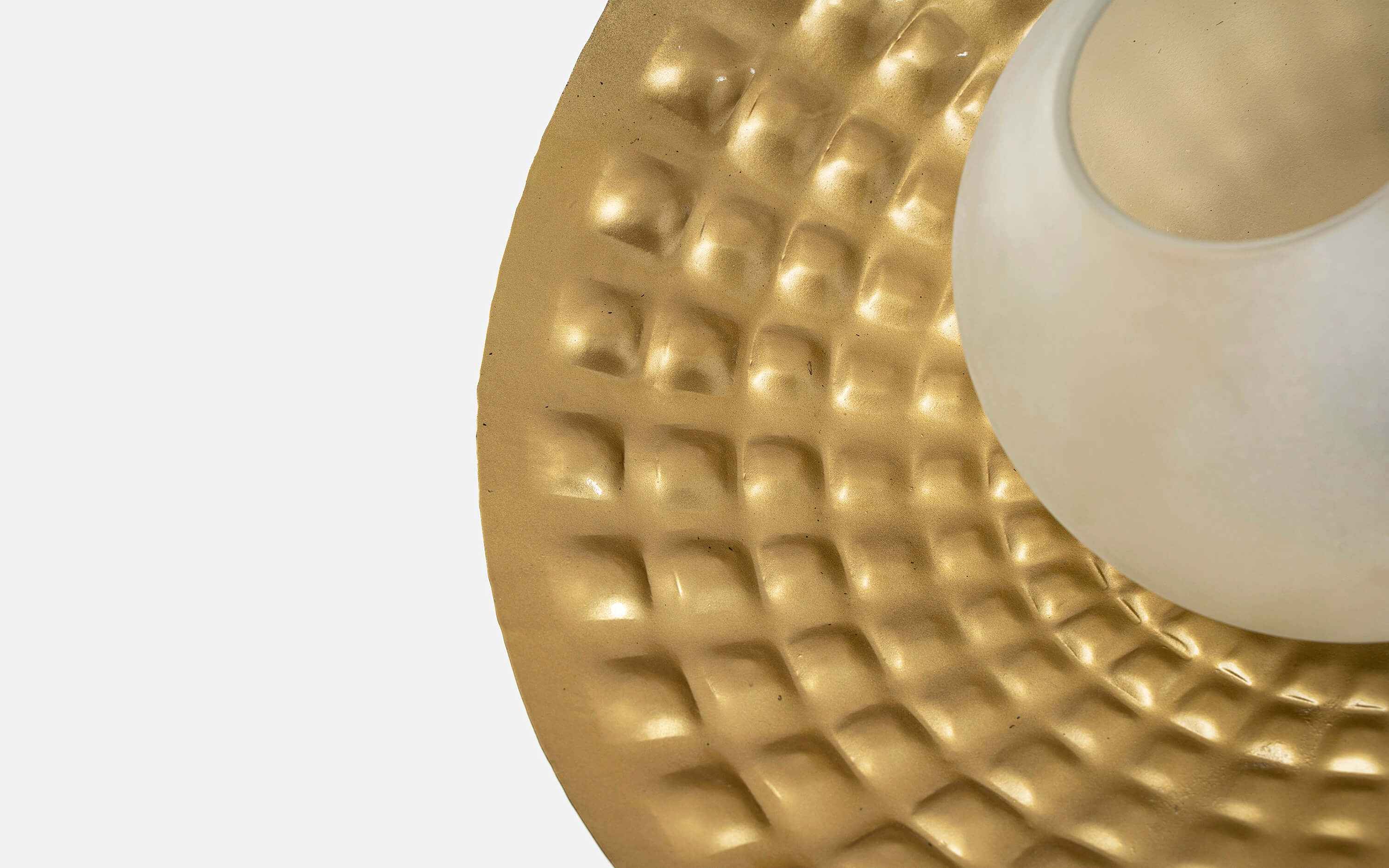 Refined and timeless, gold accents in lighting are perfectly suited to modern spaces; they infuse the room with a brighter light and create an elegant and unique reflection. In Lala Lamps the diffused light from the frosted glass ball falls on the symmetrically embossed gold disc highlighting and illuminating each block of the pattern providing delicate, bold, and outstanding refinery and personality. "Depending on your screen settings and resolution on your device there may be a slight variance in fabric color and wood polish of the image and actual product. Wood grains will vary from product to product in case of solid wood furniture."