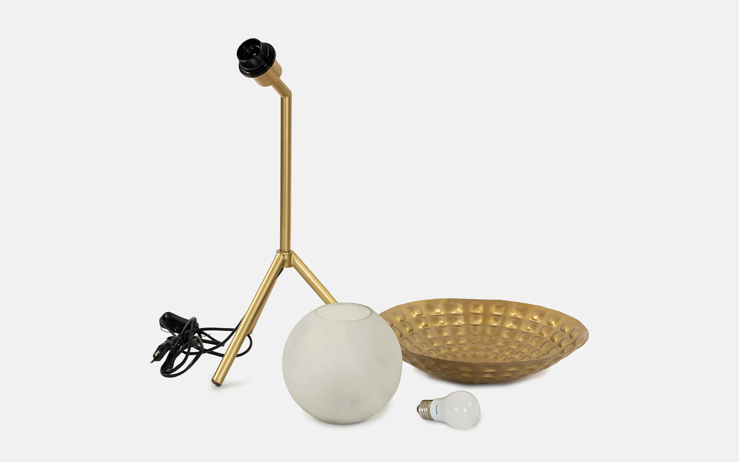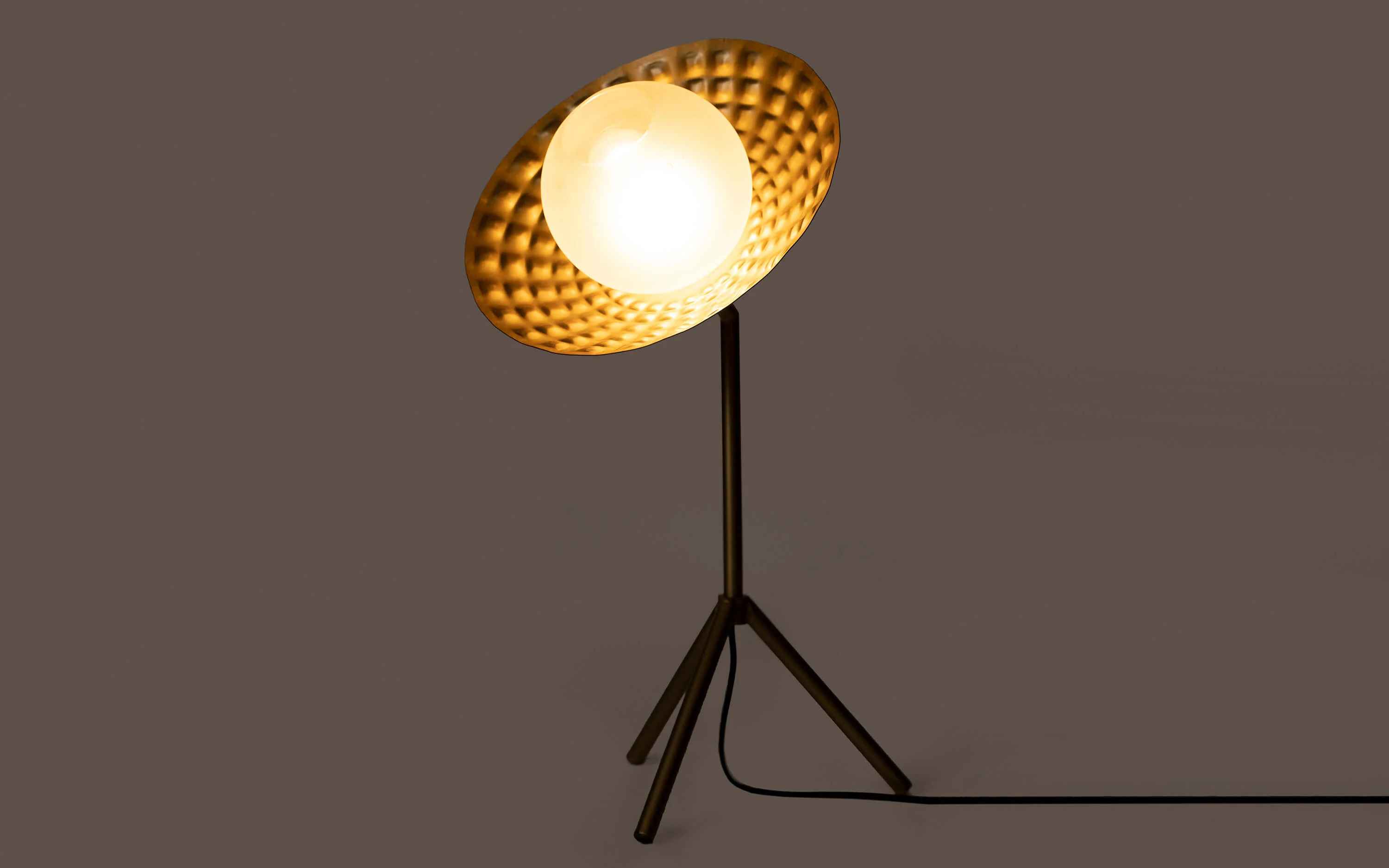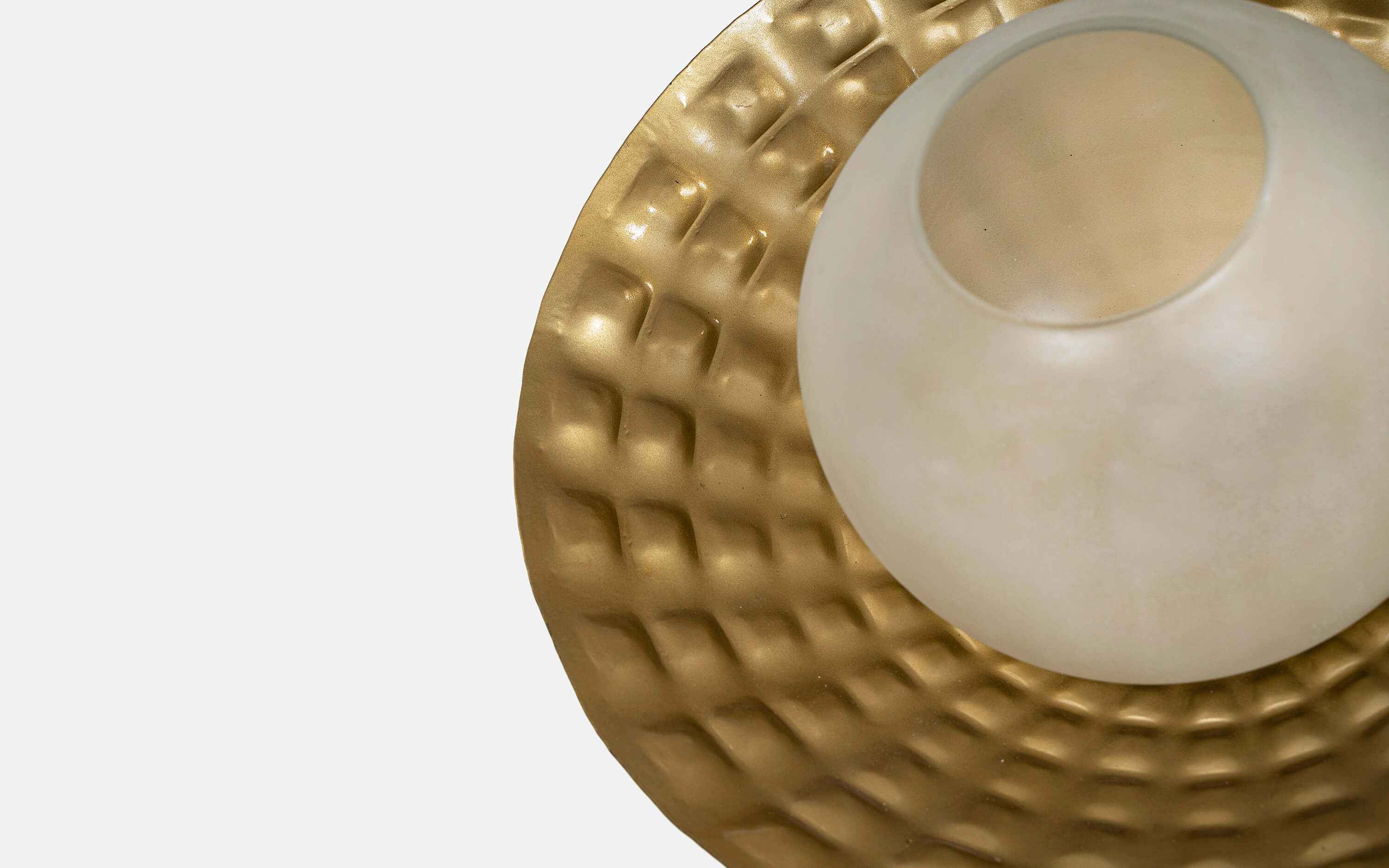 Refined and timeless, gold accents in lighting are perfectly suited to modern spaces; they infuse the room with a brighter light and create an elegant and unique reflection. In Lala Lamps the diffused light from the frosted glass ball falls on the symmetrically embossed gold disc highlighting and illuminating each block of the pattern providing delicate, bold, and outstanding refinery and personality. "Depending on your screen settings and resolution on your device there may be a slight variance in fabric color and wood polish of the image and actual product. Wood grains will vary from product to product in case of solid wood furniture."