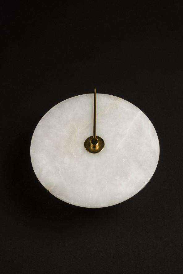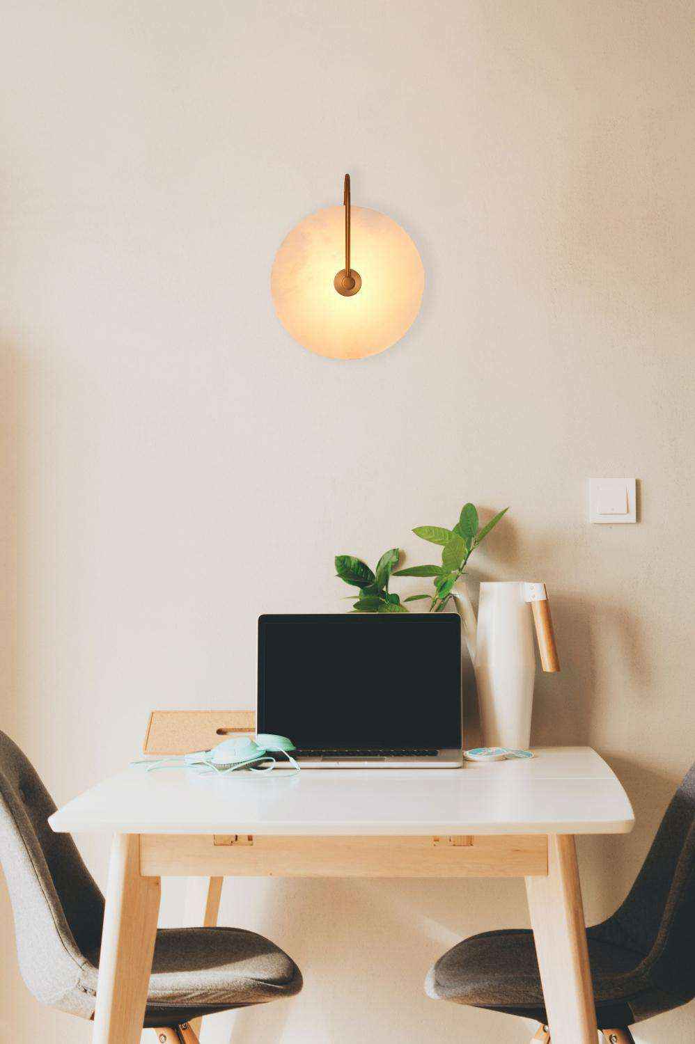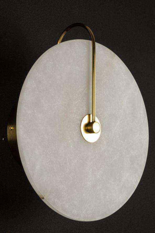 Add a finishing touch to your home with this contemporary wall sconce. The white circular sketched marble is complemented by a smooth, brushed gold finished base.