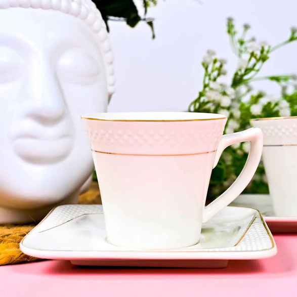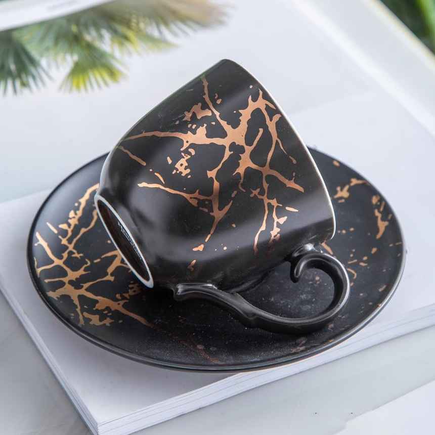 The Italian matte cup with saucer (Set of 6) comes with a classic gold marble pattern that has a luxurious elegance. The set is the right fusion of elegance and funk on the table top. The touch of gold gives it the perfect aesthetic allure. Crafted in ceramic, the cup and saucer set is accompanied by a premium gift box which enhances the appeal of the crockery set. The textured cup and saucer set has an authentic appearance and may be used on a regular or occasional basis. Accentuate the beauty of your dining landscape with this Italian Matte Tea Set. With this, serve not just tea, but also cappuccino and kahwa to your guests. With every sip, you would find yourself transported to the Royal Era.