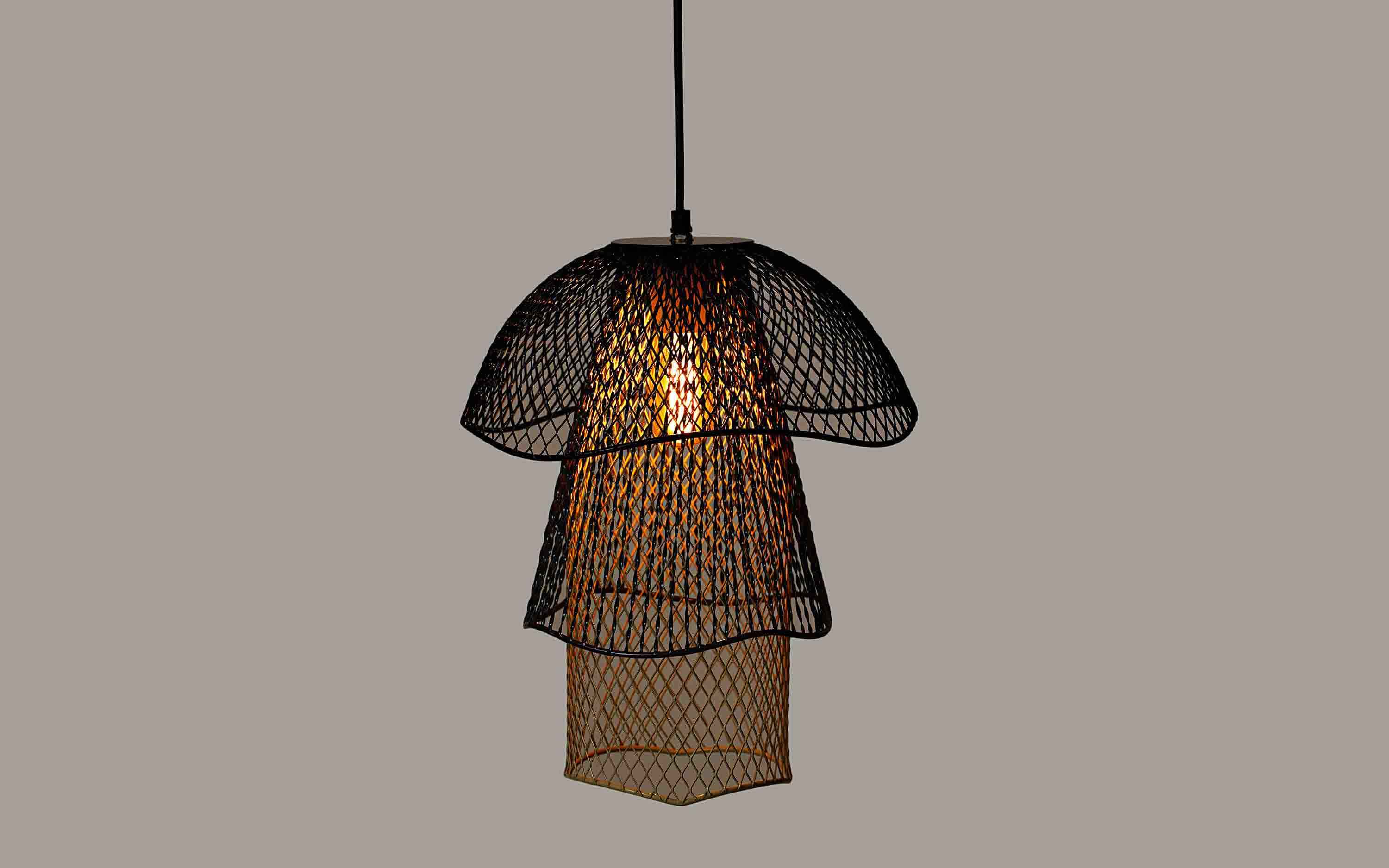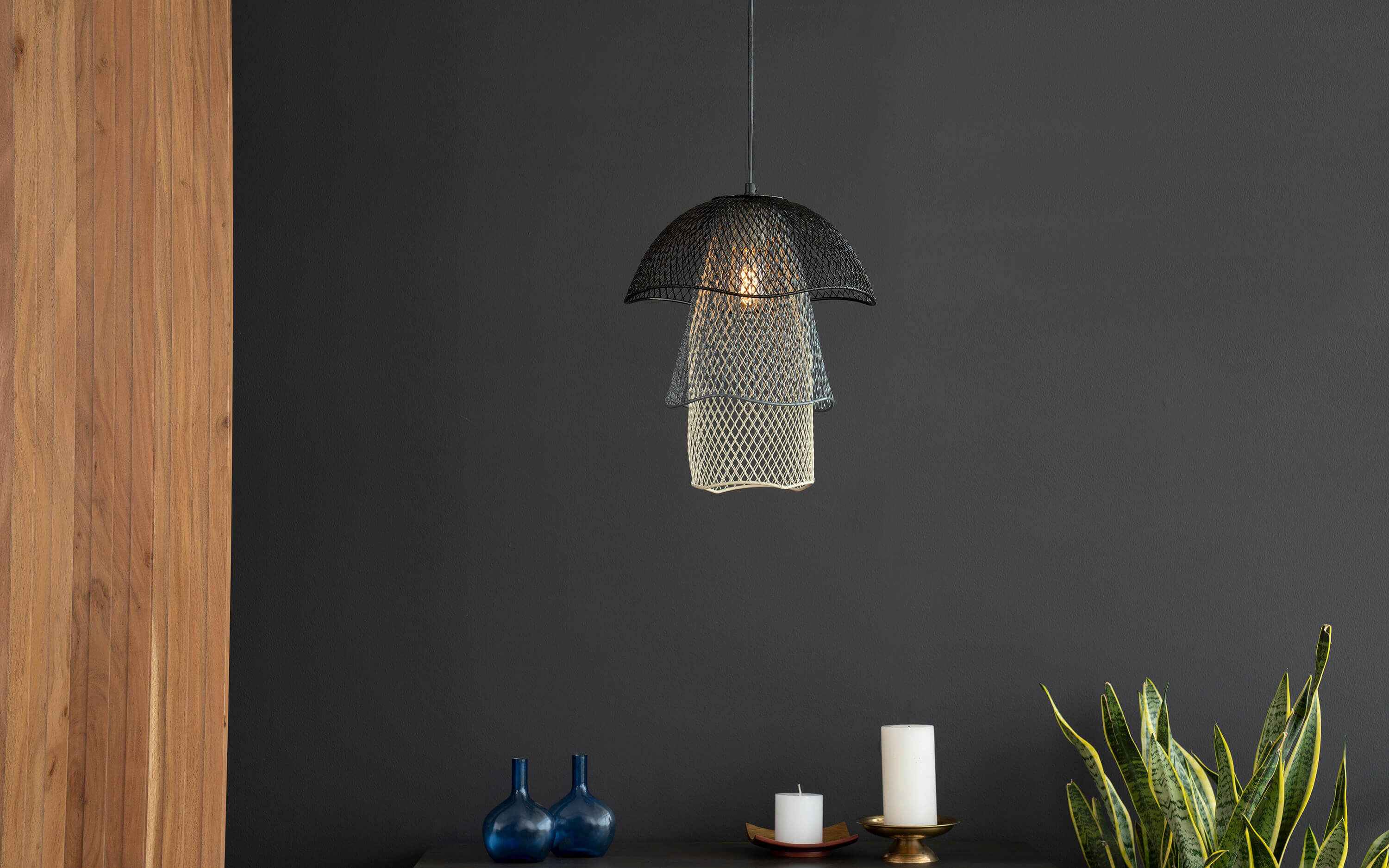 Inspired from the organic forms of a Jellyfish, Mallawi floor lamp is a masterpiece showing intricate workmanship and detail that can be achieved by Indian craftsmen. The nesting of three organic forms in three gradient colours forms the highlight of the collection. The Mallawi Black Tall Hanging Lamp is a sleek and stylish addition to any home. The lamp is made of iron with a black, grey, and off white finish. The lamp is perfect for any room in the house, including the living room, dining room, bedroom, or office. The lamp is also great for outdoor use. "Depending on your screen settings and resolution on your device there may be a slight variance in fabric color and wood polish of the image and actual product. Wood grains will vary from product to product in case of solid wood furniture."