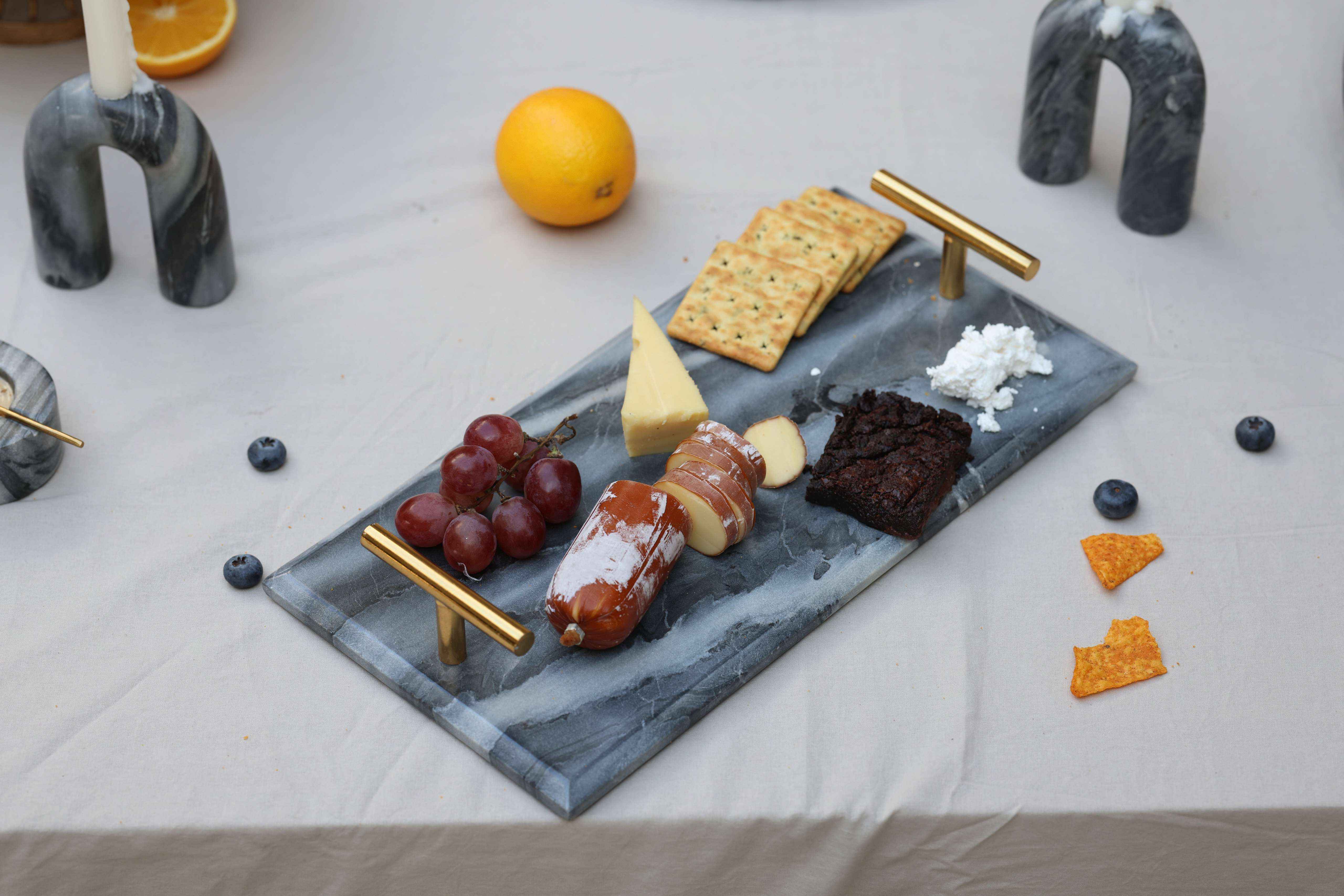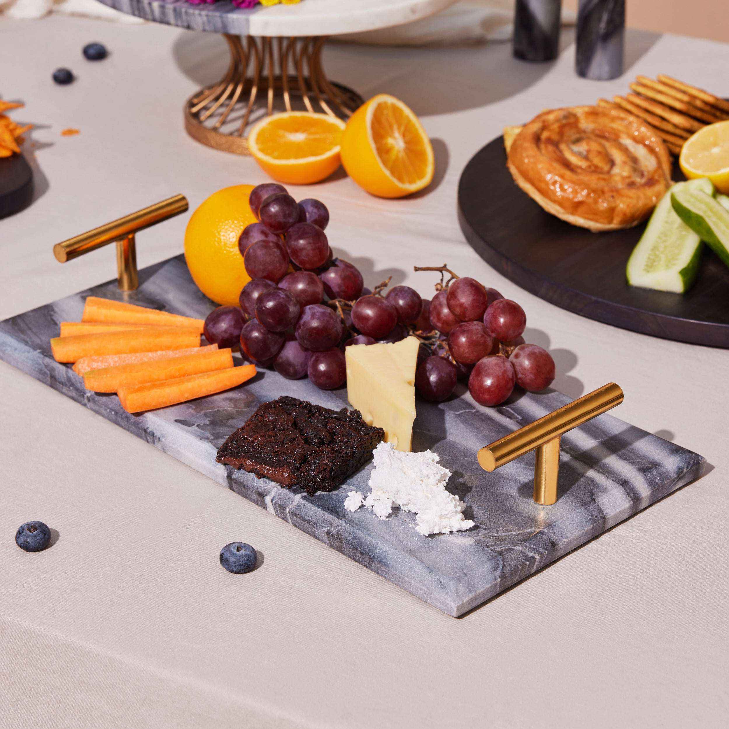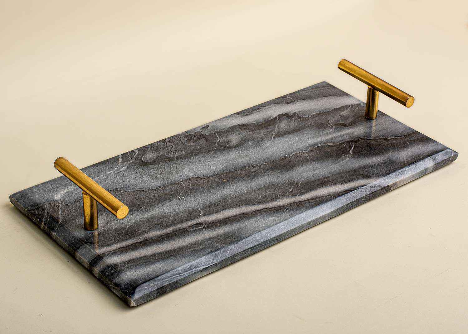 - Bold bevelled edges coupled with minimal T handles finished in brass - Made of Grey Levanto marble - Use as a serving tray for your next dinner spread, or even as an organizer in your vanity or bathroom