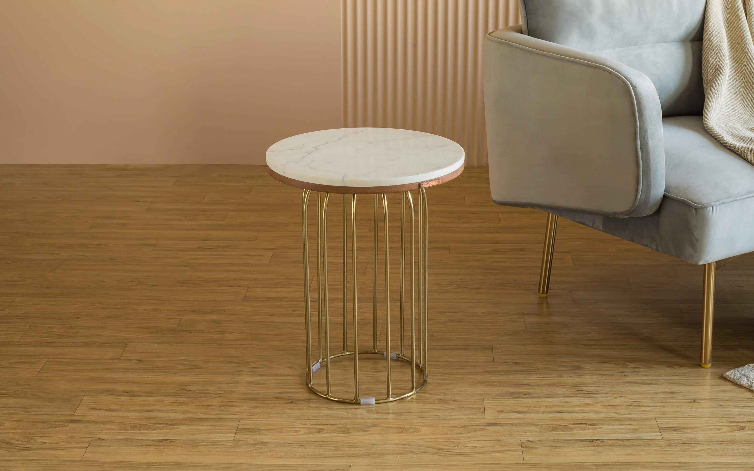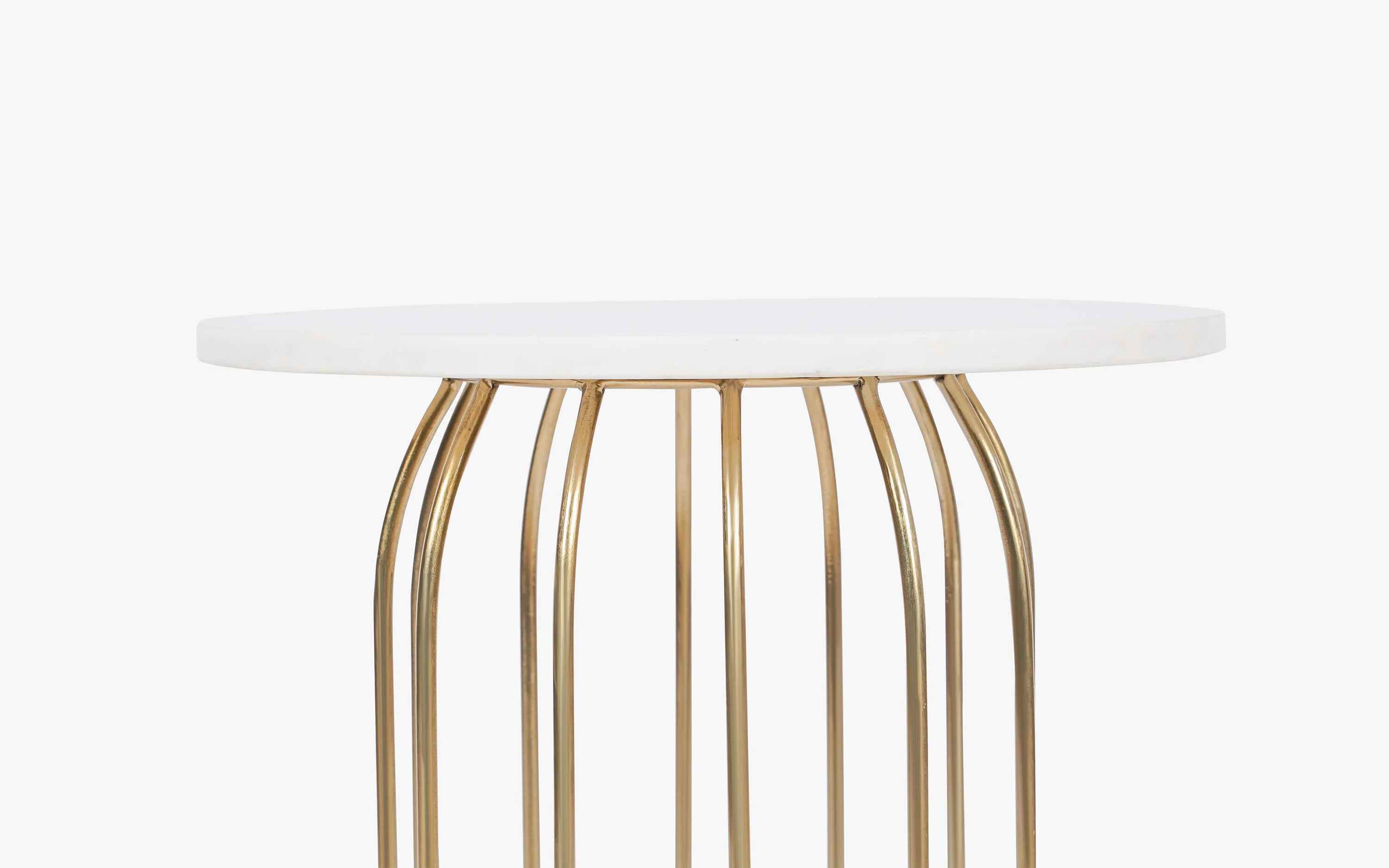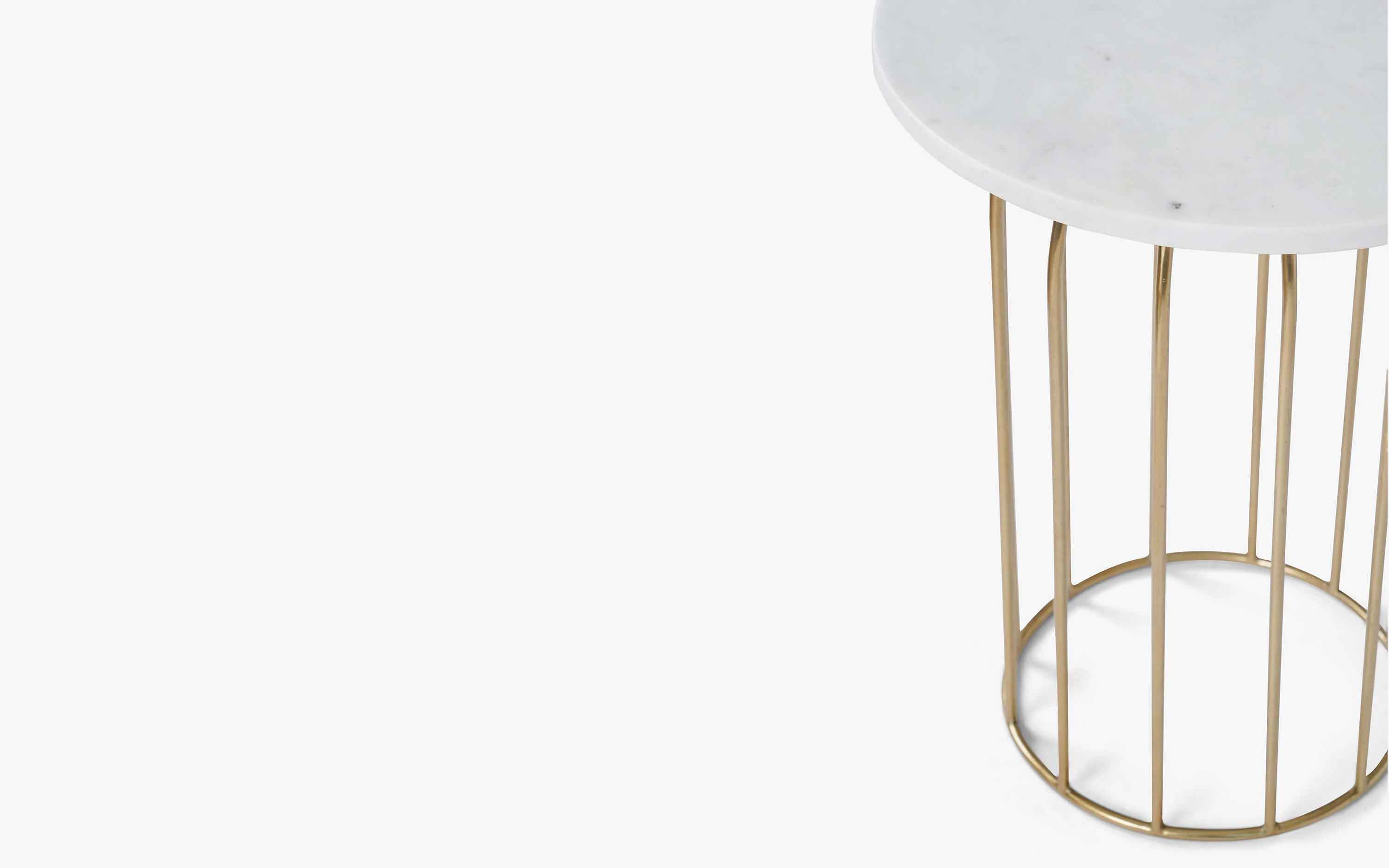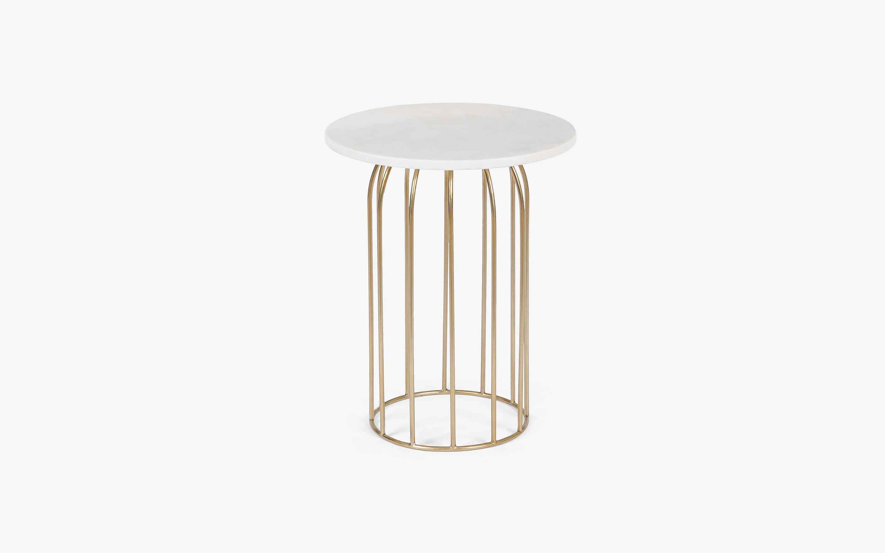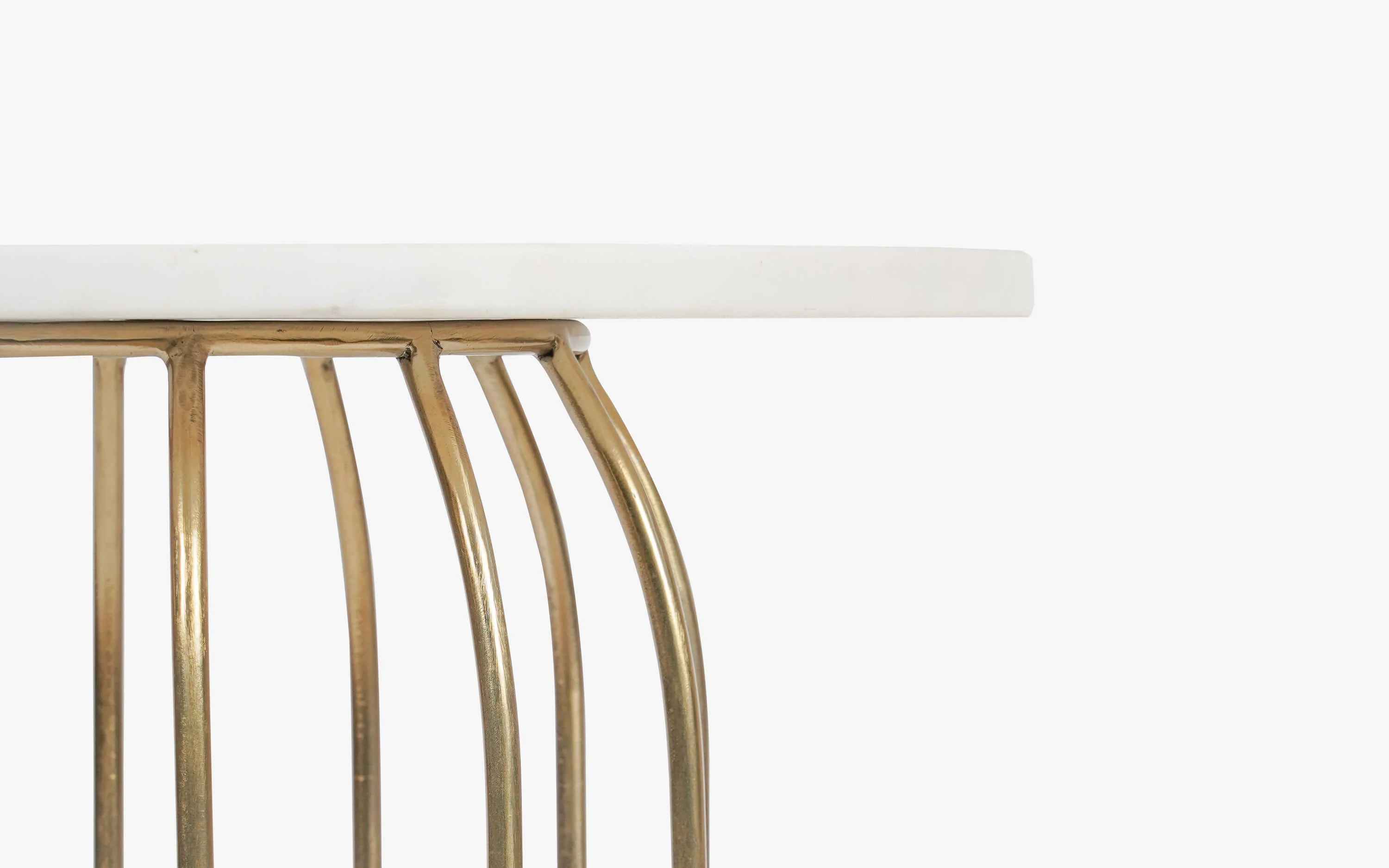 Marina Side Table has hand-welded spokes of gold-finished iron wire . The curved sculptural base is topped with a white Banswara marble to add to the contemporary feel. Due to the characteristics of natural marble and the handcrafted process, each table is unique. No harmful chemicals or toxins are used in our furniture. Natural eco-friendly lacquers are used that helps in sustaining a healthy lifestyle. "Depending on your screen settings and resolution on your device there may be a slight variance in fabric color and wood polish of the image and actual product. Wood grains will vary from product to product in case of solid wood furniture."