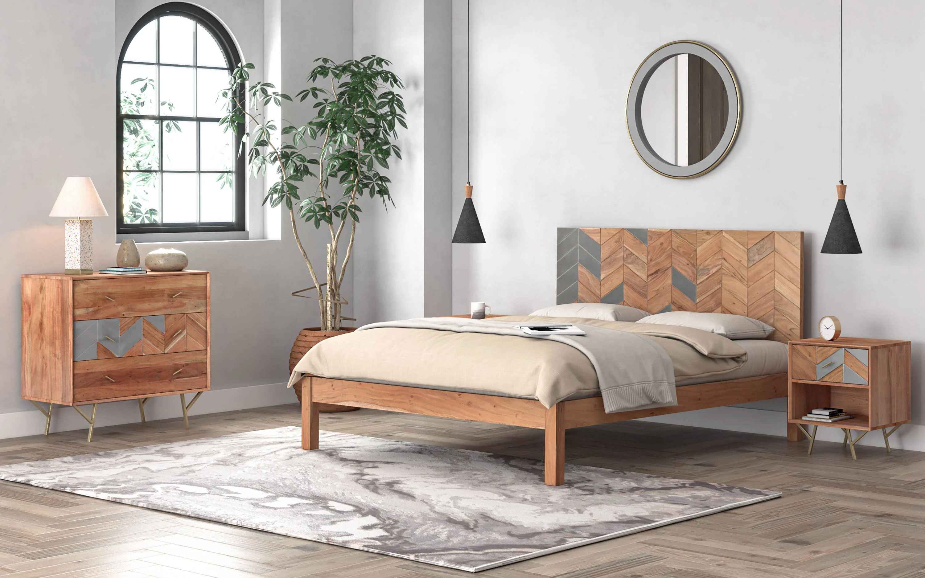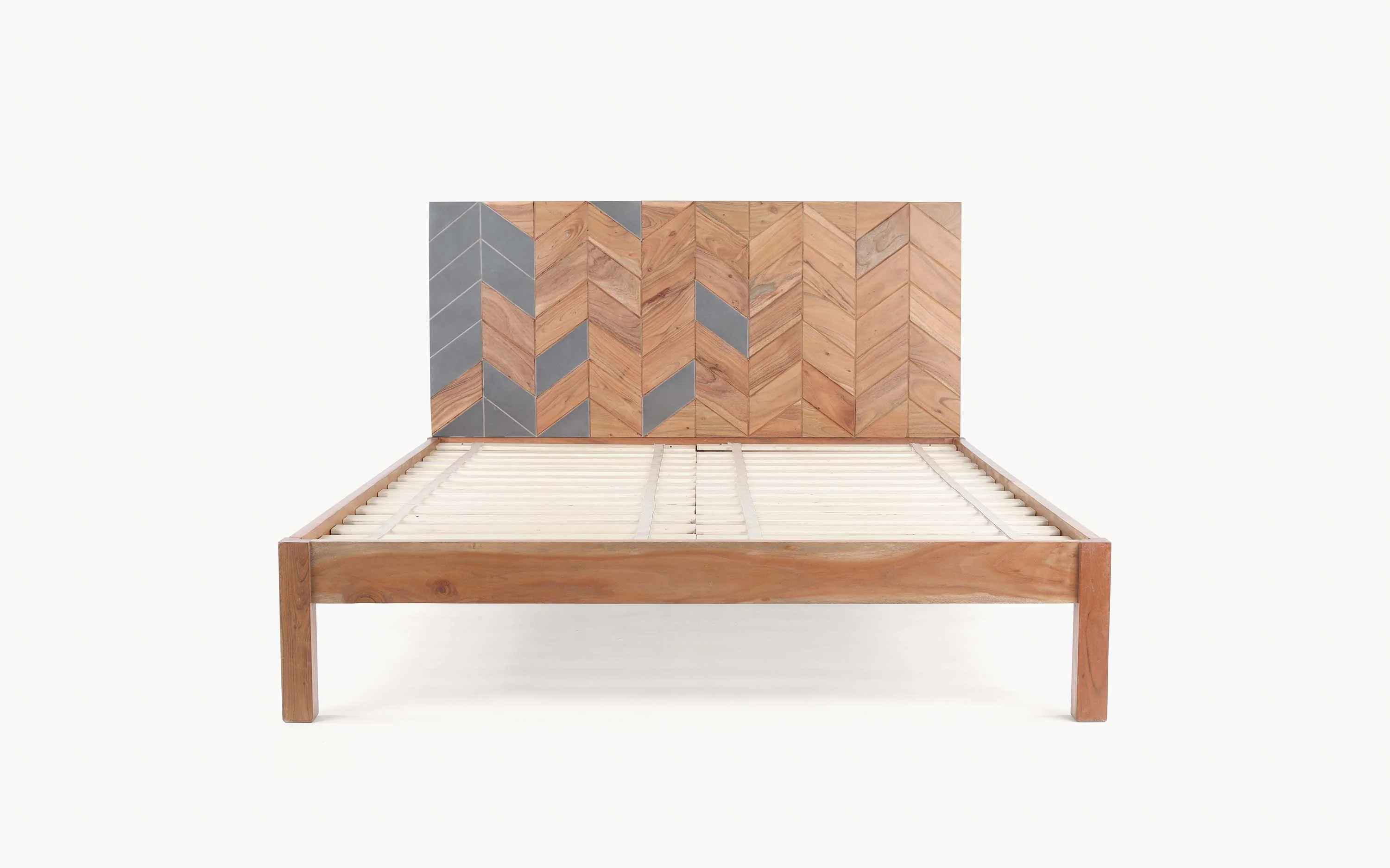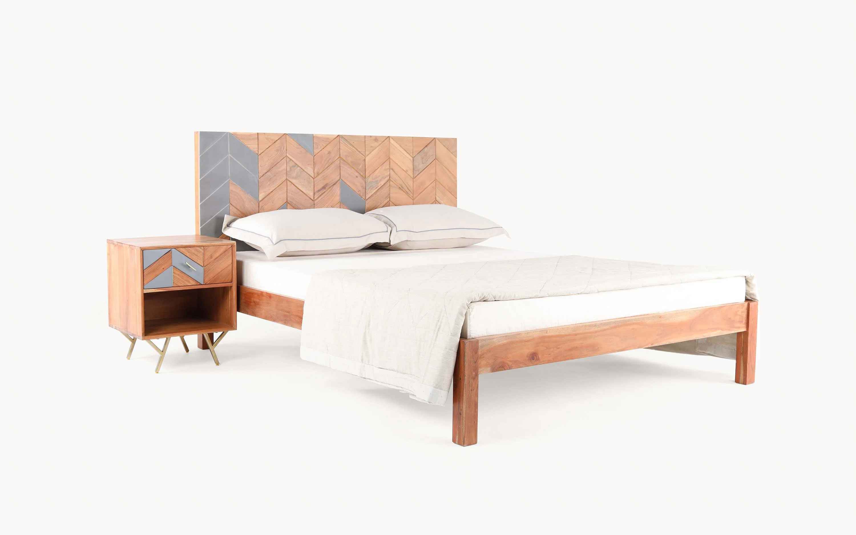 Mazi collection picks up one of the most raw textures or materials used in building, cement and turns it 180 degrees and converts it into the essence of this unique urban chique collection. Acacia wood with Autumn Brown finish along with cement inlay stands on metal legs with gold finish. We aimed at creating a new blend with this collection. No harmful chemicals or toxins are used in our furniture. Natural eco-friendly lacquers are used that helps in sustaining a healthy lifestyle. The headboard of this collection is interchangeable and can be replaced with other headboards we offer. Easy to assemble. "Depending on your screen settings and resolution on your device there may be a slight variance in fabric color and wood polish of the image and actual product. Wood grains will vary from product to product in case of solid wood furniture."