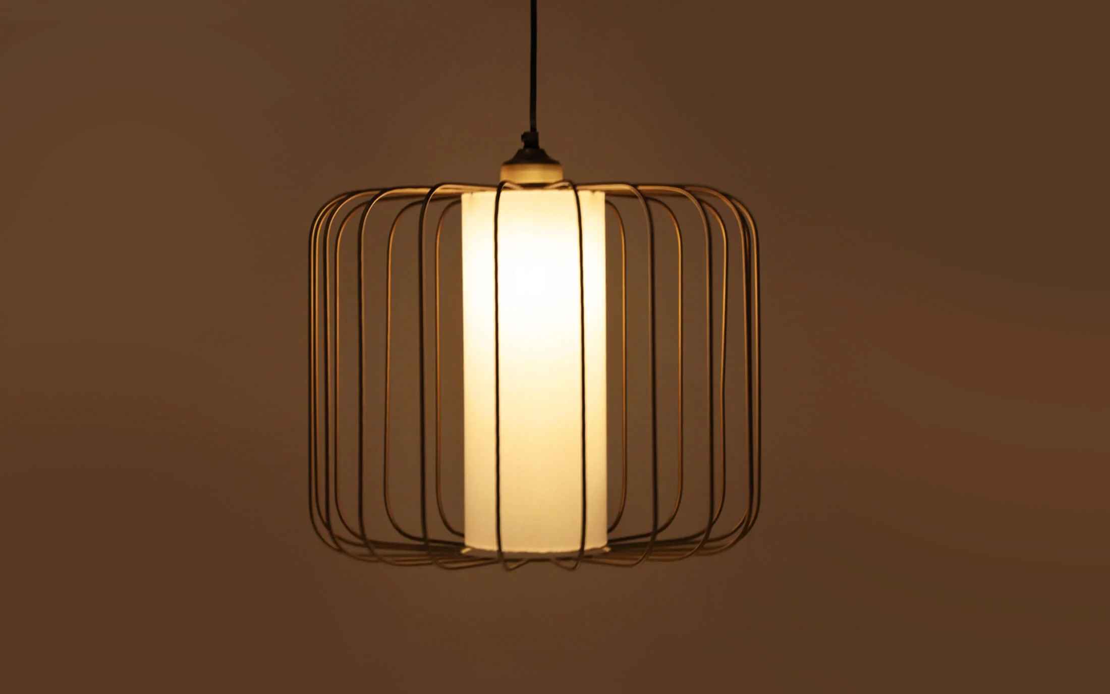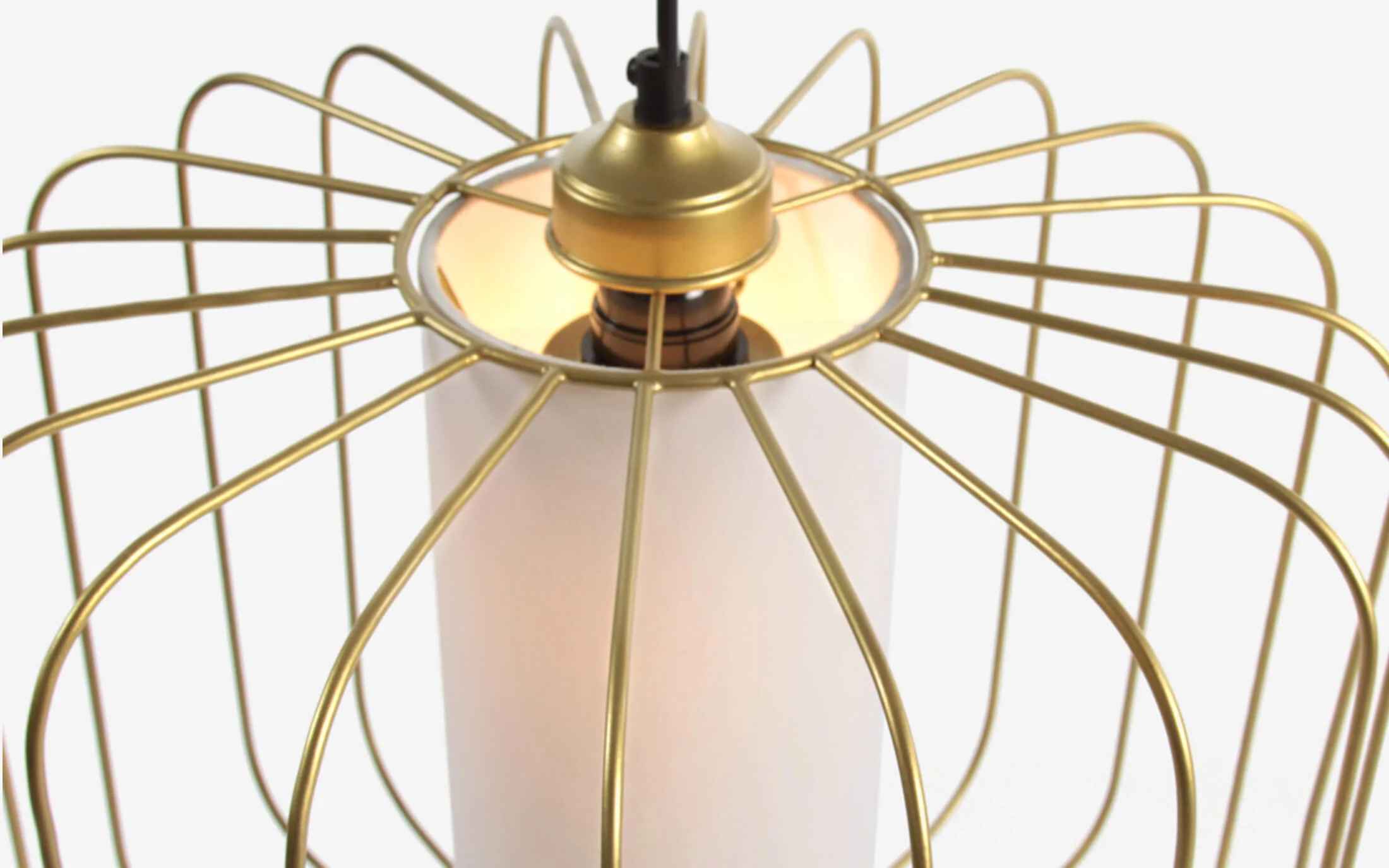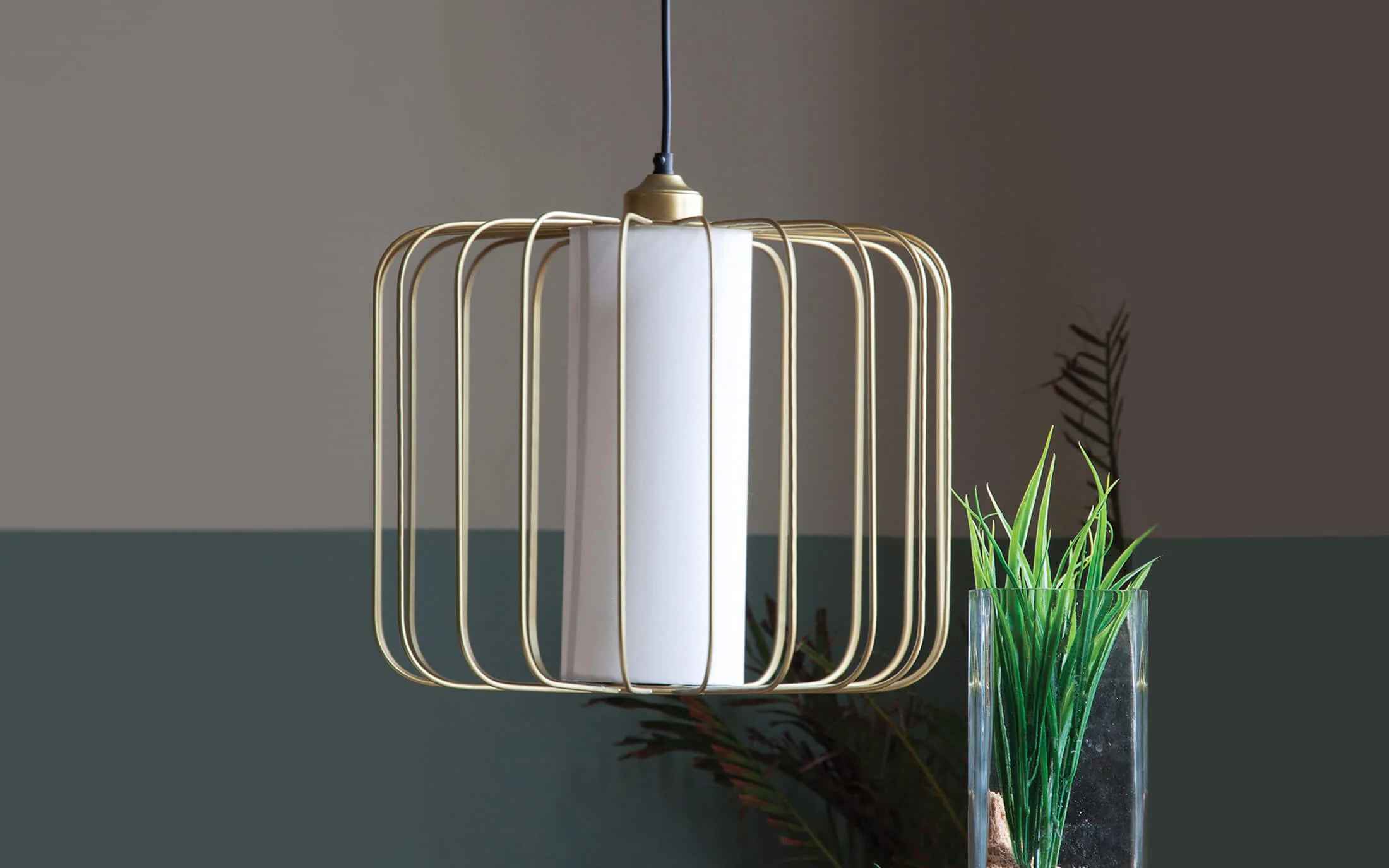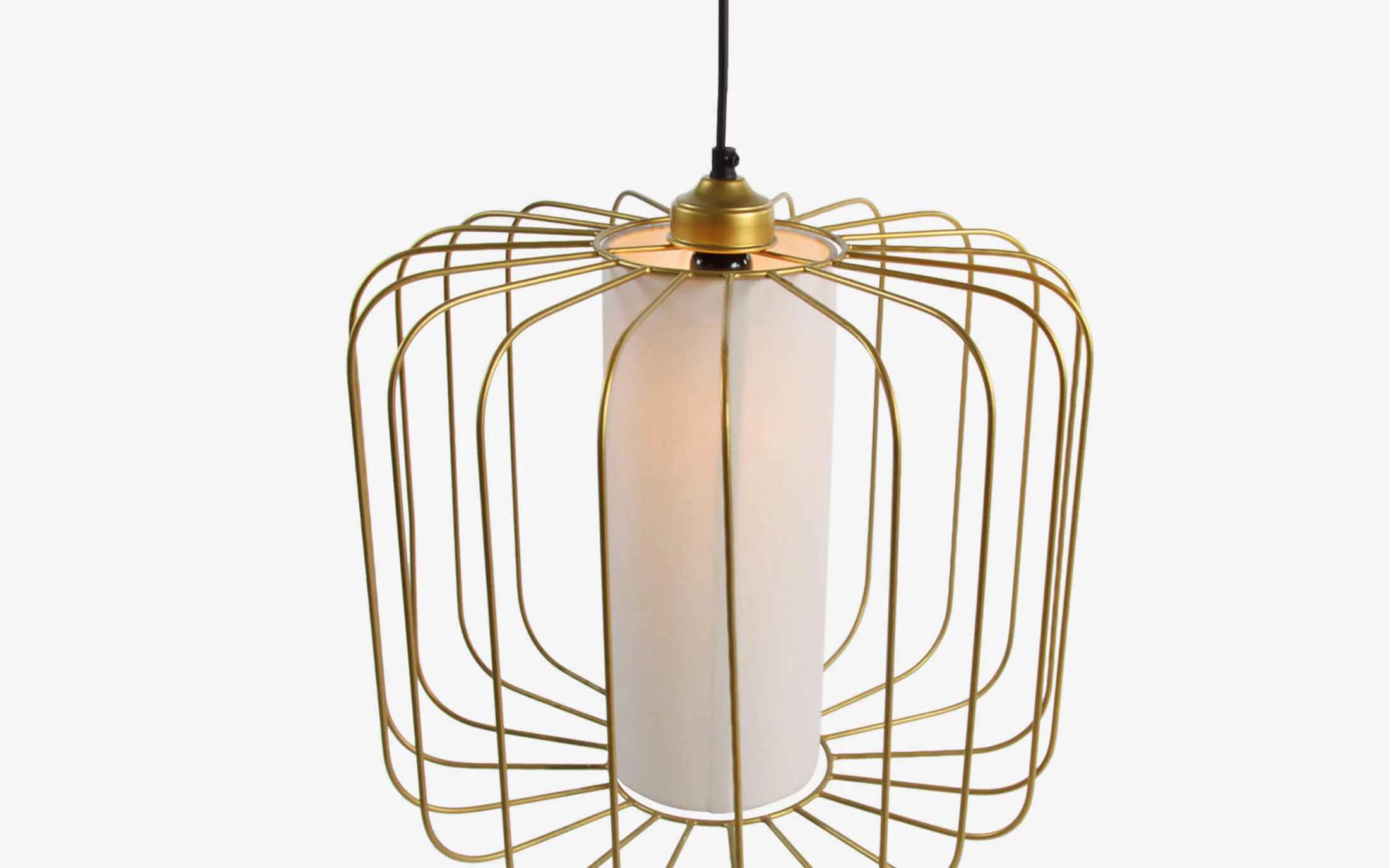 The Merriam gold hanging lamp effortlessly introduces dimension, style and character into any space. Placed inside a copper coloured steel wire frame is a lovely off white cylindrical shade made of silk. Introduce a touch of glamour to your home with this Merriam Hanging Lamp. The sleek, gold-finished iron frame is accented with an elegant off-white cotton shade, making it the perfect addition to any room. Whether you hang it in your living room, dining room, or bedroom, this lamp is sure to make a statement. "Depending on your screen settings and resolution on your device there may be a slight variance in fabric color and wood polish of the image and actual product. Wood grains will vary from product to product in case of solid wood furniture."