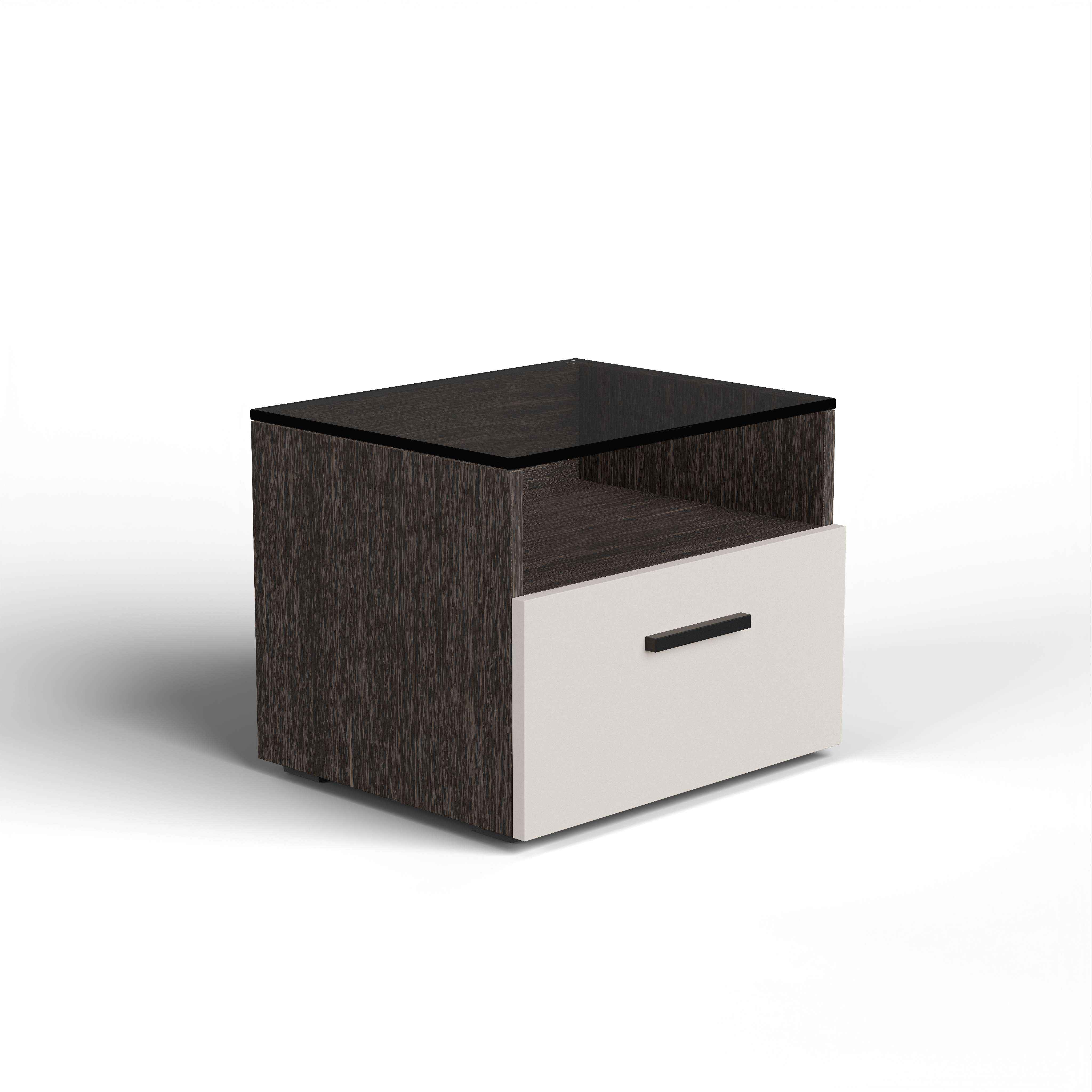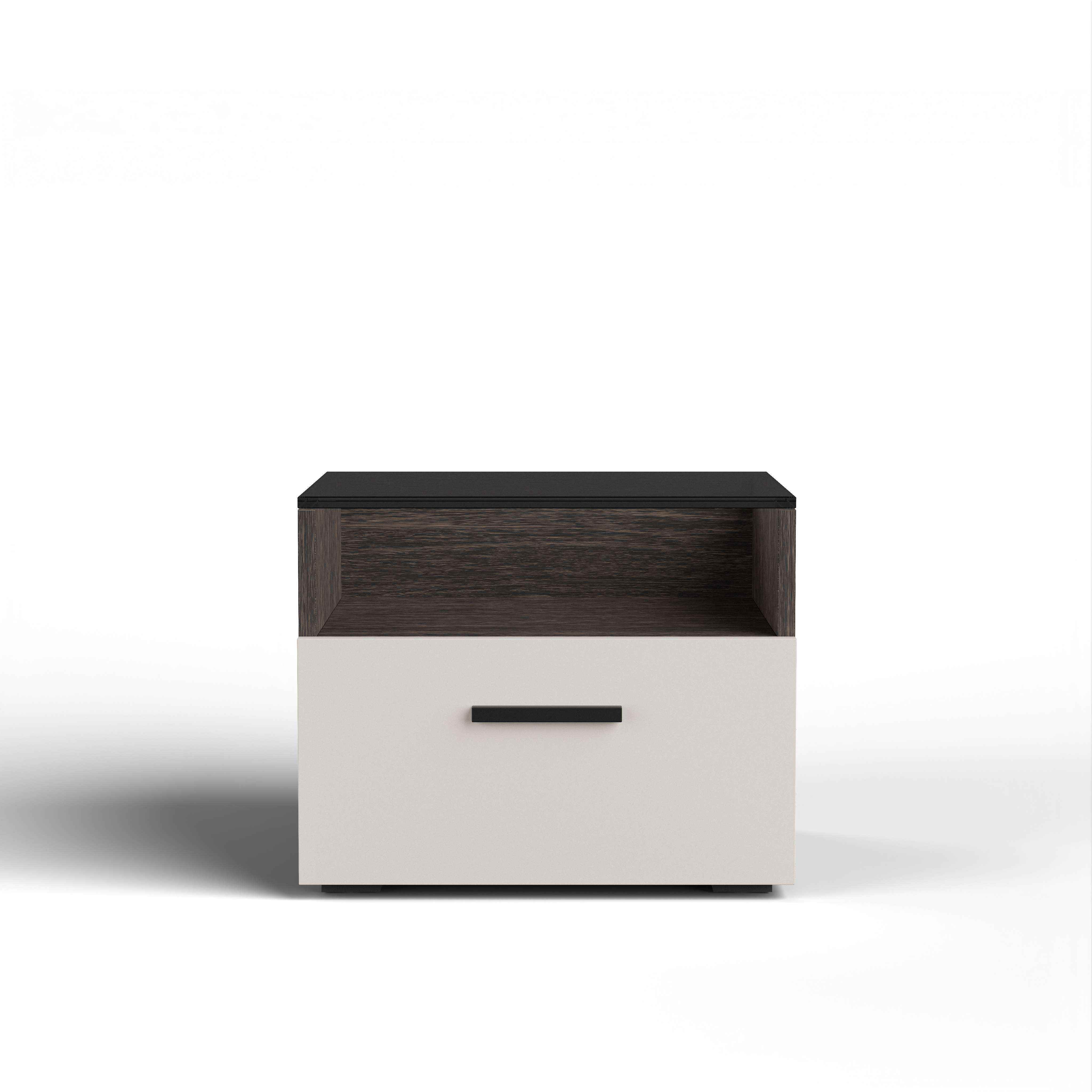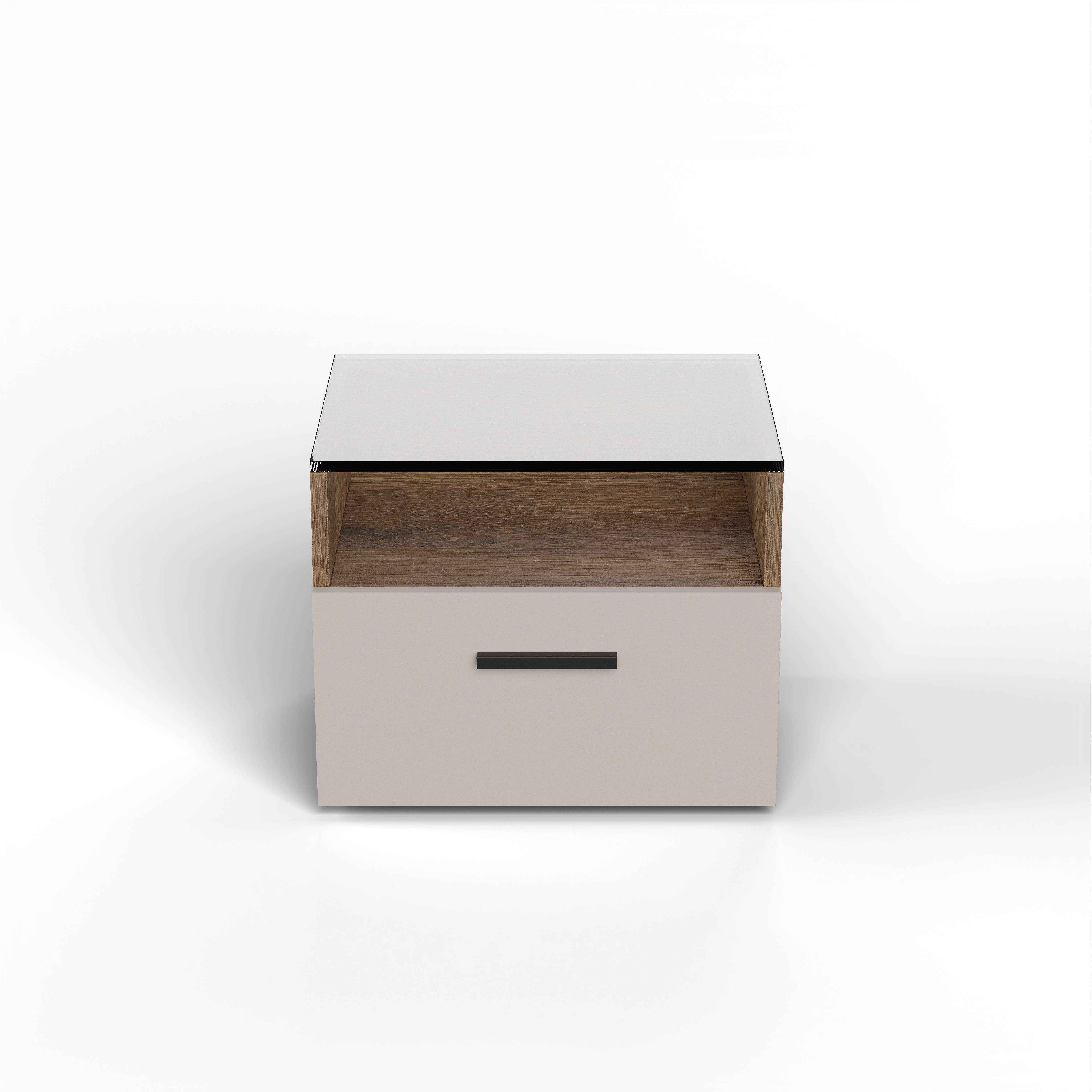 Brown Oak Post-Laminated Plywood Carcass; Champagne Post-Laminated Plywood Drawer Fascia; Black Powdercoat Mild Steel Handle; Irish Cream Post-Laminated Plywood Carcass