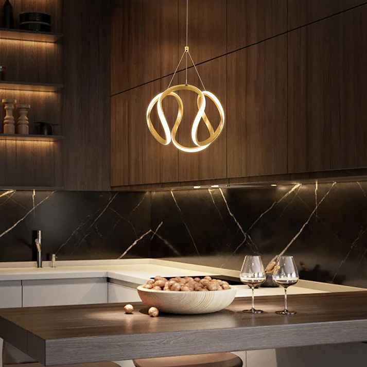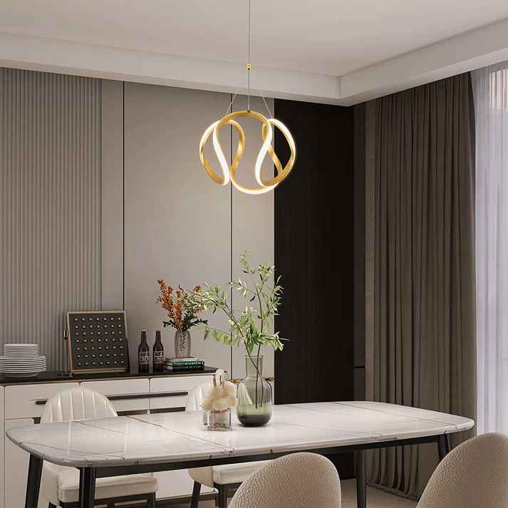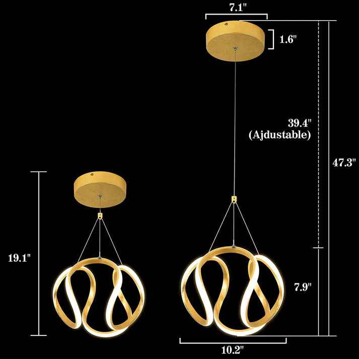 Luxury Design:The LED pendant light is a knotted circle that looks very designer. It is made of aluminum metal, which has the characteristics of corrosion resistance, high temperature resistance and not easy to deform. The platinum look makes it look luxurious. It's perfect for decorating your house. Easy To Install:All the mounting hardware is included in the package, and you can quickly install it according to the instructions. The entire installation process takes less time and is easy to operate. Energy -Saving:This chanderlier integrated LED light does not need bulbs, which enables you to save a lot of electricity costs when you use it. Its color temperature is 3000K (warm white).This modern and minimalist new ceiling light is an ideal remodel of an old style pendant light.The LED has a long life, bright and soft, and protects the eyes. Wide Application:The string length of gold pendant light can be adjusted as your demand, perfectly fit any height of your ceiling. Perfect for for kitchen island living dining room bedroom entrance hall foyer