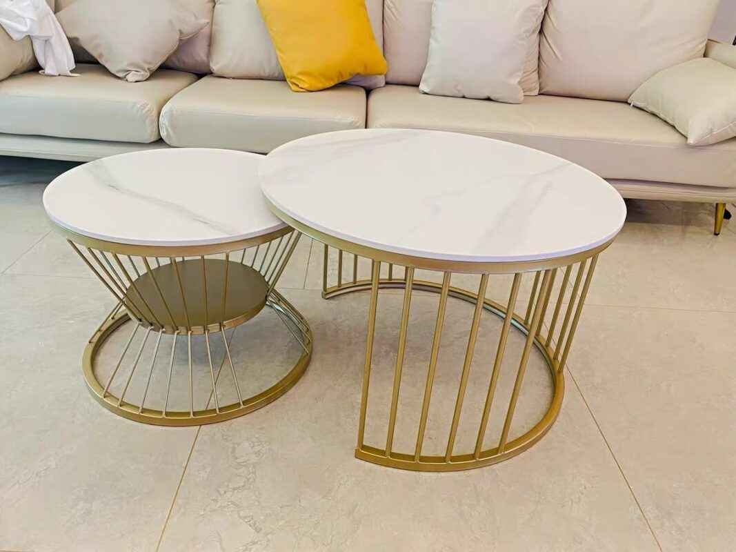 Nested Geometric Side Tables: The Pandora Nesting table Set effortlessly combines fashion and function, creating a charming coffee table set that adds a modern and chic touch to any living space. The sleek stone top provides a beautiful contrast to the gold metal finish on the base. The tables are different in height, which adds depth and dimension to the space. The smaller table includes a handy shelf for organizing and storing books, snacks, blankets, and other miscellaneous items. The nesting design of the tables is flexible and practical, allowing you to use each unit separately or together and conveniently store them under the larger table. This coffee table set is versatile and distinctive, making it the ideal finishing touch to complement