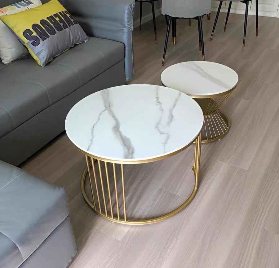 Nested Geometric Side Tables: The Pandora Nesting table Set effortlessly combines fashion and function, creating a charming coffee table set that adds a modern and chic touch to any living space. The sleek stone top provides a beautiful contrast to the gold metal finish on the base. The tables are different in height, which adds depth and dimension to the space. The smaller table includes a handy shelf for organizing and storing books, snacks, blankets, and other miscellaneous items. The nesting design of the tables is flexible and practical, allowing you to use each unit separately or together and conveniently store them under the larger table. This coffee table set is versatile and distinctive, making it the ideal finishing touch to complement