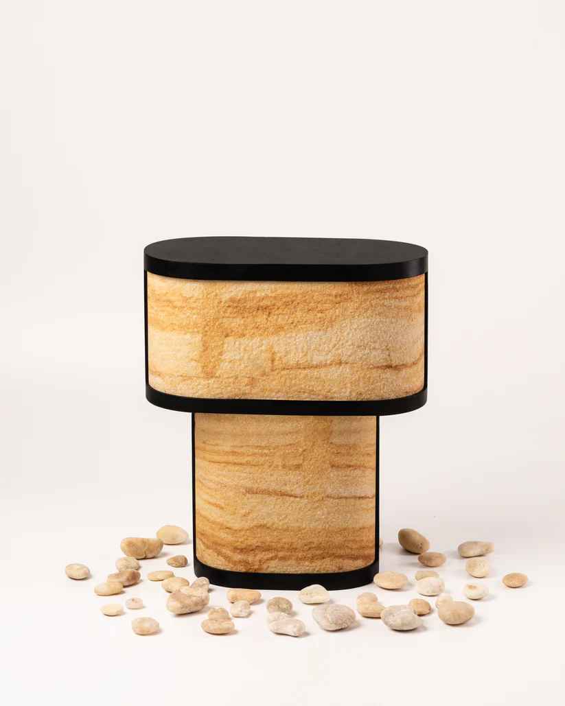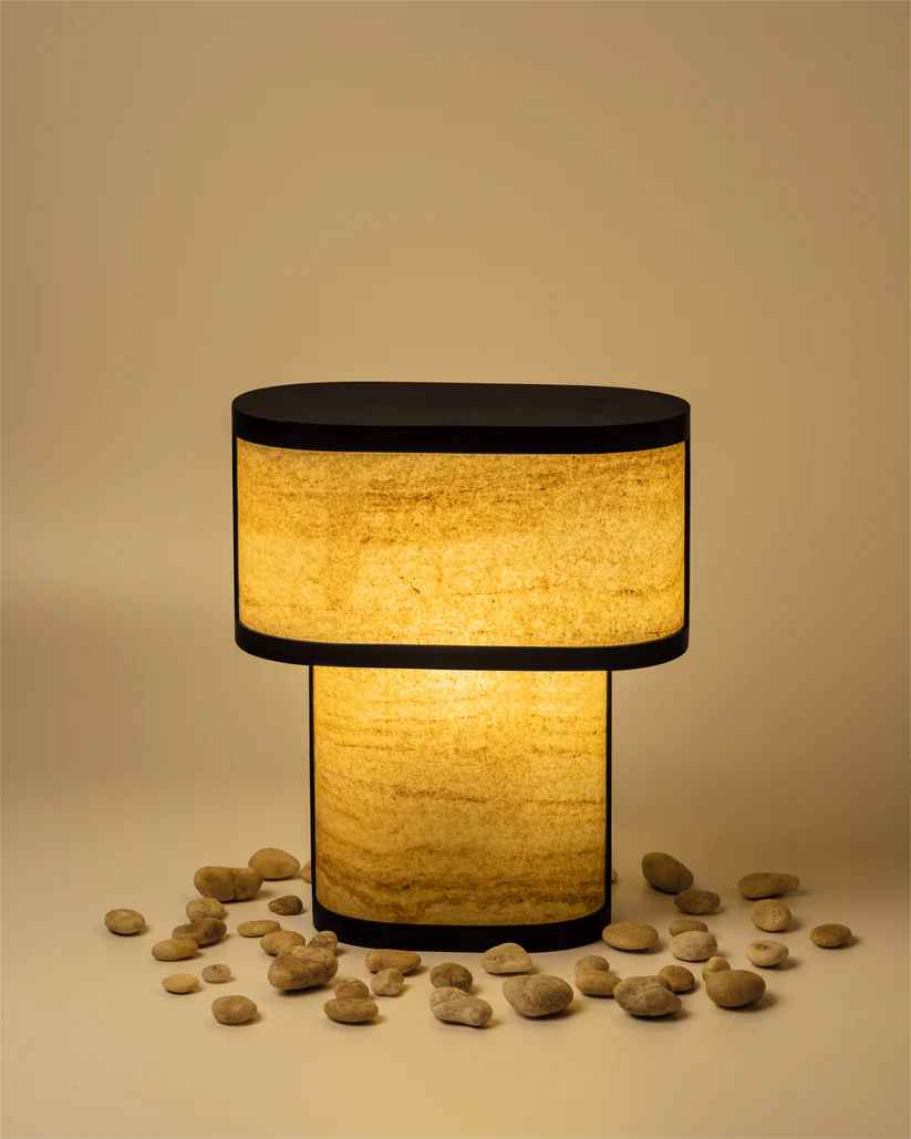 Niko Table Lamp by by Name Place Animal Thing ® (Furniture & Lights) Presenting the NIKO table lamp from the Quarry Collection, a sublime fusion of elegance, warmth, and minimalism. Crafted from thin layered natural teakwood sandstone sheet (extracted from Indian quarries), the beautiful brown veins mimic teakwood, adding a lot of character and texture to your space. The capsule form of the table lamp is meticulously hand-fabricated using mild steel with a grainy powder-coated texture that complements the tactile nature of the teakwood stone sheet. The lamp not only emits a warm glow, enhancing the alluring veins when it's dark, but also exudes its charm when not lit.