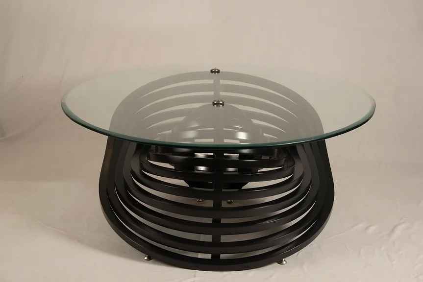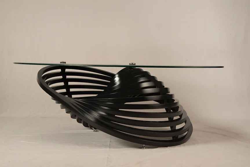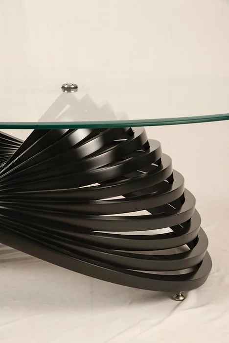 A layered elliptical table designed by Ecuadorian firm SEG MOBILIARIO, Its dynamic composition is the perfect combination between computational design, digital fabrication and artisan assembly. A layered composition of 12 eliptical sections in Medium-density fibreboard (MDF), finished with Polyurethane matt finish paint Stainless steel glass fittings Toughened clear glass (10mm thickness) Adjustable leveling foot Cleaning instructions: Clean the surface with lint free cloth Suitable for Indoors