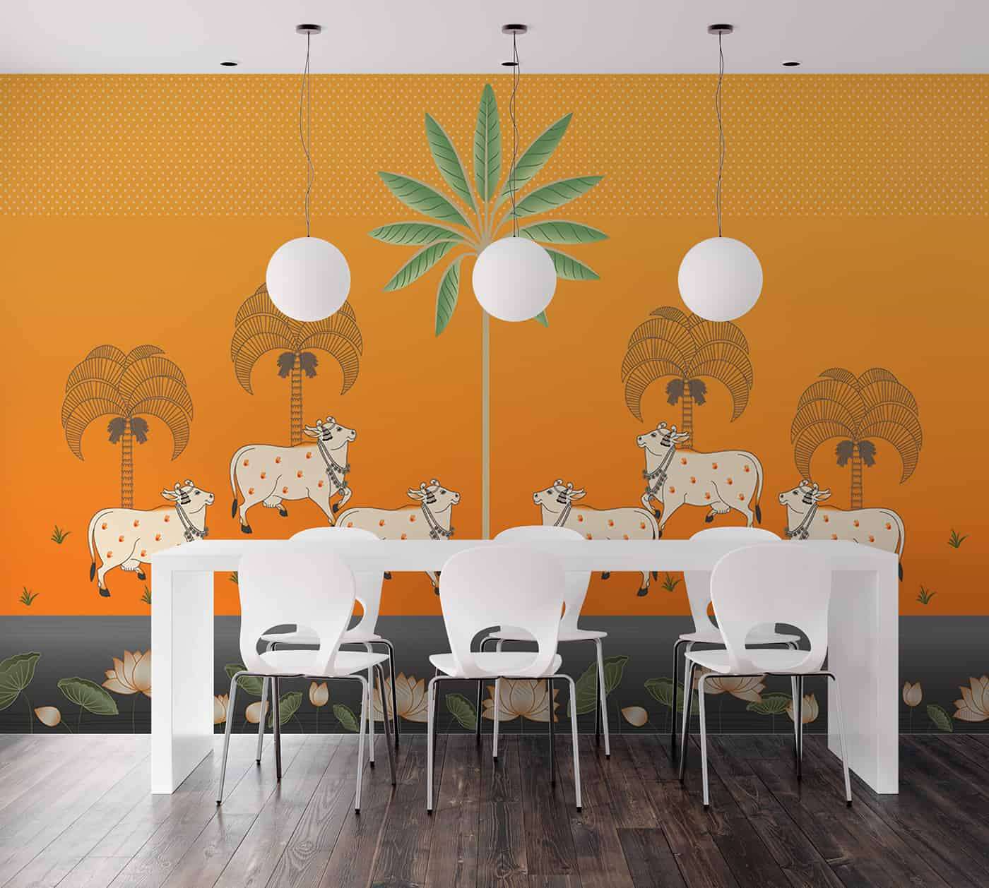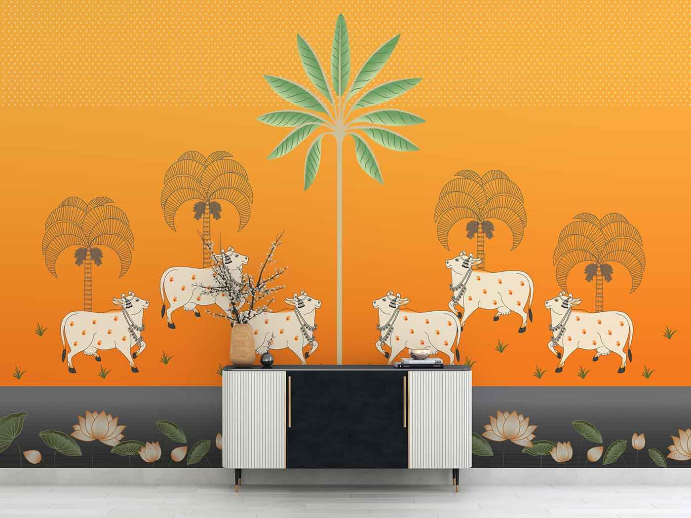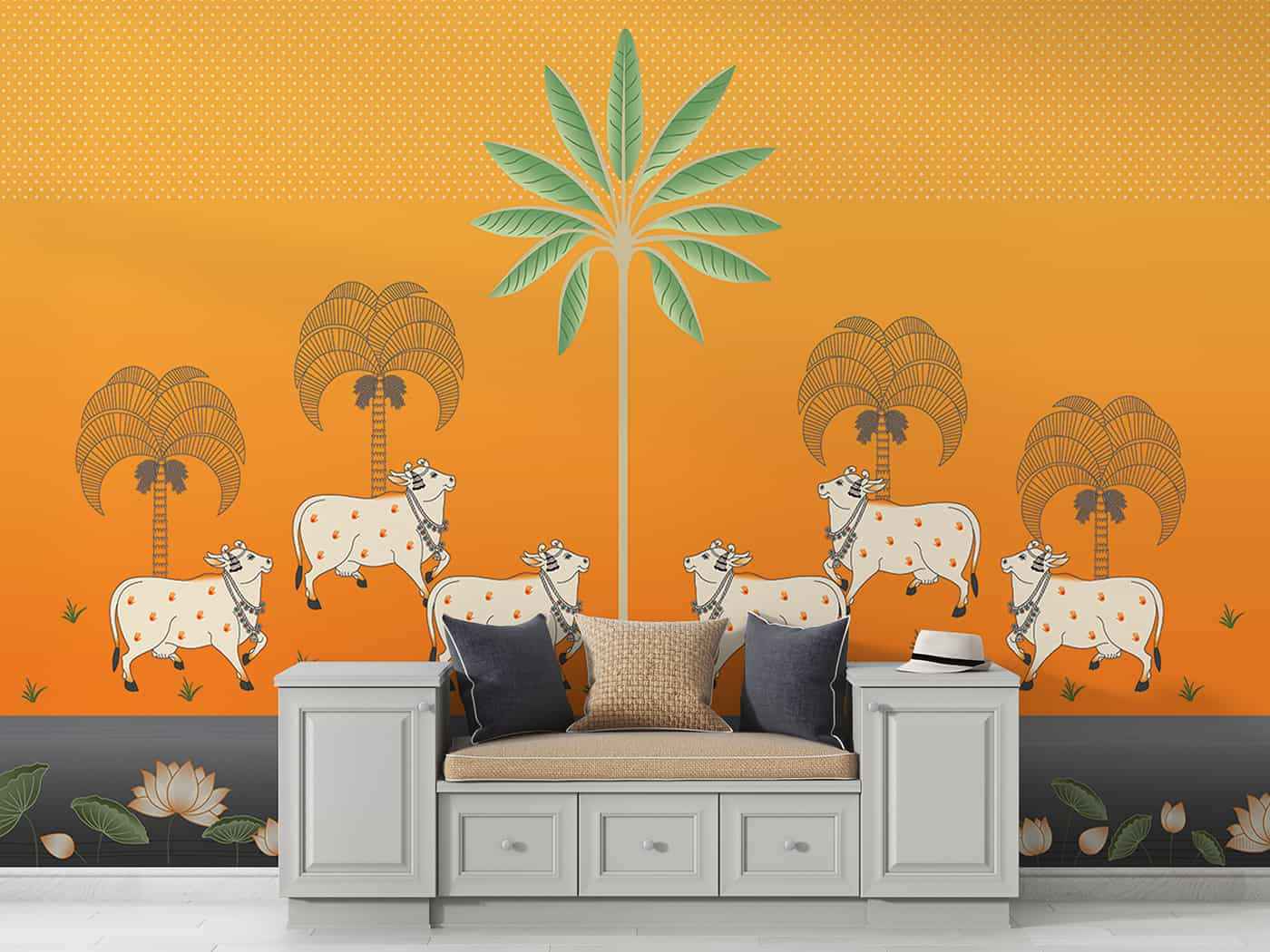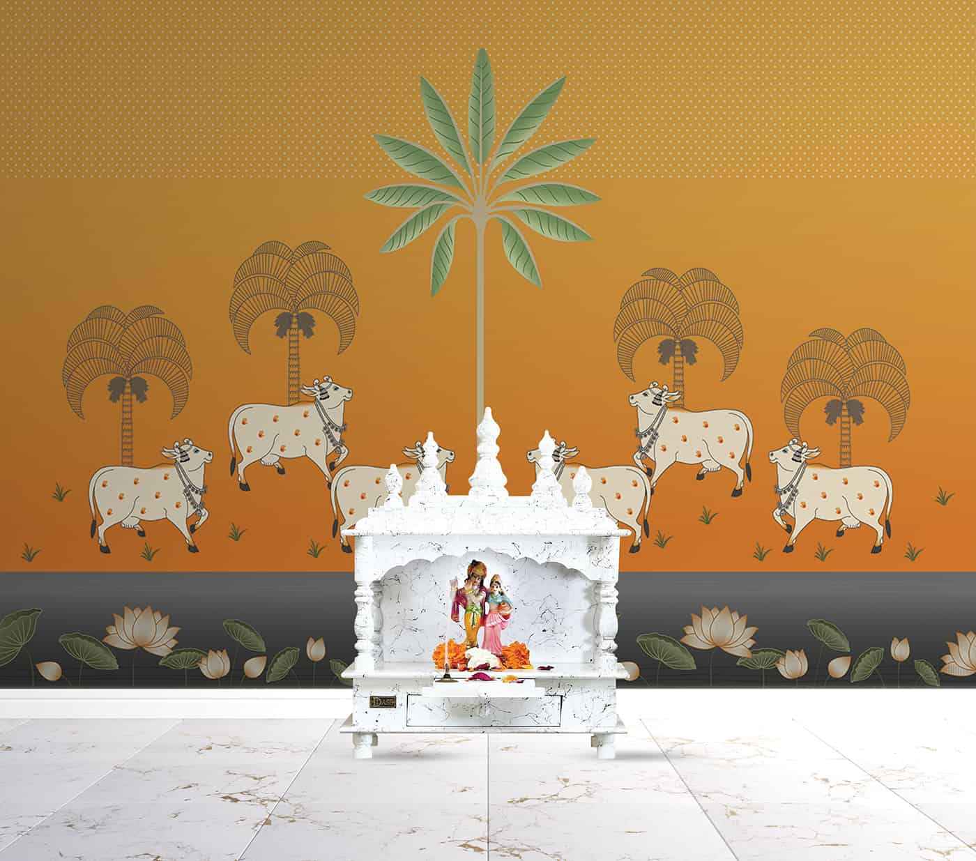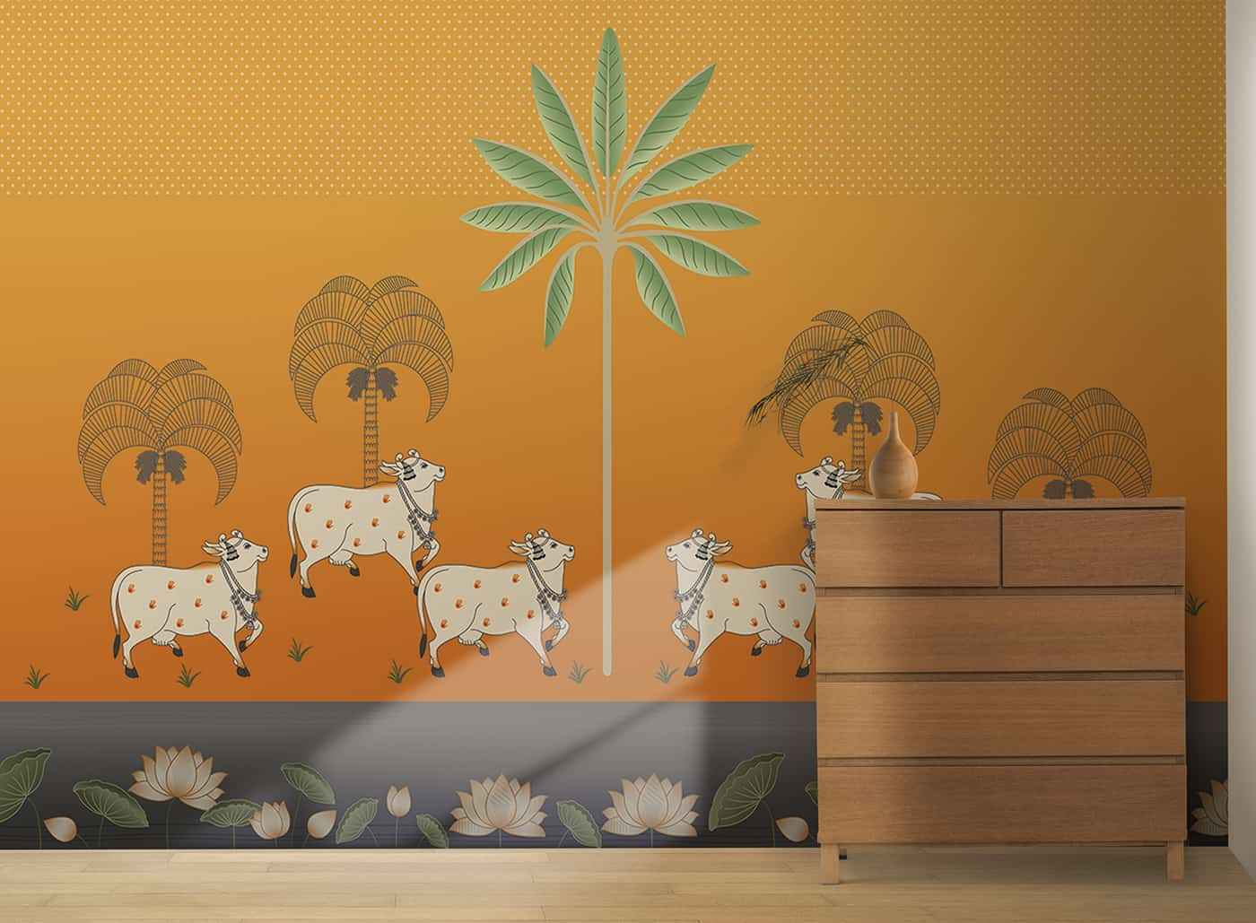 Pichwai or Pichvai is a style of painting that originated over 400 years ago, in the town of Nathdwara near Udiapur, India.The word Pichwai comes from 'pichh' meaning back, and 'wai', meaning textile hanging. Originally, pichwai paintings were used to decorate the temple of Krishna/Shrinathji in Nathdwara,Rajasthan, India. Intricate and visually appealing Pichwai paintings, originally made on cloth, were hung behind the deity to celebrate different seasons, festivals and events in Lord Krishna's life. The purpose of Pichwais other than artistic appeal is to narrate tales of Krishna to the illiterate. Over time, pichwais have found a place in the homes of art connoisseurs, owing to their visual appeal. We have put in efforts to recreate this dying art form and present it to the world. All our murals are custom-made to fit your wall?s dimensions and they are all supplied in panels. Every wallpaper mural we produce is unique to you. We don?t hold stock.