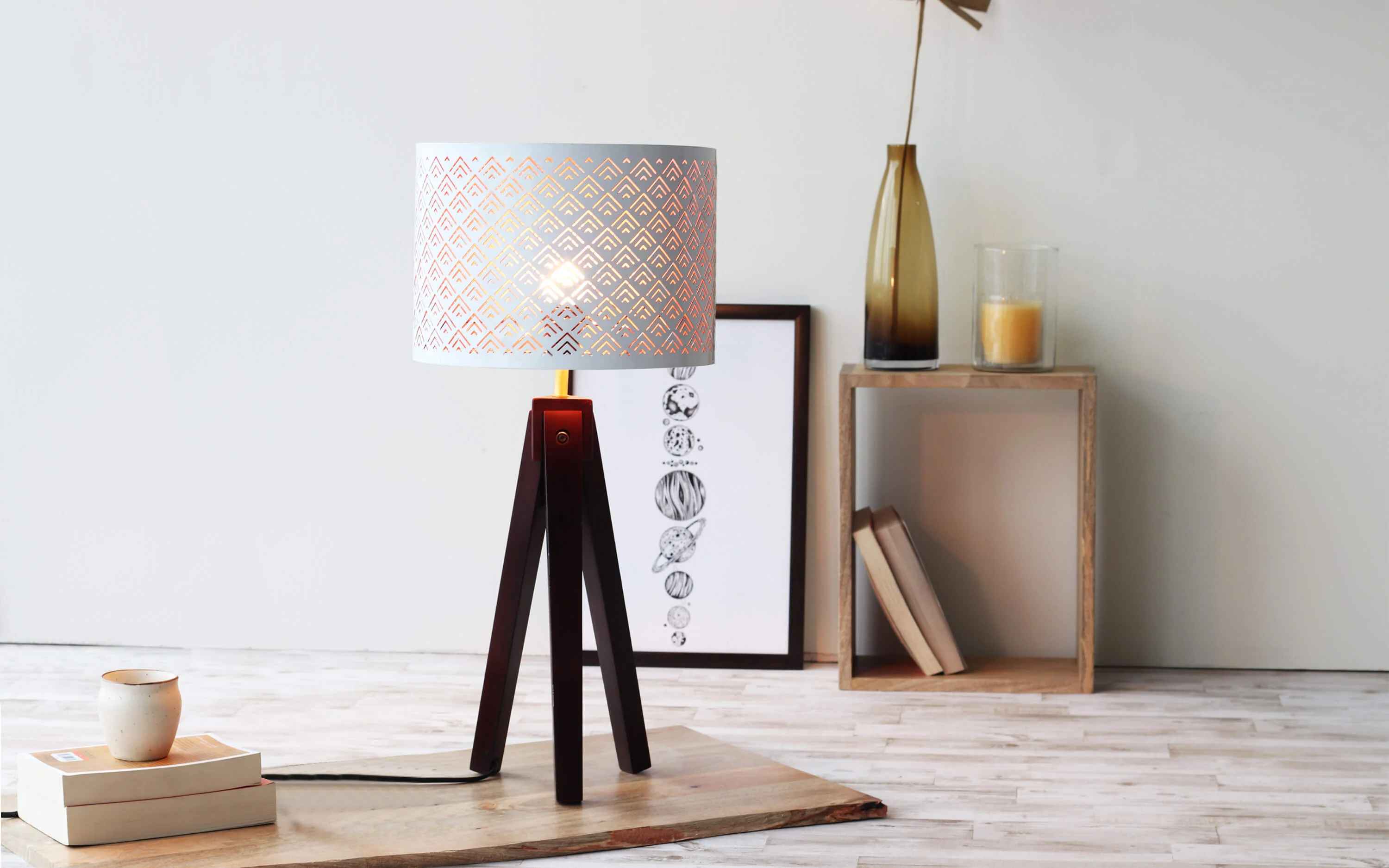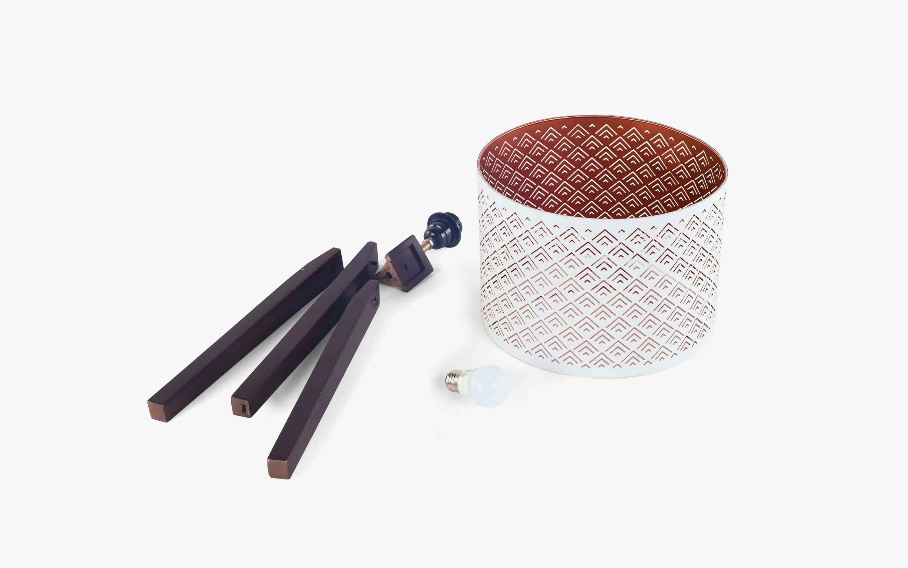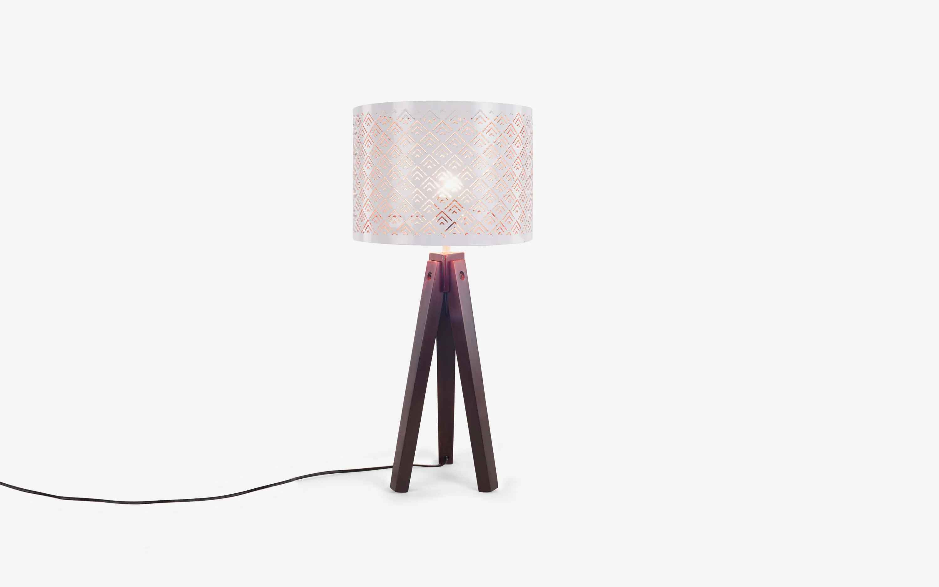 Pingle Table Lamp is a great table lamp, with base in walnut finished mango wood that can be totally flat pack. The shade is metal intricately etched, adding texture to the overall product.