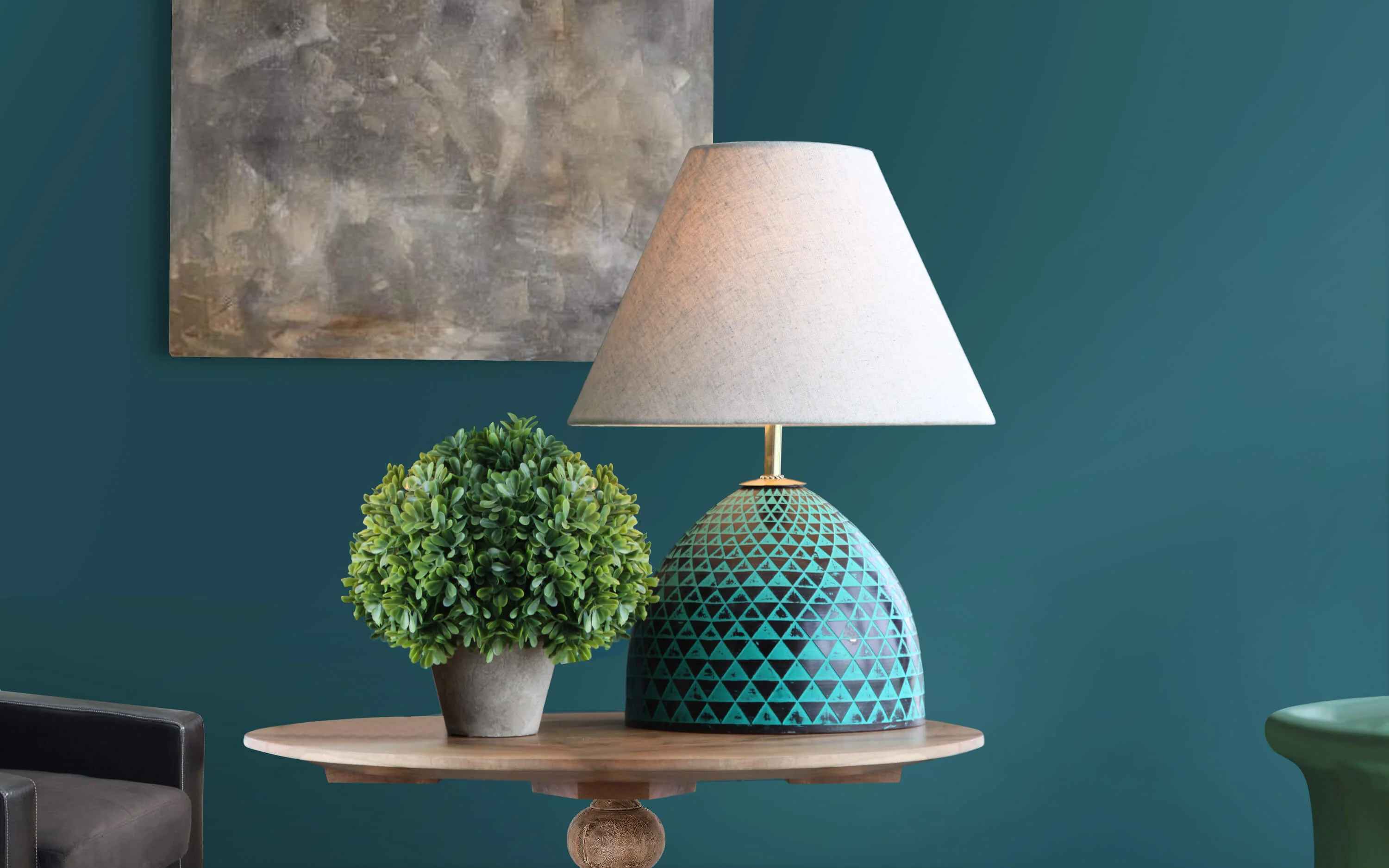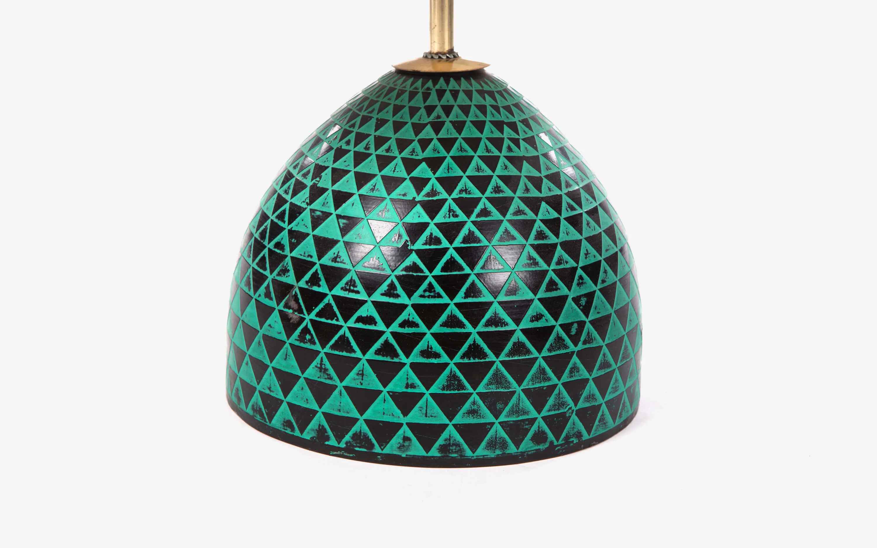 Inspired from the triangular tessellations on the façade of Esplanade, Singapore, the array of triangles forms the base of the Plato collection. The pattern looks beautiful from all angles and are done in contrasting Green and Black colour to highlight light and shade play over the building. Pair it with the matching table lamp, study table lamp,cluster hanging lamp, mirror and wall decor for a coordinated look. "Finish may vary as picture appears on website as the finish is created manually" "Depending on your screen settings and resolution on your device there may be a slight variance in fabric color and wood polish of the image and actual product. Wood grains will vary from product to product in case of solid wood furniture."