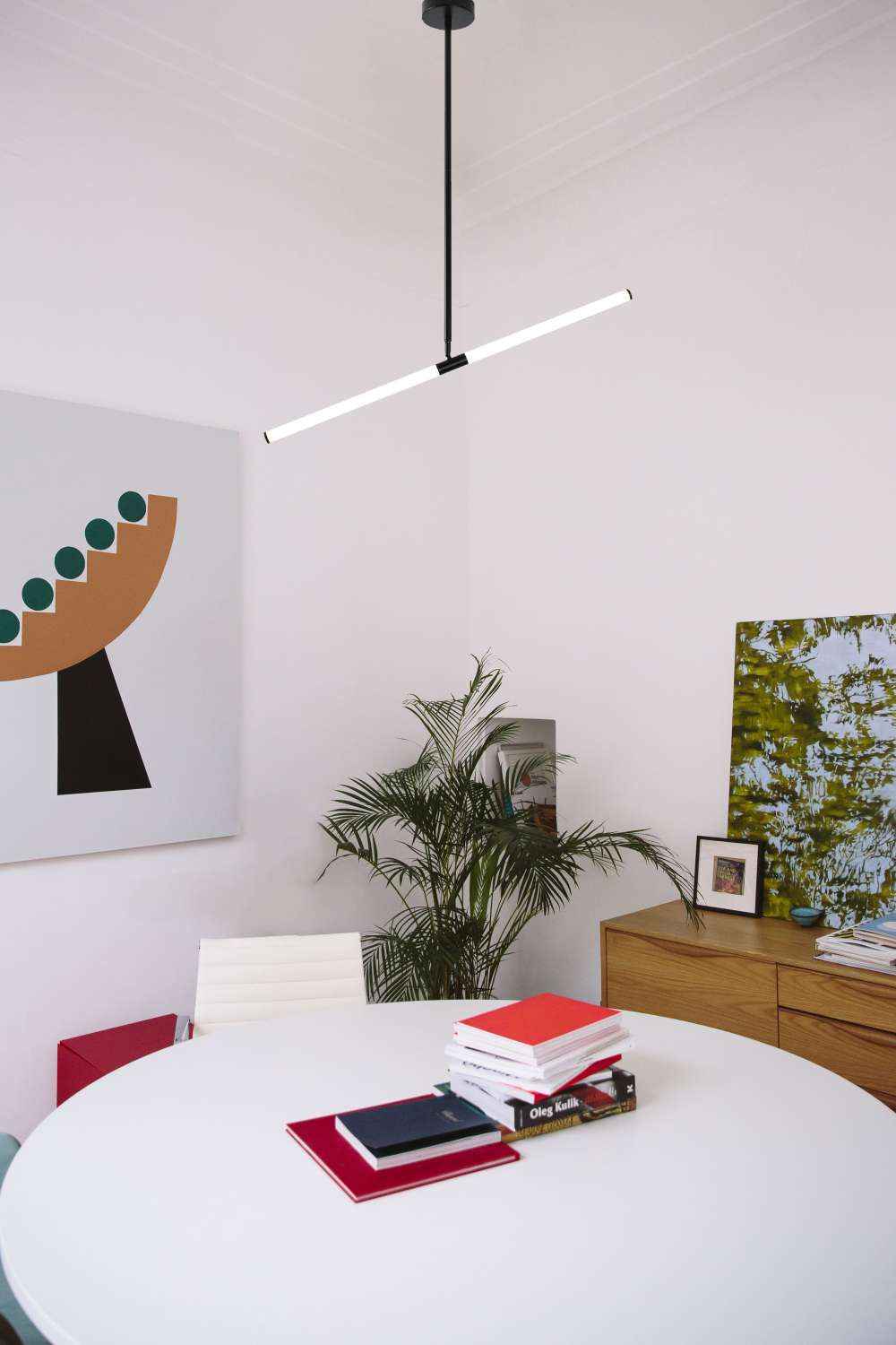 A vision of the dynamic geometry and minimalism, this light showcases the best of modern, sophisticated lighting. The base intersects with a vertical plane and is suspended by very sleek vertical rod; giving it a balanced and aesthetically pleasing look.