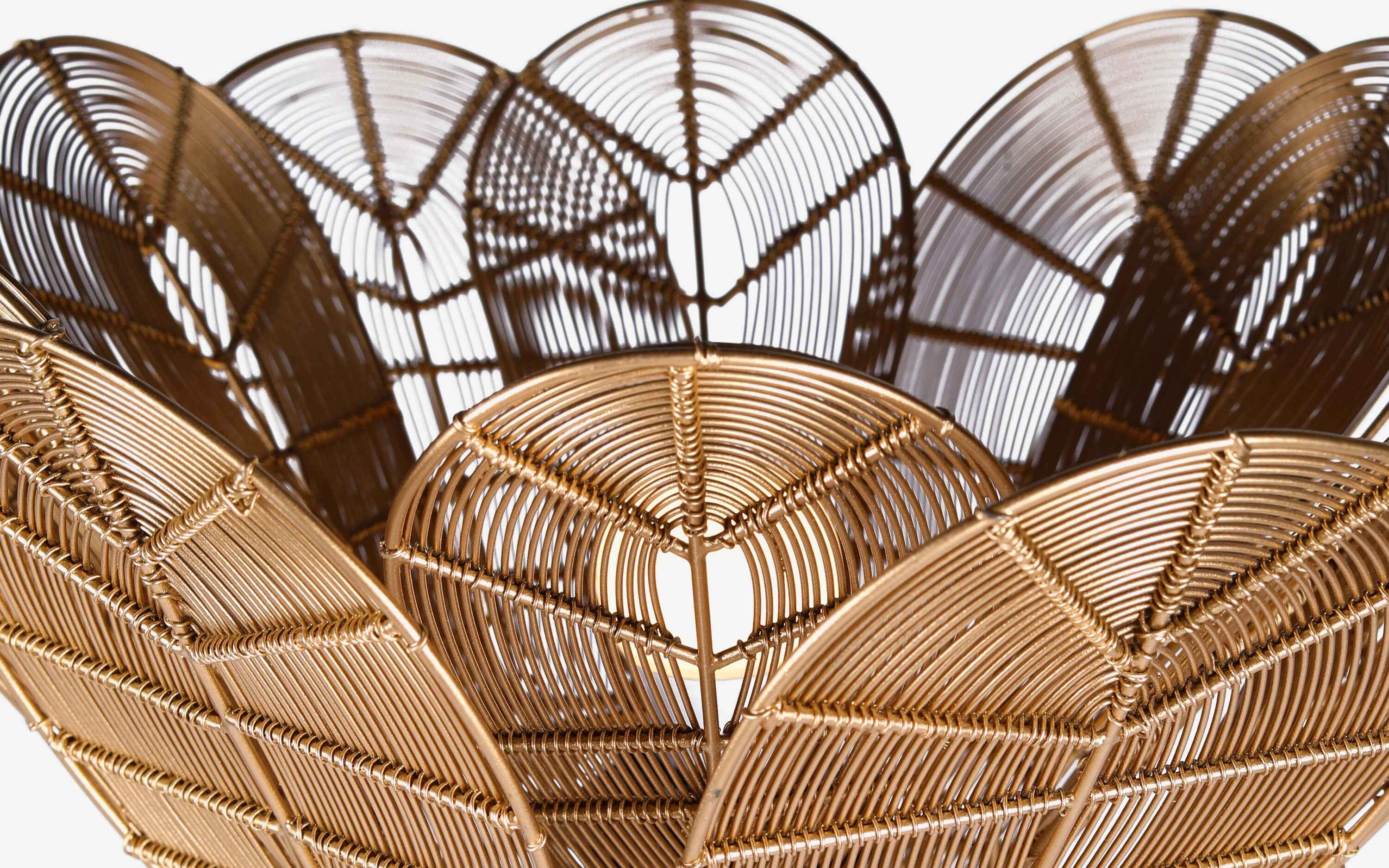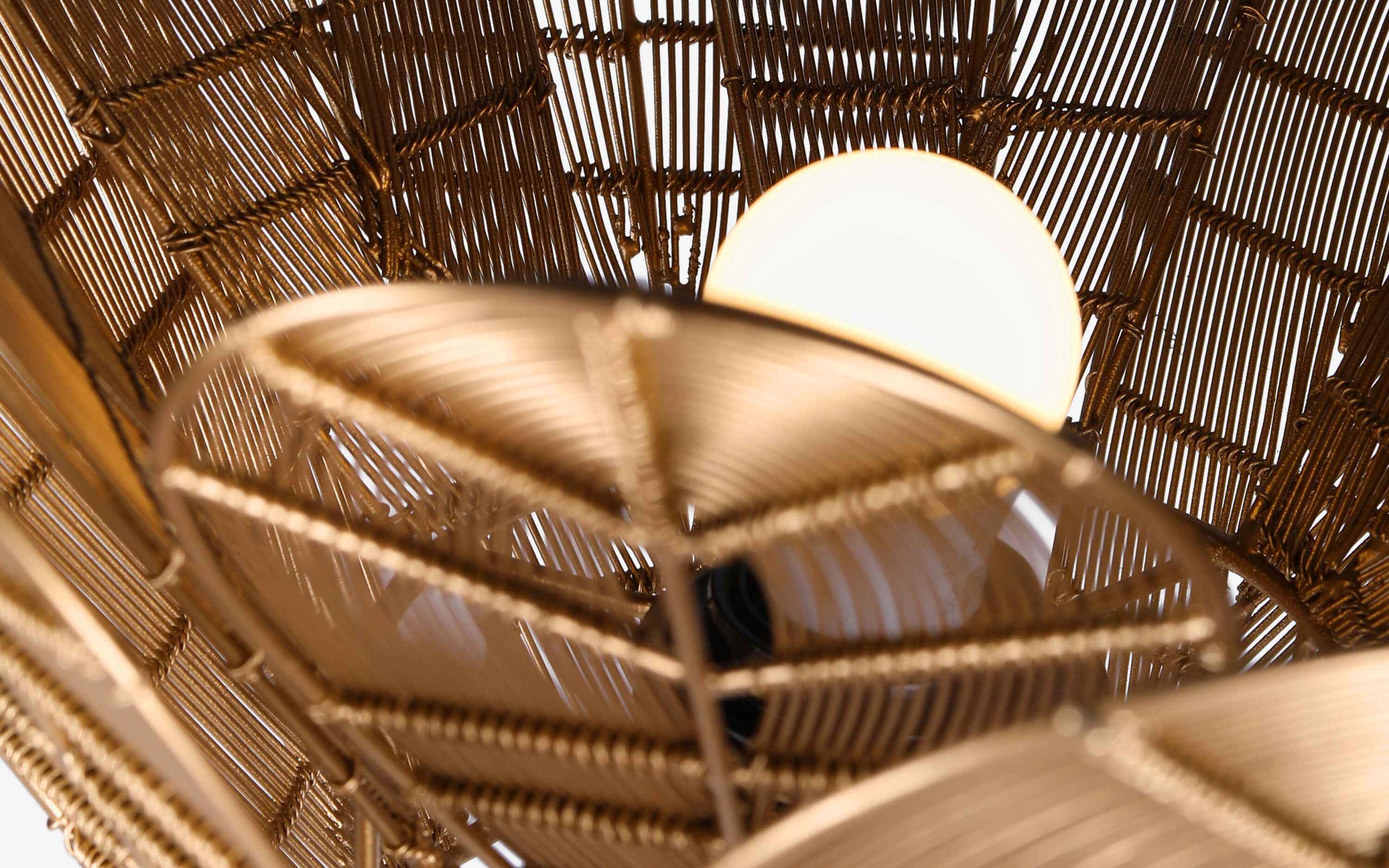 Taking inspiration from Art Deco, in Prerit Floor Lamp each rounded concentric lines is meticulously hand woven in thin golden wires by extremely skilled artisans of our village. The relative simplicity, planarity, meditative symmetry and unvaried repetition of elements come together to create this piece. The layers within allows light to filter through, creating bright and diffuse illumination highlighting the modern organic shade "Depending on your screen settings and resolution on your device there may be a slight variance in fabric color and wood polish of the image and actual product. Wood grains will vary from product to product in case of solid wood furniture."