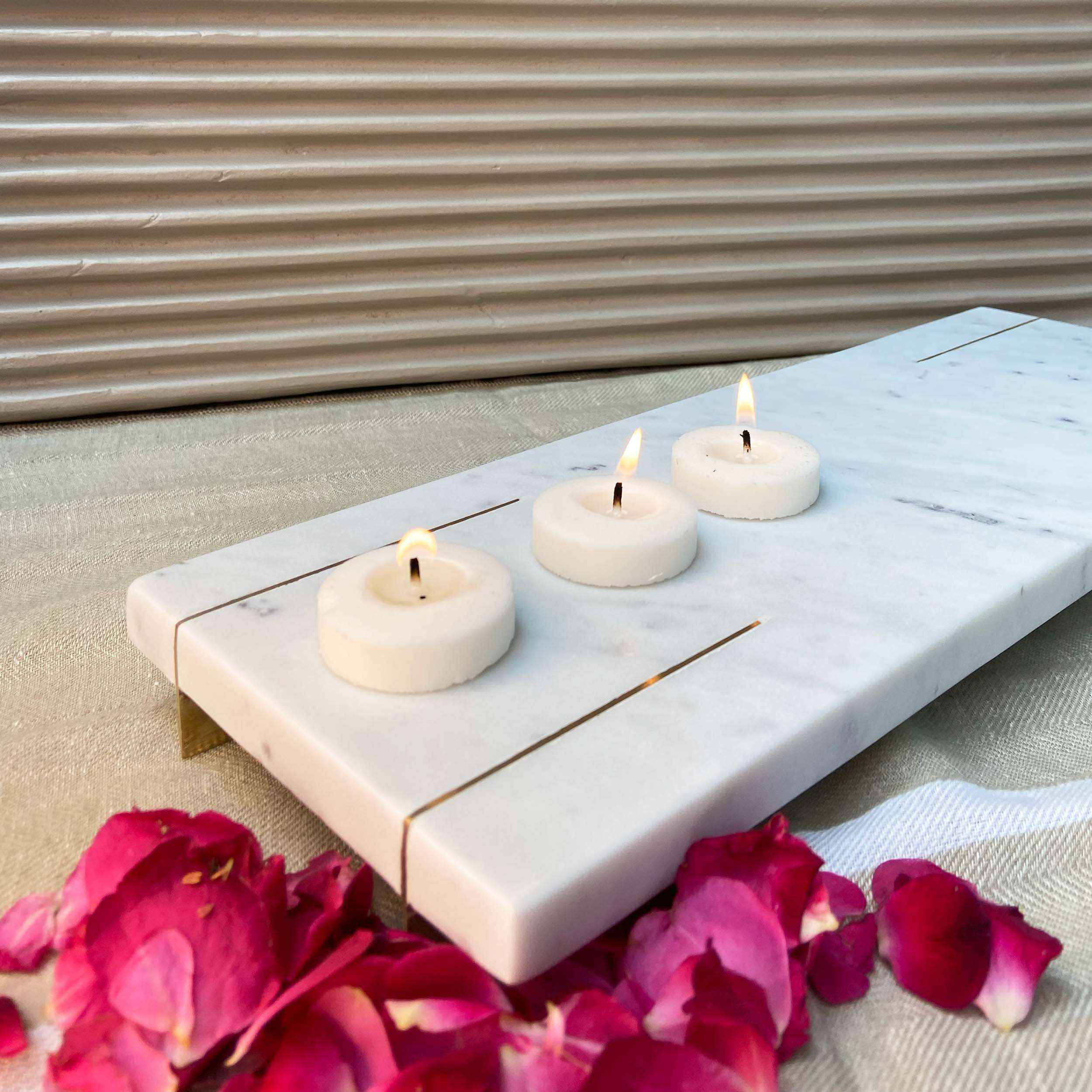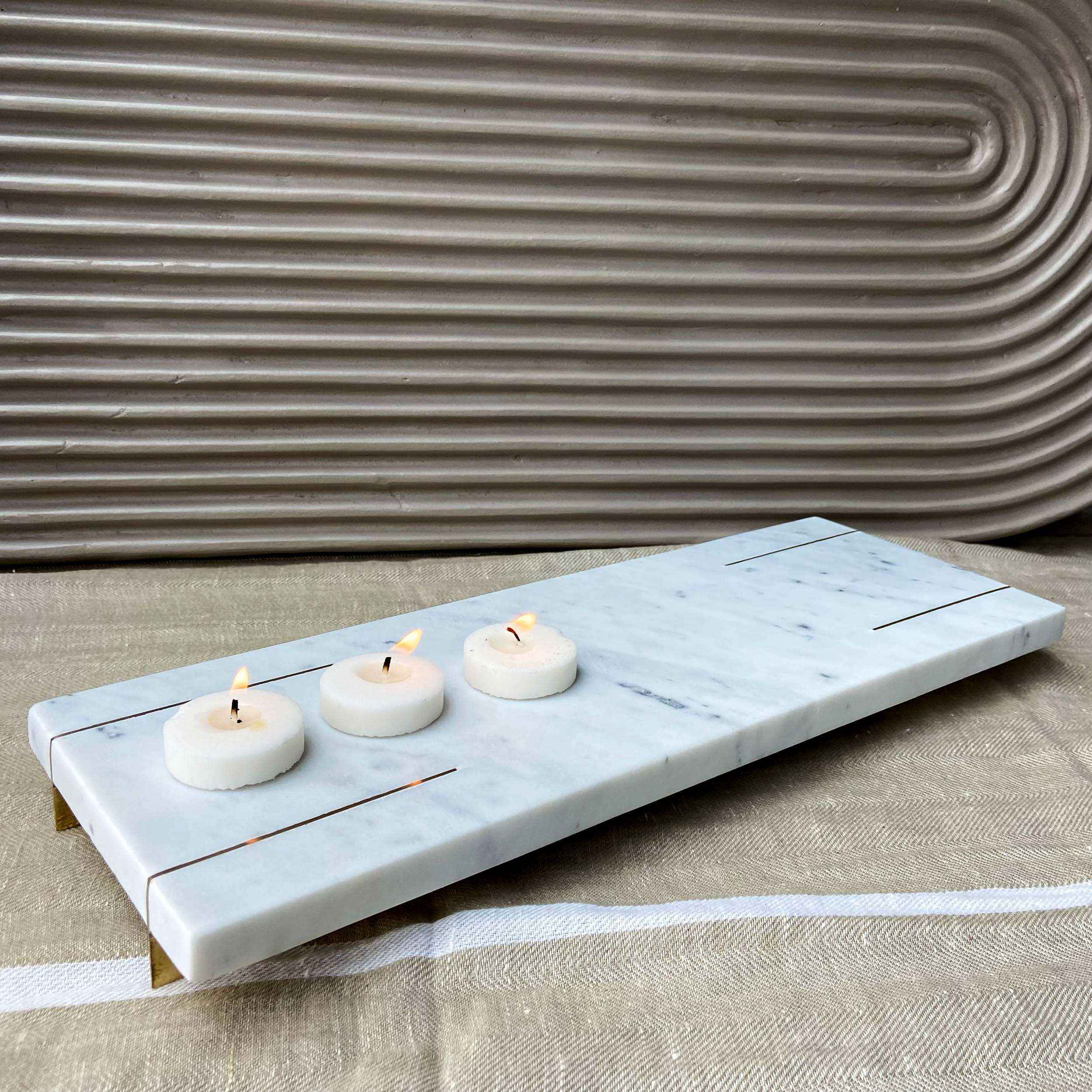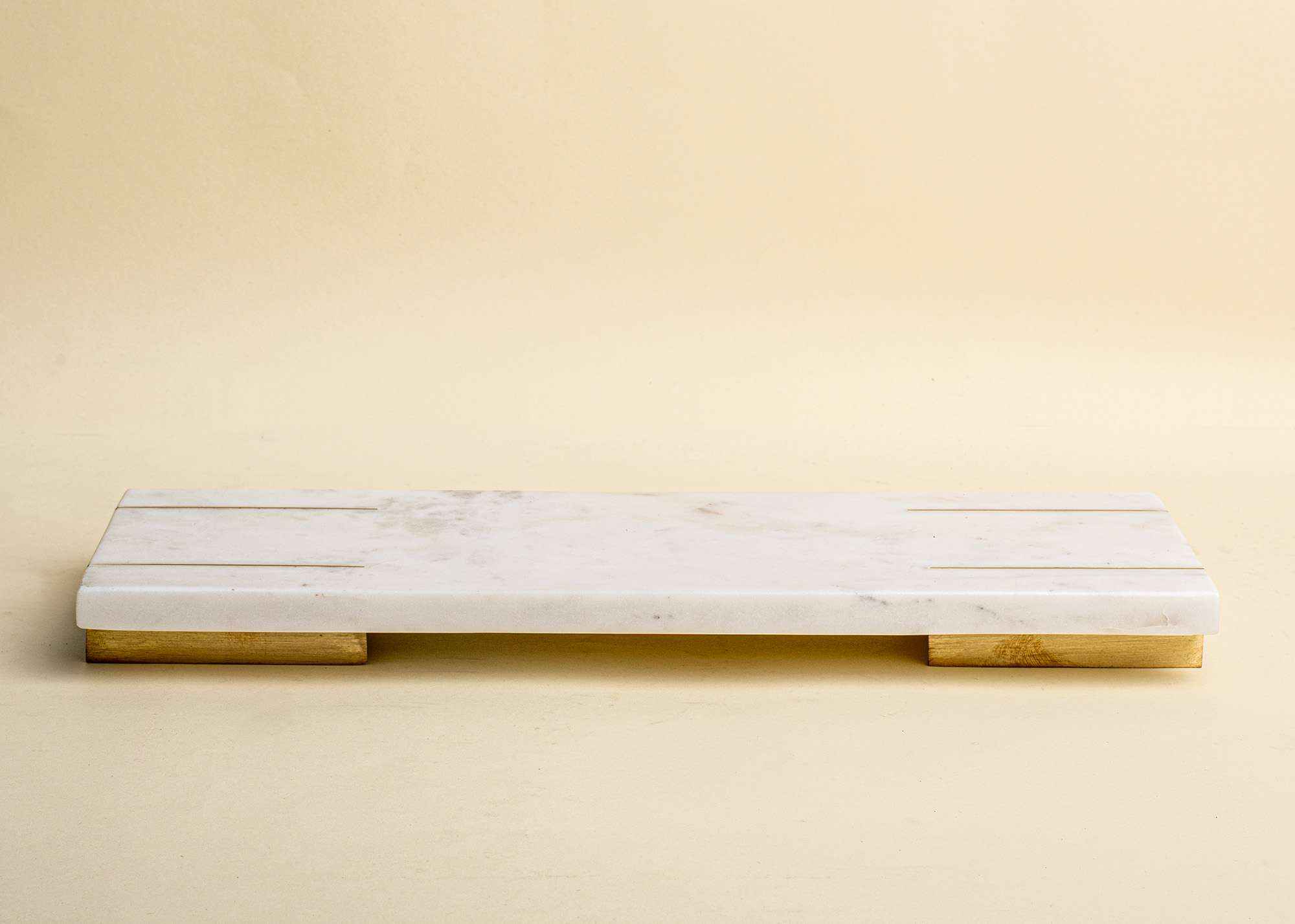 Striking platter made by intersecting strips of real brass with fine white marble. Make a statement by serving anything from sushi to mithai. Sure to make your food stand out. Alternative uses as a vanity organizer or a base for potted plants