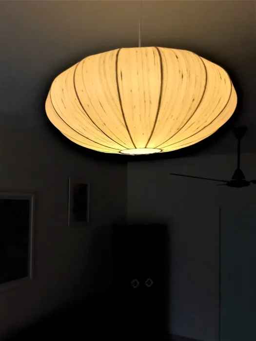 The Raw Silk Balloon Hanging Lamp is a beautifully designed light that will add a touch of elegance to any room. The fabric is natural raw silk and beautifully handwoven. The sleek powder coated metal frame is finished in white colour. The Lamp will make a statement in any space. The light adds a warm, inviting glow and soft ambience to any room and can be used in a lounge, living room, bed room or study to add both illumination and atmosphere to your settings.