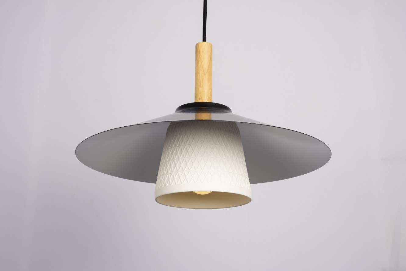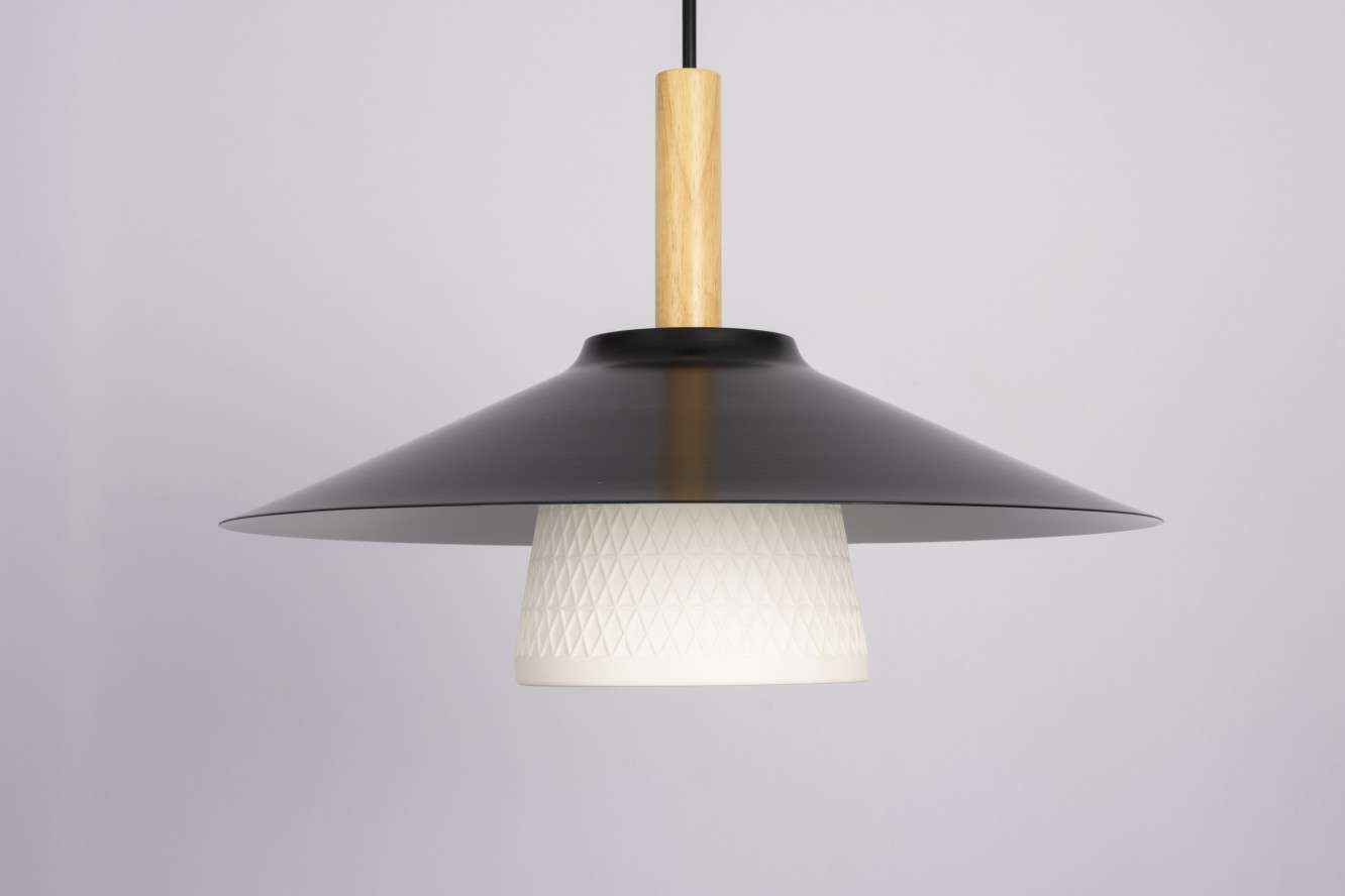 This urban industrial style mini pendant light offers a handsome look. It features ancient lantern accents to complement the finish. While the wide conical ceramic shape draws attention in any space, the shade's faceted exterior surface is matte black. Available in white and black.