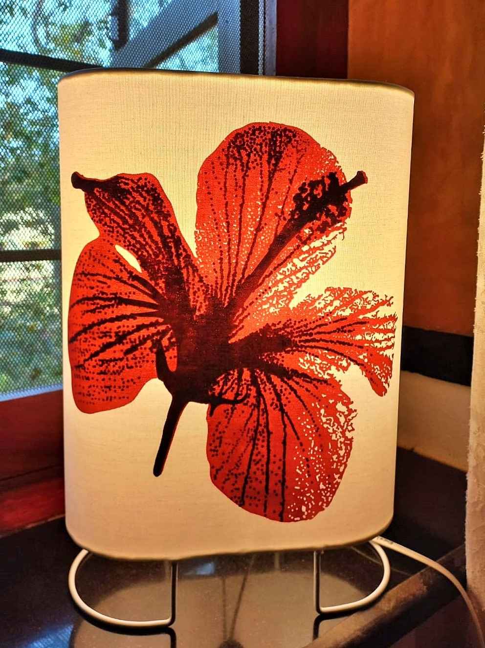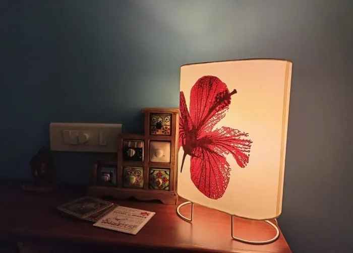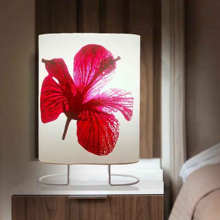 The Hibiscus table lamp is inspired by natural element and creates an aesthetic feel. You will like this fabric flower hand printed on the oval shade. The print has been done in two colors in order to add realism to the design. The shade is mounted on a powder coated stand with white finish. The light adds a soft ambience to any room and can be used in a lounge, living room, bed room or study to add both illumination and atmosphere to your settings.
