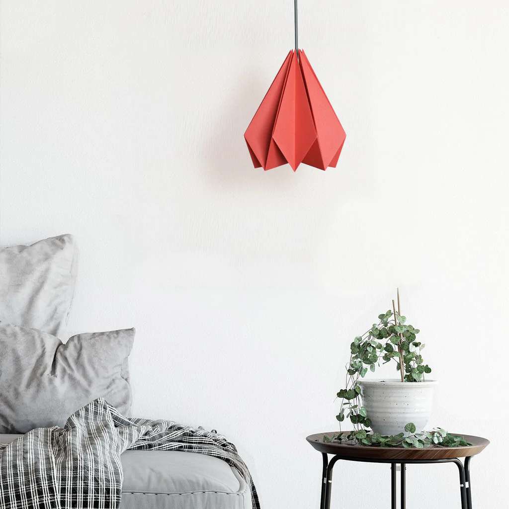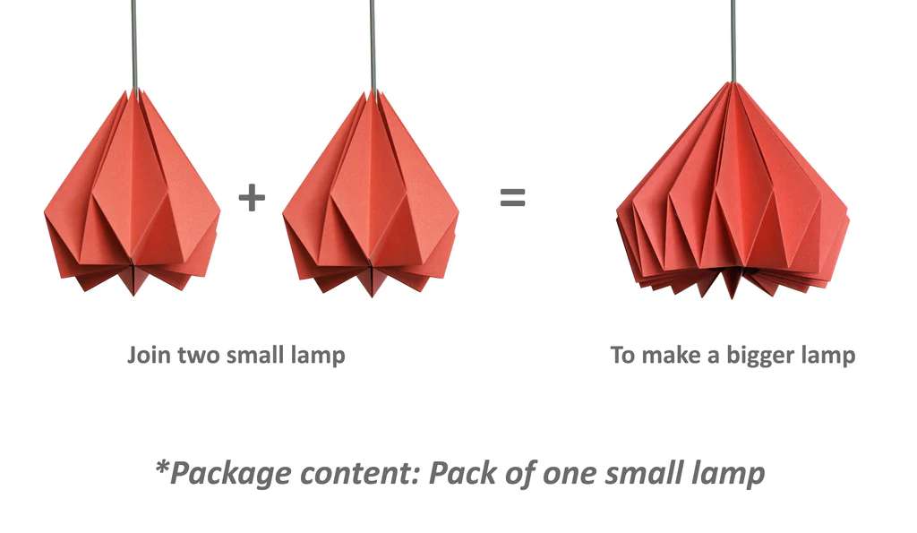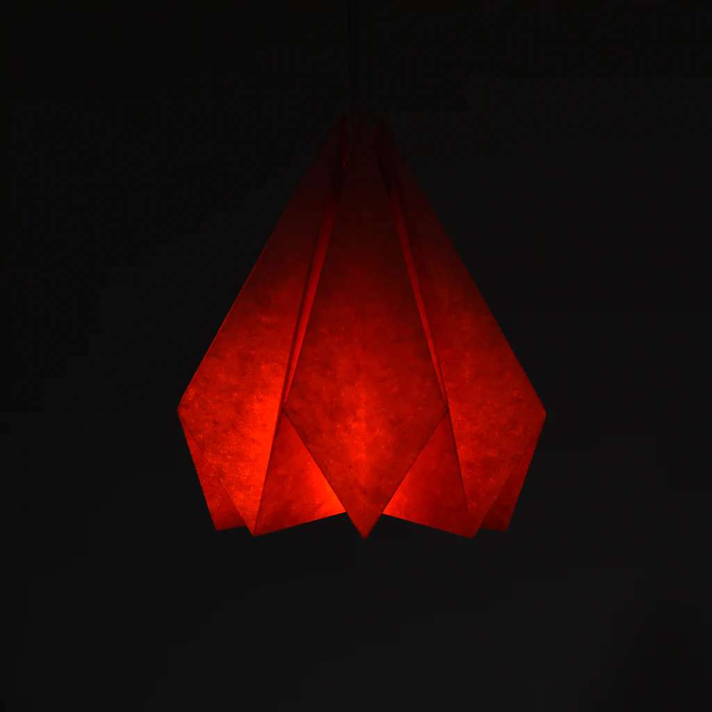 Our origami-inspired lamp has been put together using the finest quality of the paper. Each piece has been prepared with great care and exceptional craftsmanship to cater to your aesthetic needs for home decor.“All our products are handcrafted with utmost workmanship. The attention to detail and artistic brilliance that our home-trained team of differently abled people brings to the table makes our products special and unique.” Colour: Red Design: Plain Modular design: Join two lamps together to make a big lamp. Easy snap assembly Package content: 1 Flat Packed Paper Origami Lamp Shade Handcrafted pendant lamp shade. Can be used on any hanging light source (Bulb and holder is not included). Compatible with "LED" Light Bulb. A 9watt-3000k (warm white) LED bulb is used in the lamp shown in the image Easy assembly, Ideal for Home Decor Handcrafted by specially abled people