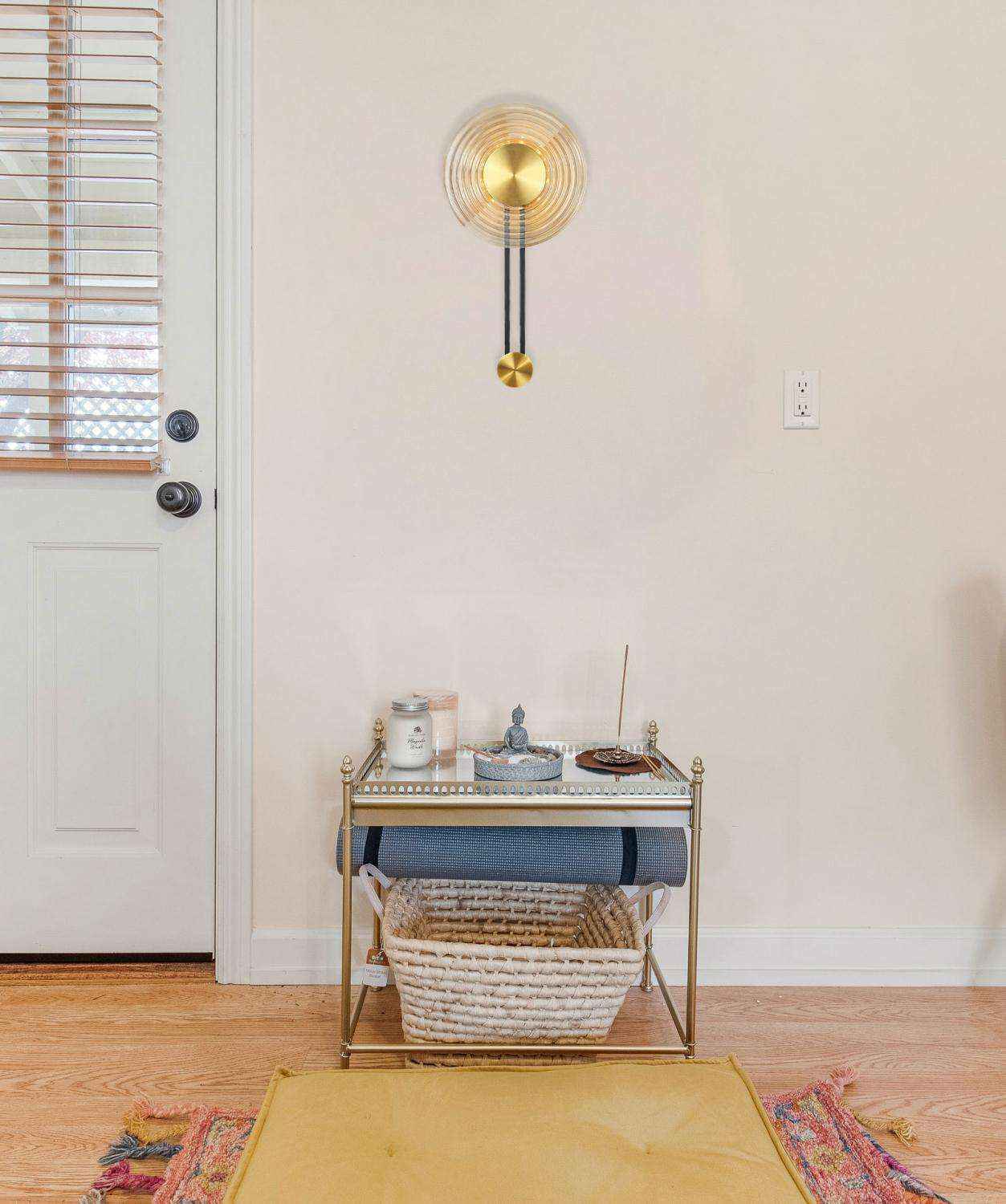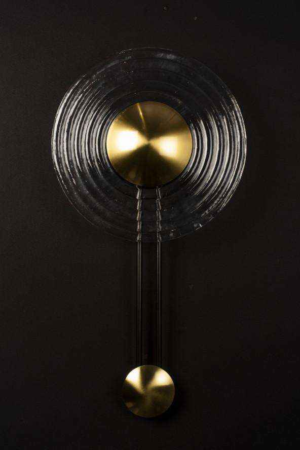 This pendulum shaped light has metal plating in gold finish. Its shade is made of circular glass resembling concentric circles. It would look lovely adorning any bedroom spaces.