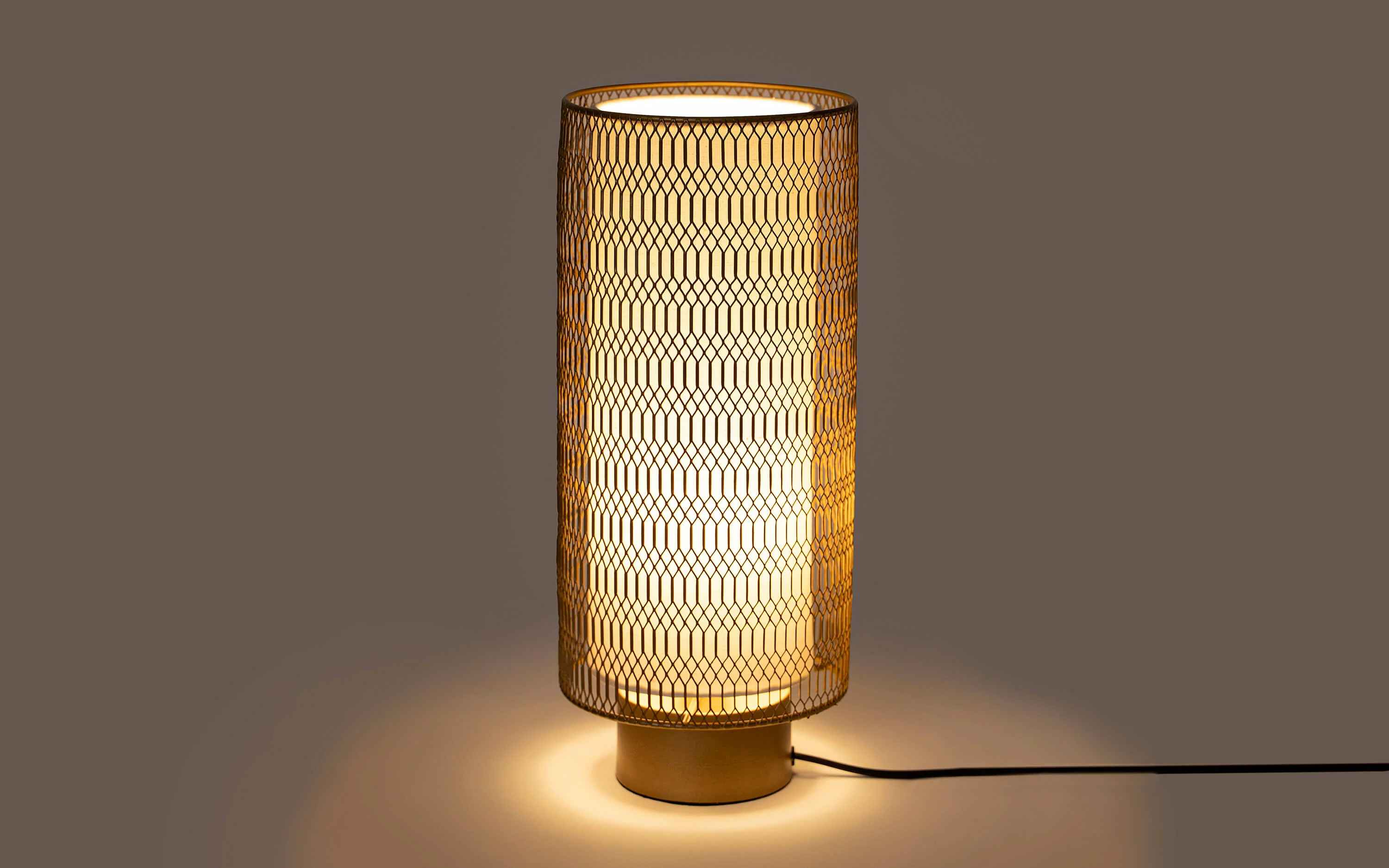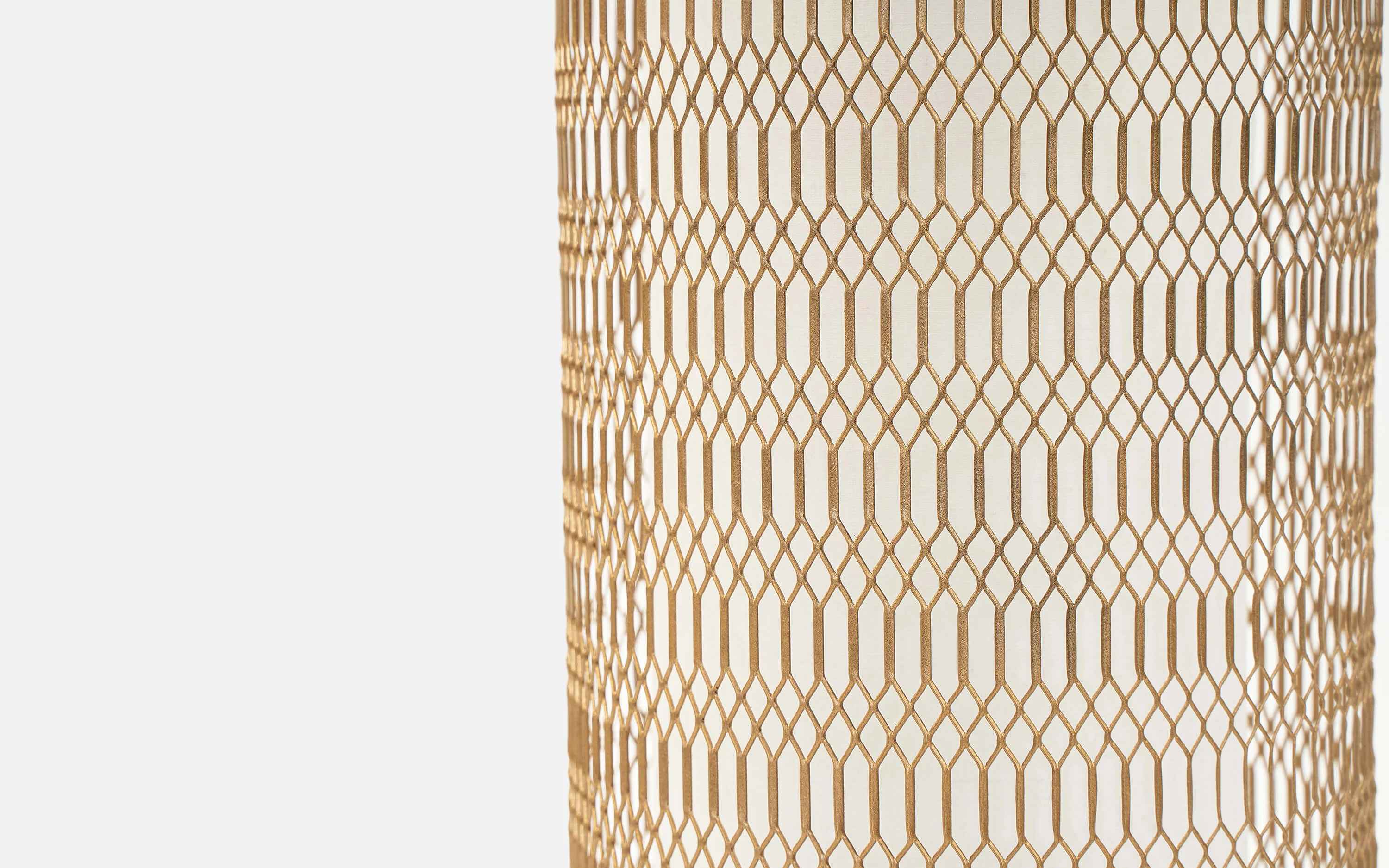 Our mesmerizing Rhombus Collection lights up any corner with exquisite design that's sure to garner attention. Cylindrical metal shade in fine jaali work encases the cotton shade within.