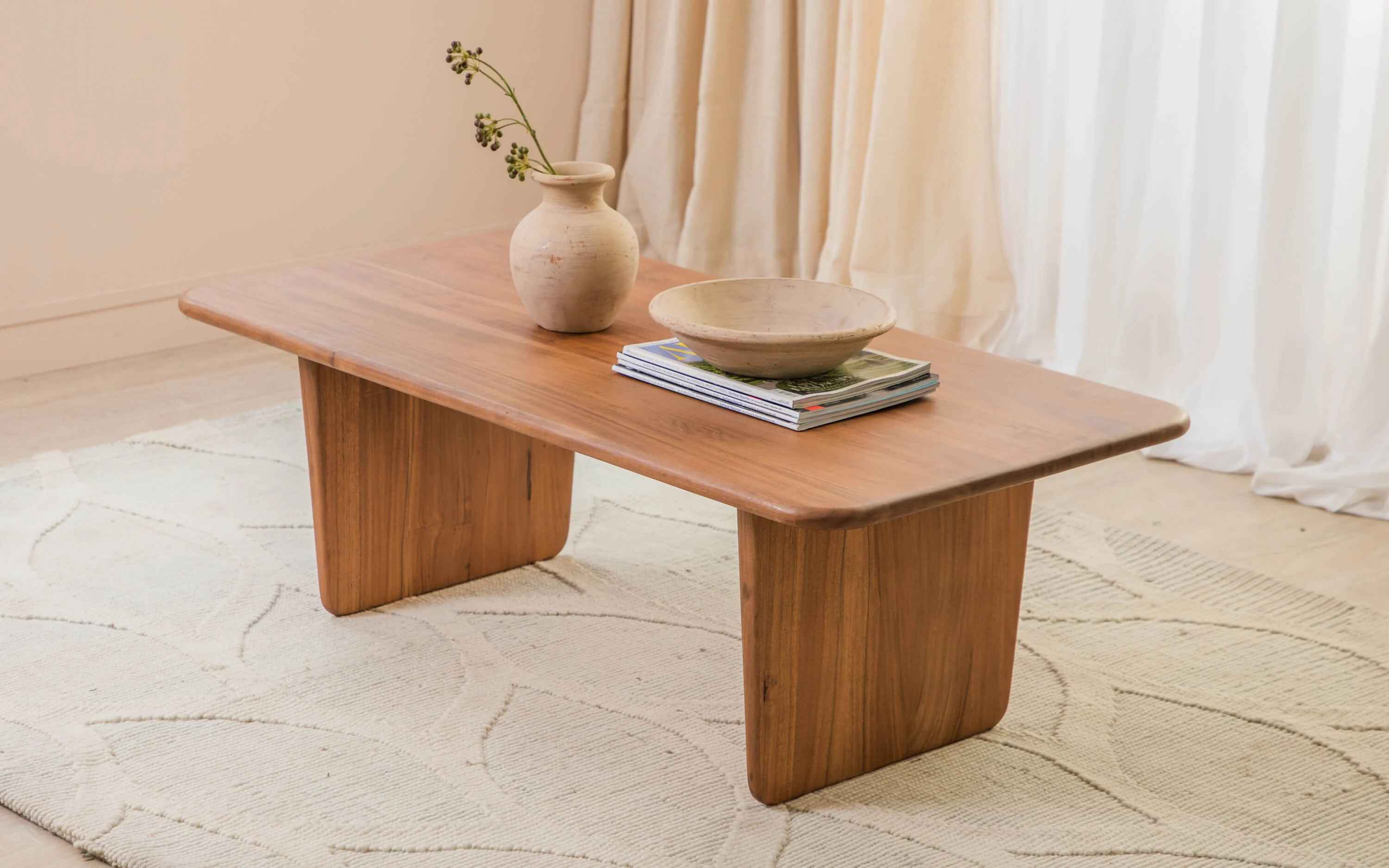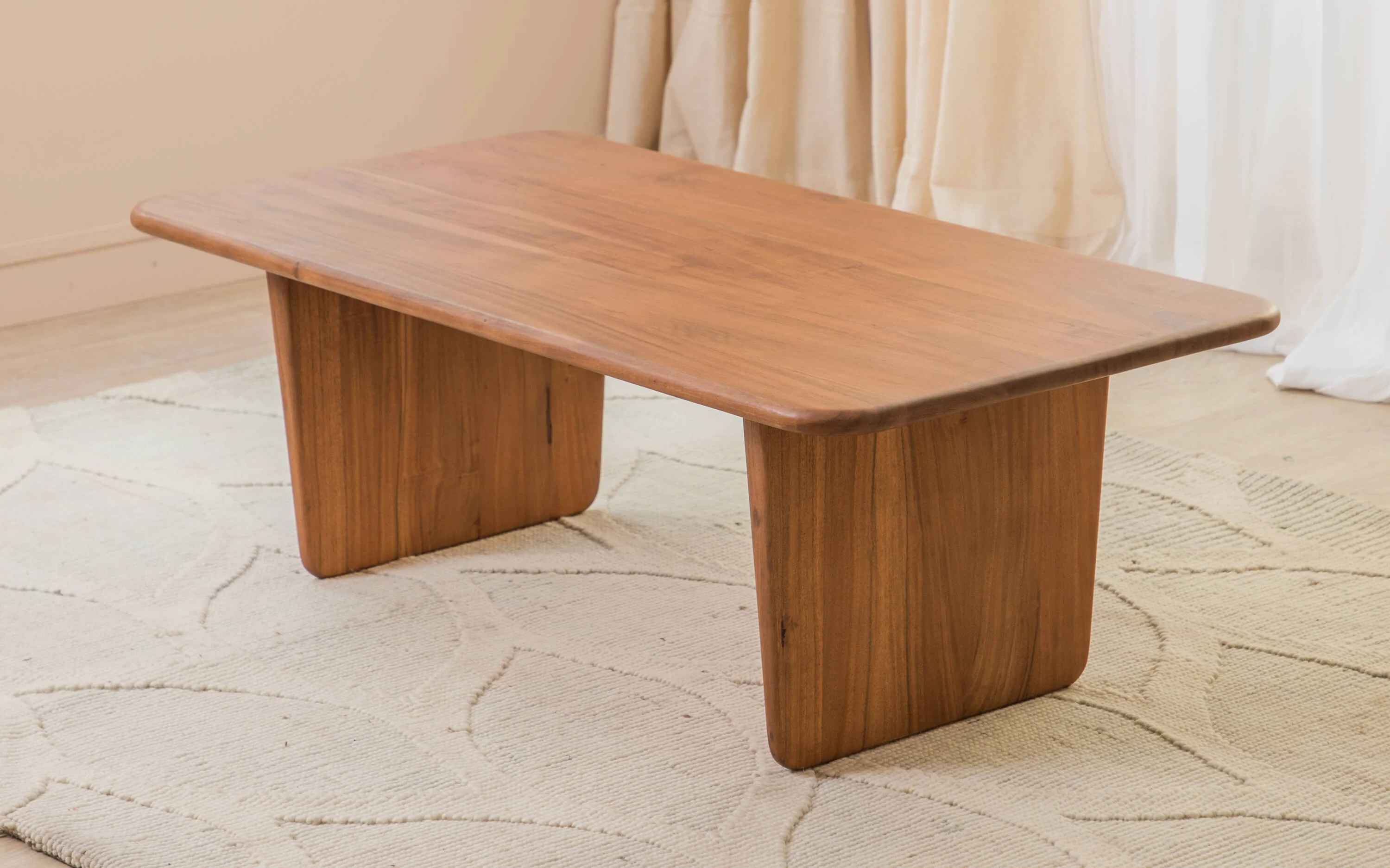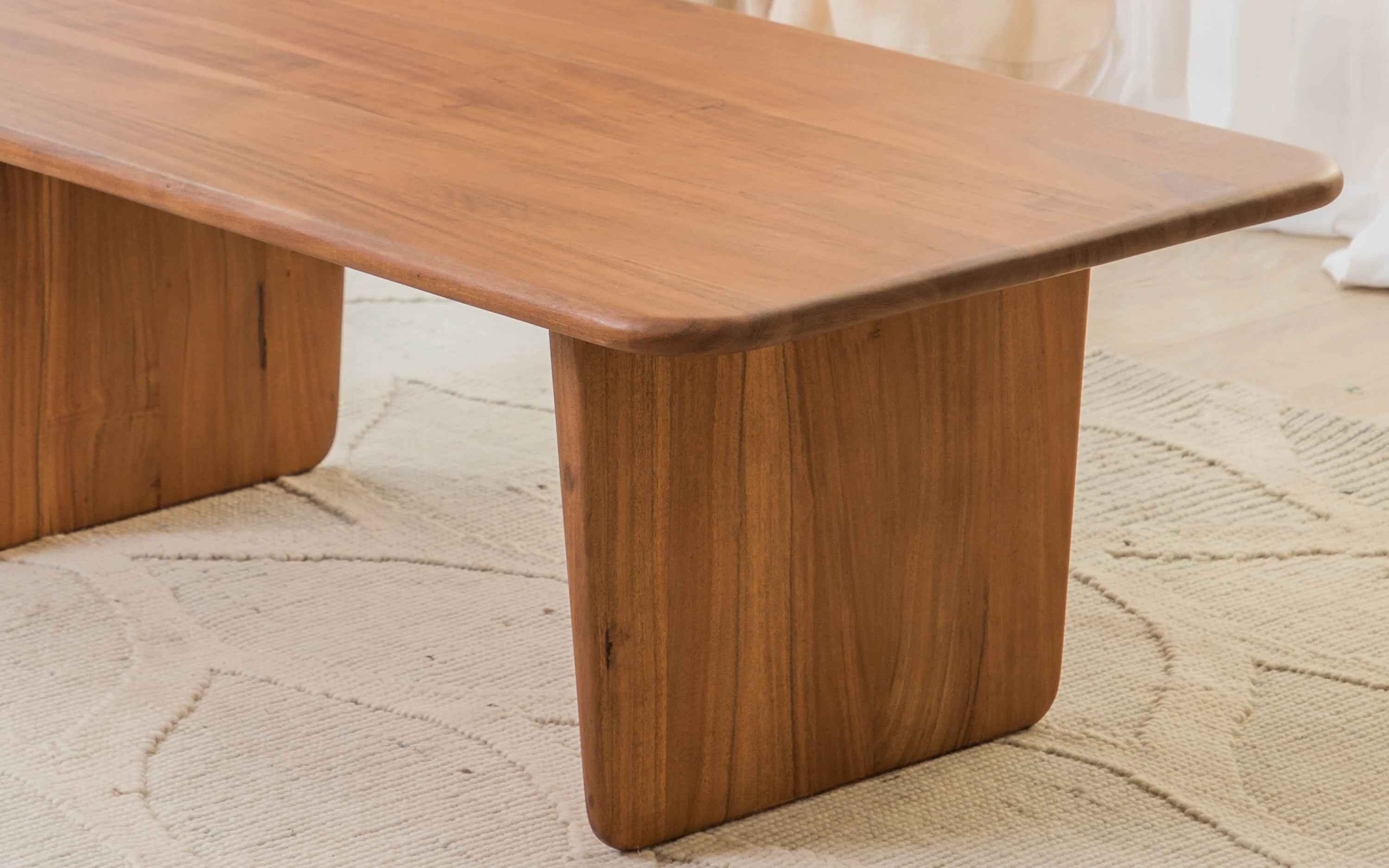 Upgrade your home with the refined elegance and grace of our Riku coffee table which stands out with a rectangular shaped tabletop. its bold curves contrast with inset solid wooden slab legs. The instalment of the Riku Coffee table in the versatile modern living room features a solid construction with acacia wood with its light autumn brown finish reflecting a pleasing look. Riku is the perfect surface to rest a cup of tea or current read. "Depending on your screen settings and resolution on your device there may be a slight variance in fabric color and wood polish of the image and actual product. Wood grains will vary from product to product in case of solid wood furniture."
