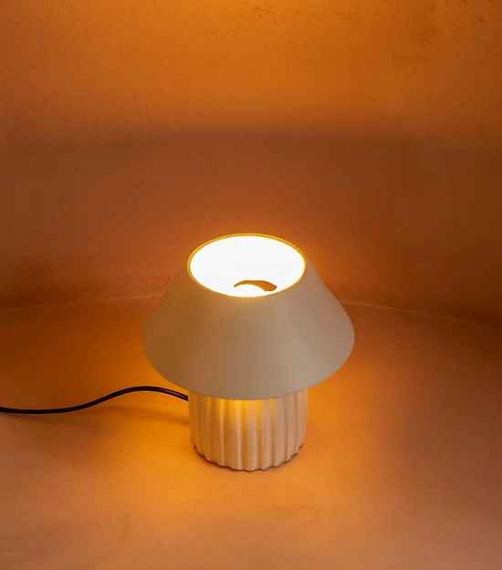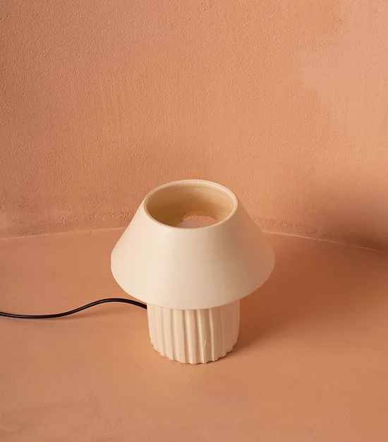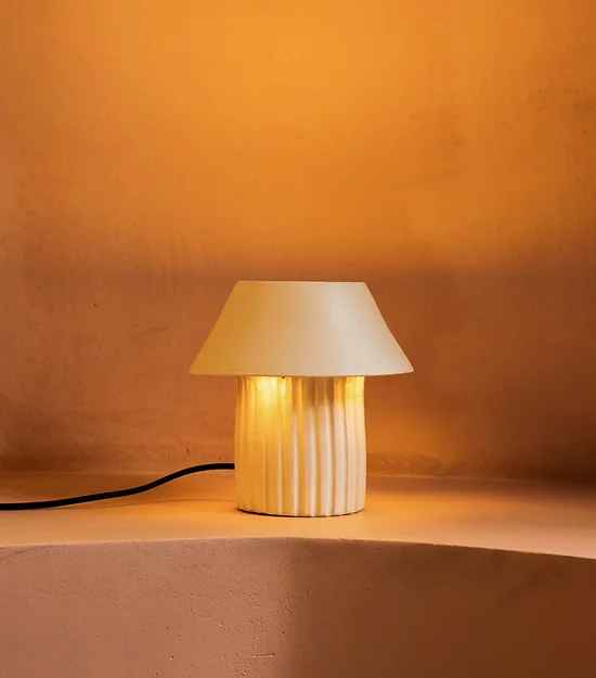 The Rio table lamp, our bestseller, is handcrafted with stoneware and available in a variety of colors and sizes. The unique and elegant design was inspired by traditional lampshades, making it a stunning addition to any space. In the image, the lamp is depicted in a small, unglazed white finish.