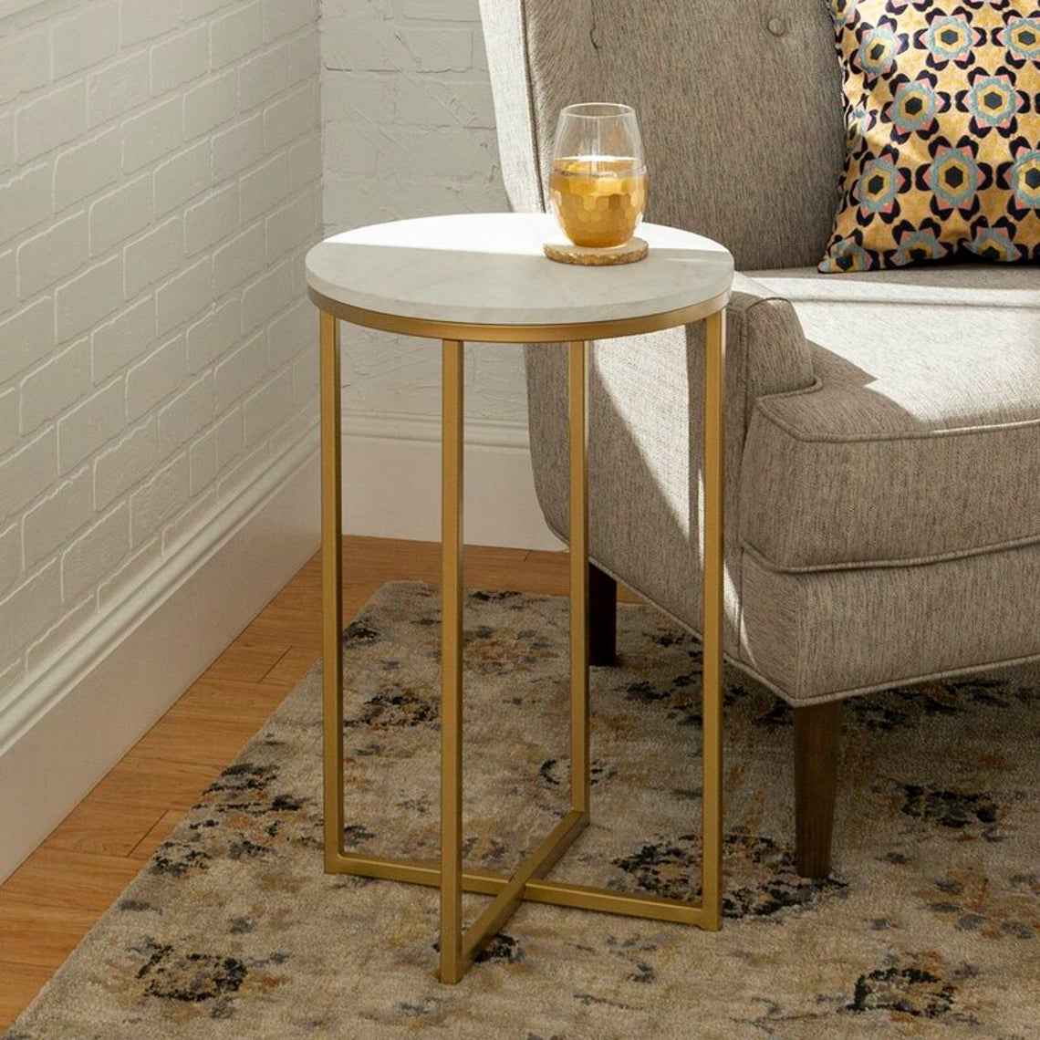 Rounded Pedestal End Table is the perfect complement to any sofa or armchair. Not only does it display decor, but it also holds your TV remotes and beverages. This stylish end table is made from metal and has a glamorous gold finish. The circular tabletop is made from marble and features a solid, neutral color that won't clash with your existing color scheme. Its simple and elegant design makes it a great addition to any living room.