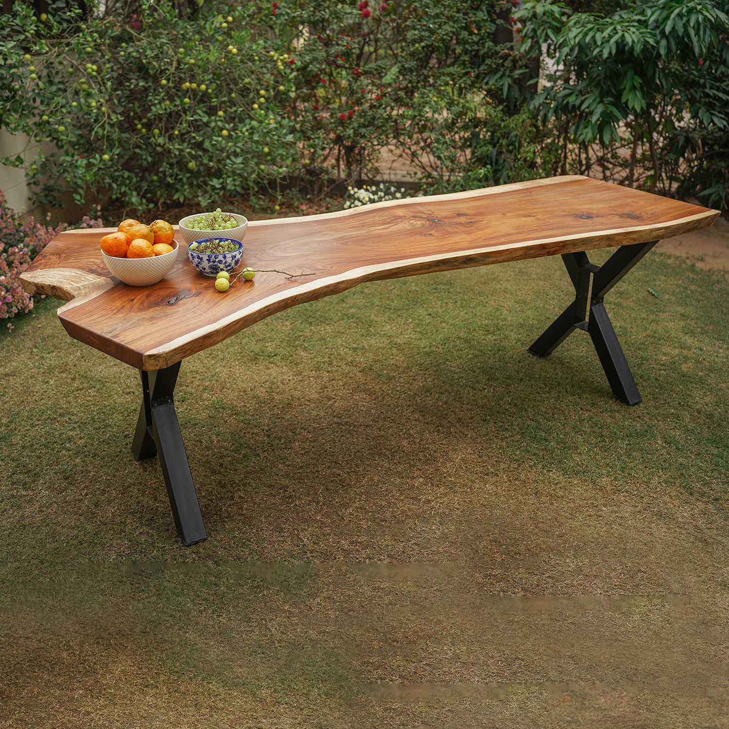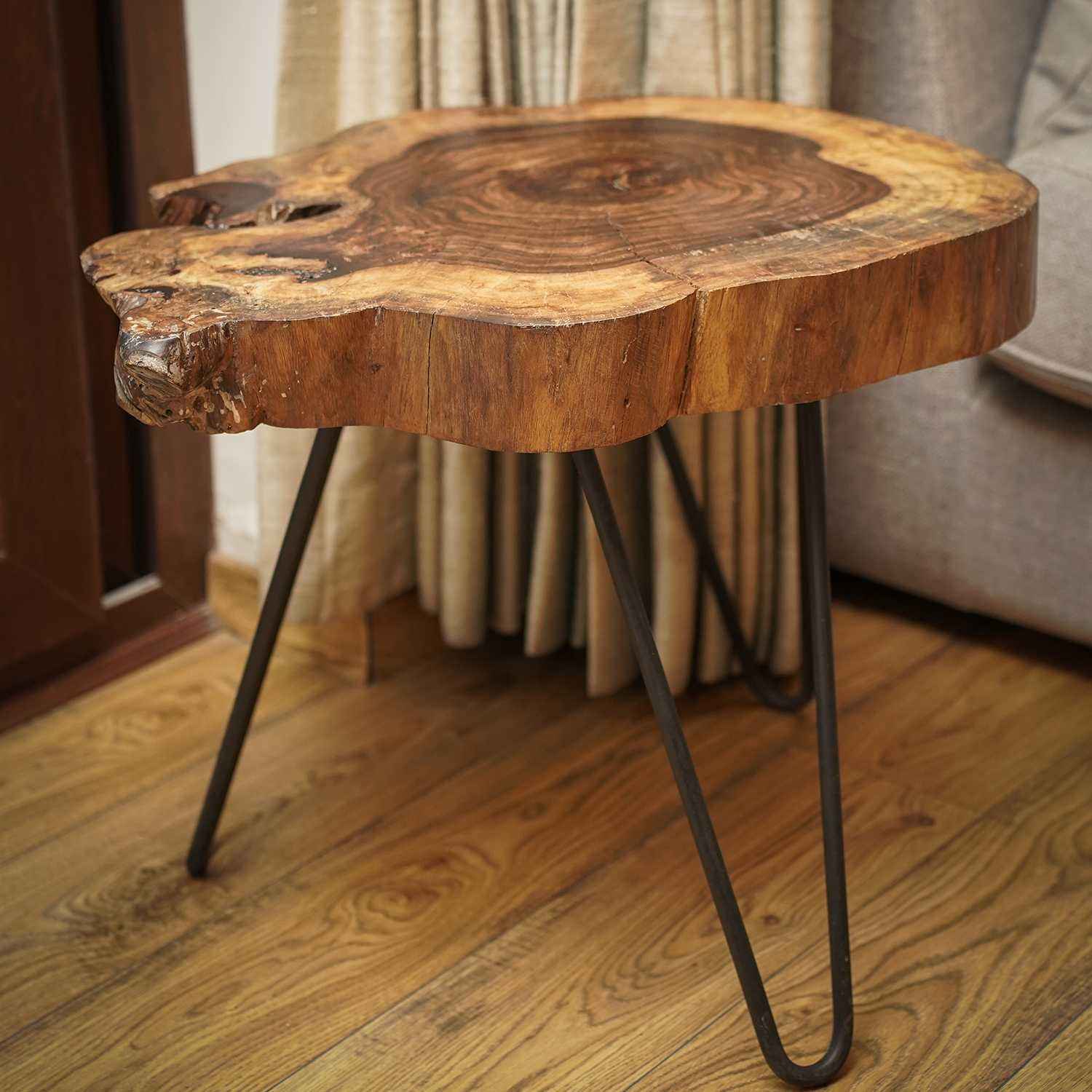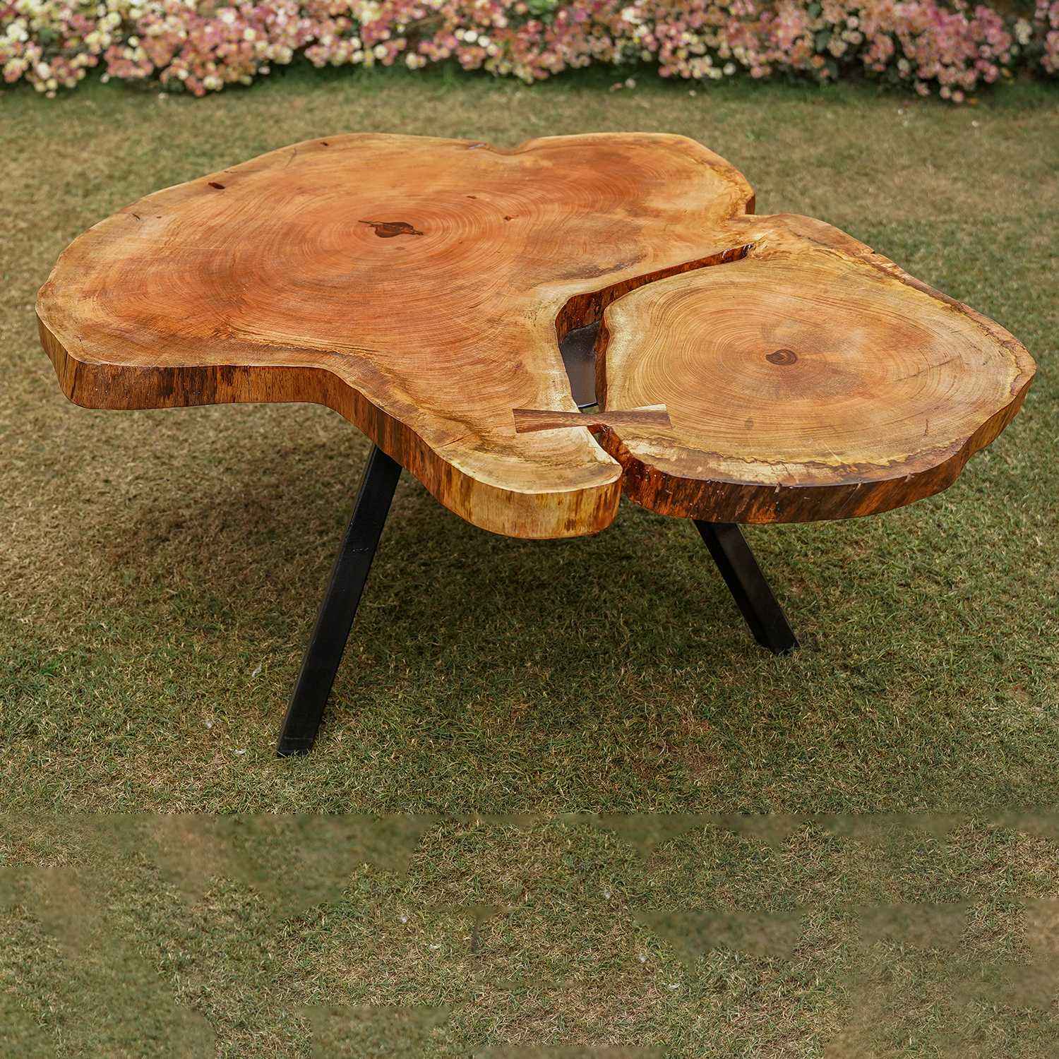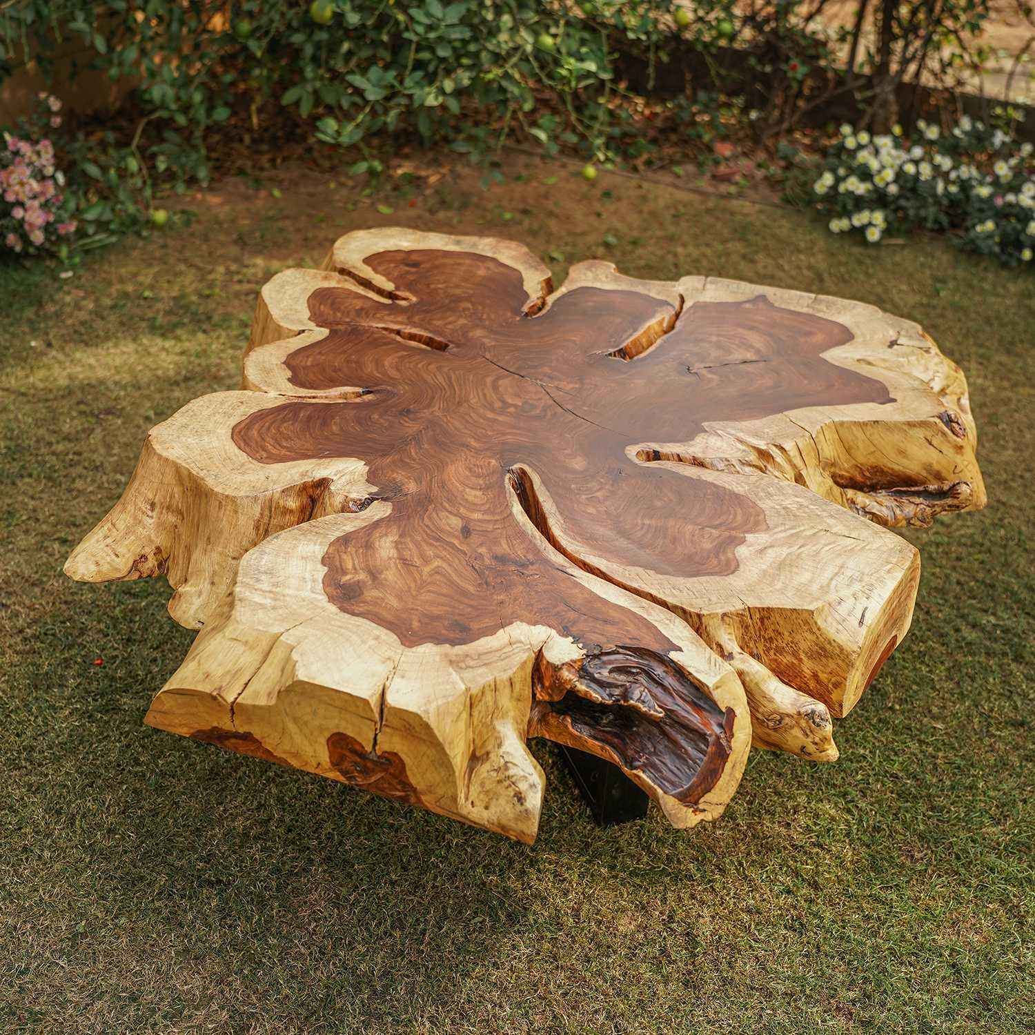 Rustic sheesham log center table with dark rose wood finish . Has a beautiful distinctive grain.
