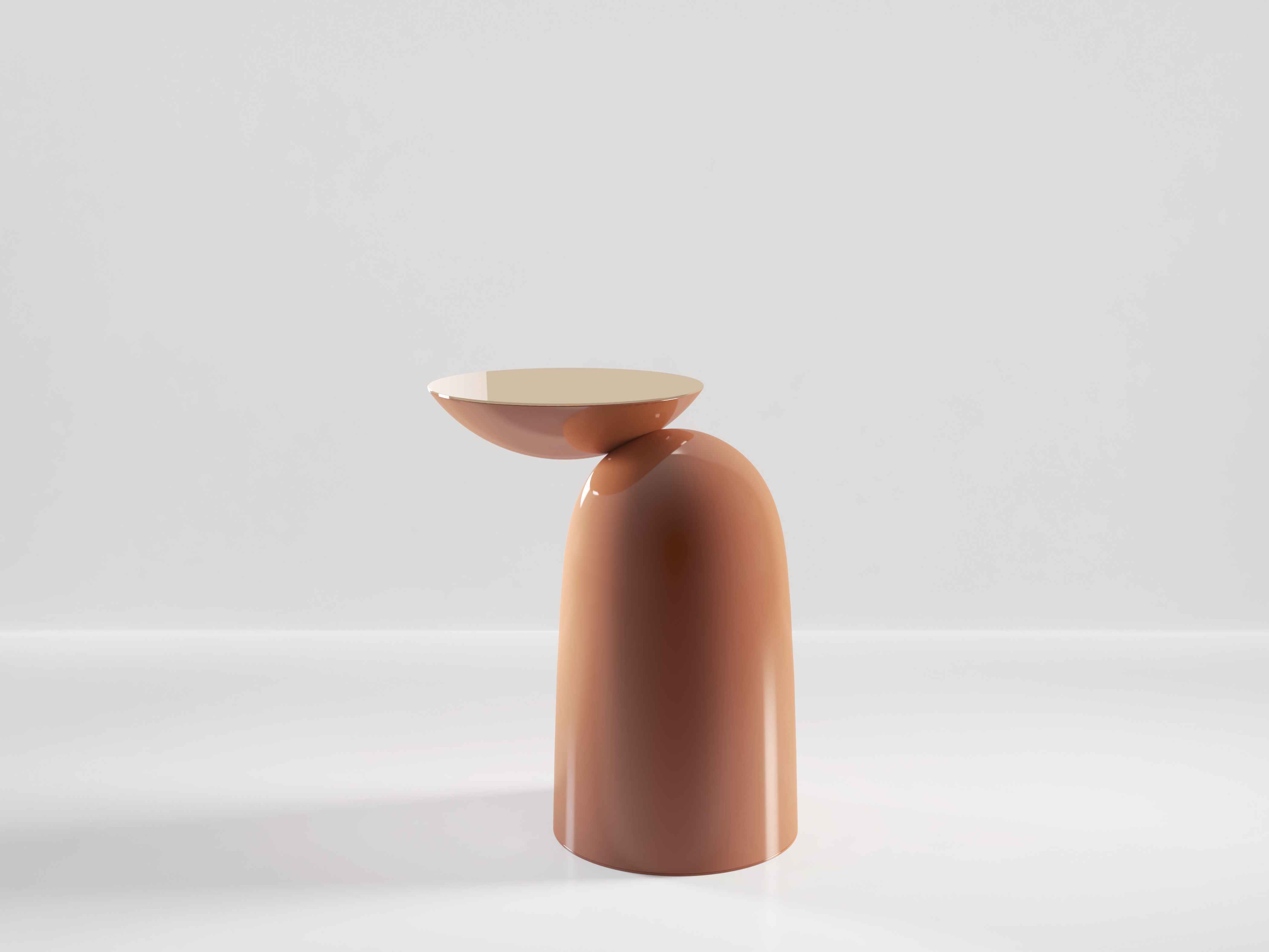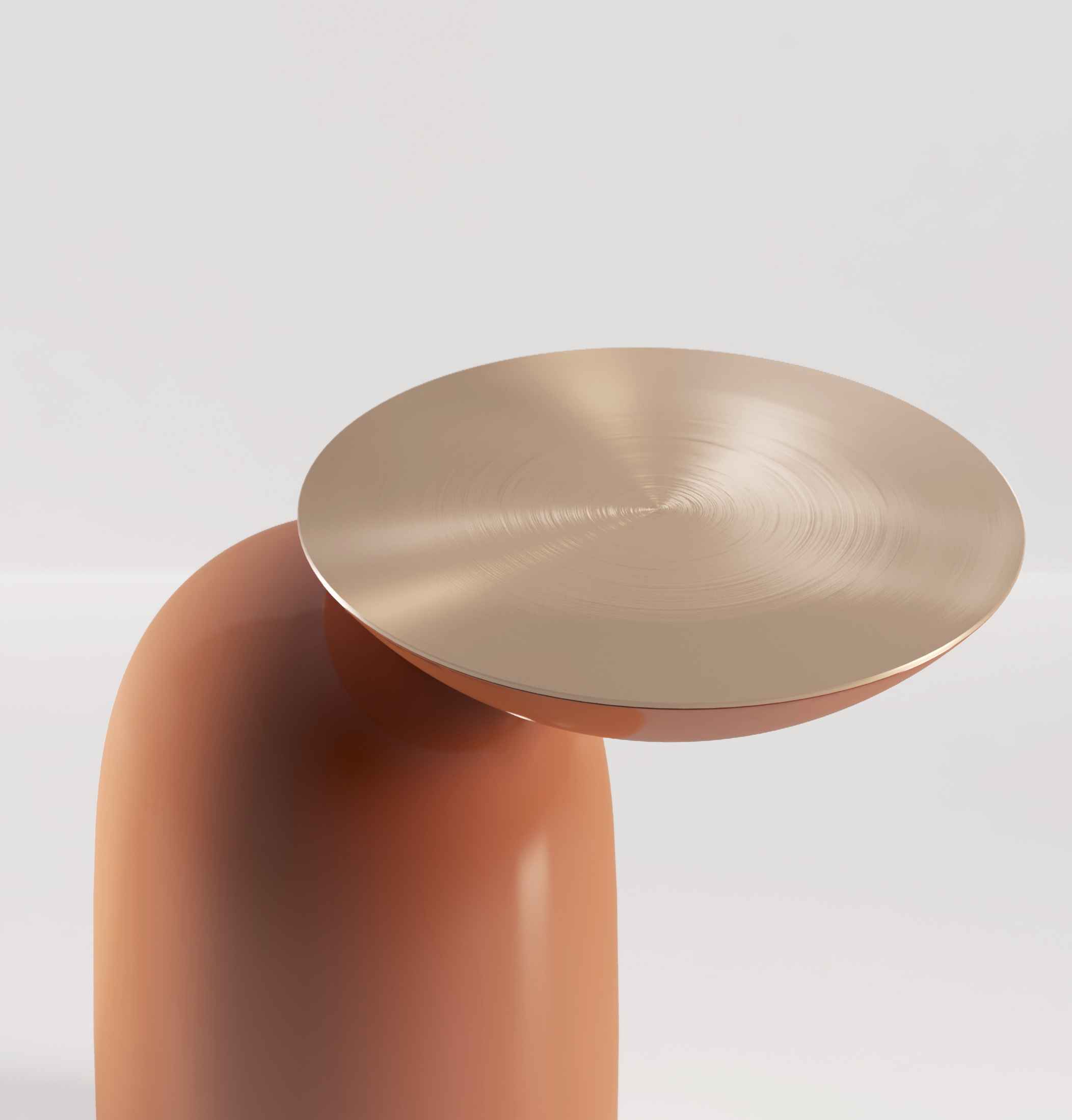 Machine cut layers of MDF glued and hand fnished to achieve smooth surface. Finished with a heavy lacquer available in matte or high gloss. Central column counterweight in steel. Top: Machine cut, 2mm steel with radial brush fnished in any of our range of metal fnishes and glued in place.