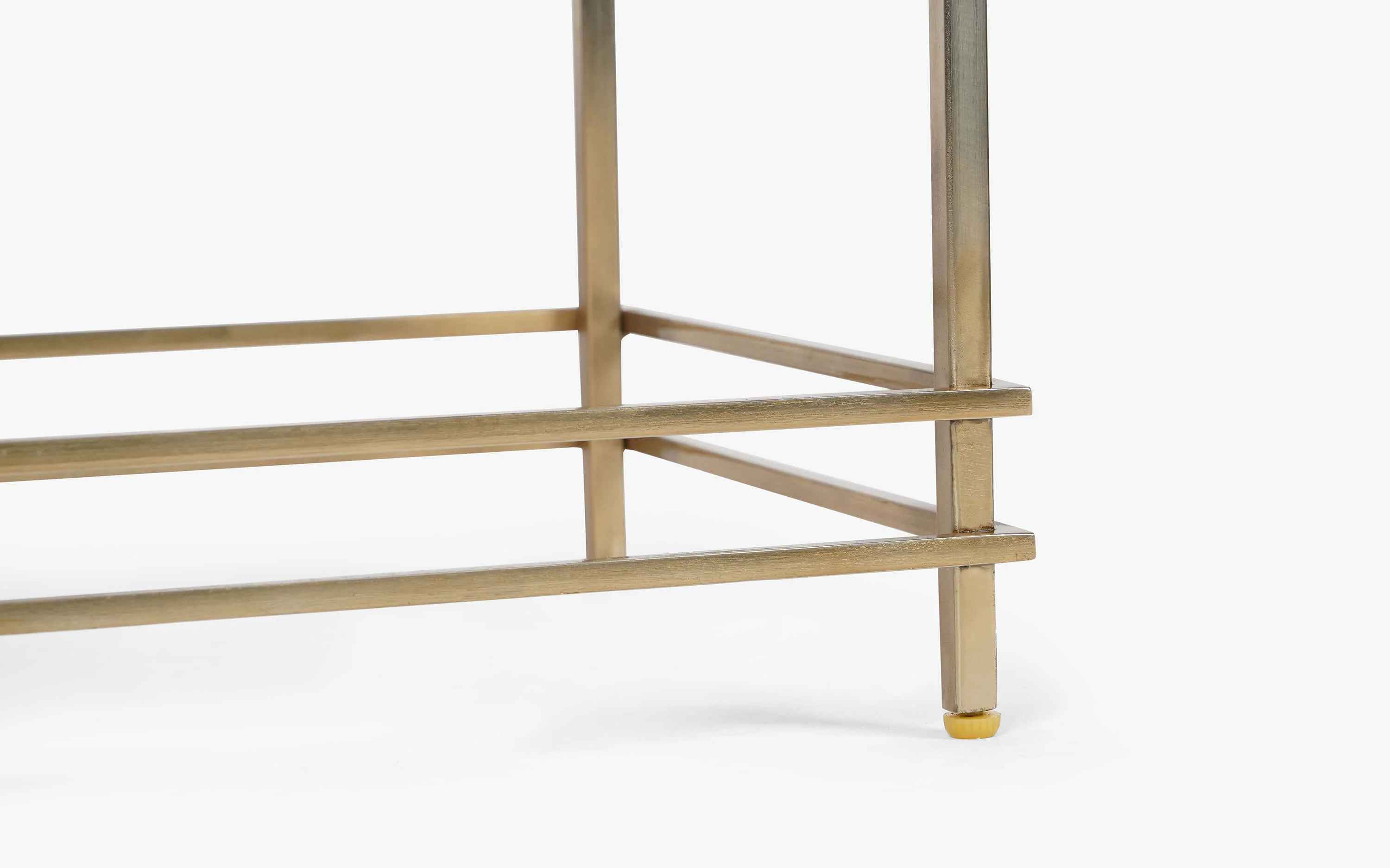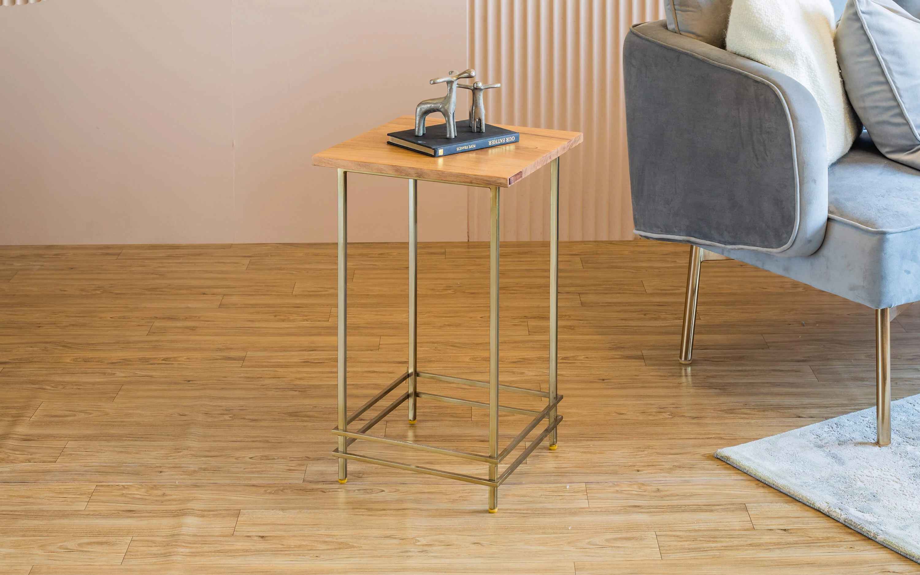 Contemporary and refined, our Shika side table has an rich Acacia wood top with metal bars and twinned leg pairs accentuating the end table's sculptural lines. No harmful chemicals or toxins are used in our furniture. Natural eco-friendly lacquers are used that helps in sustaining a healthy lifestyle. "Depending on your screen settings and resolution on your device there may be a slight variance in fabric color and wood polish of the image and actual product. Wood grains will vary from product to product in case of solid wood furniture."