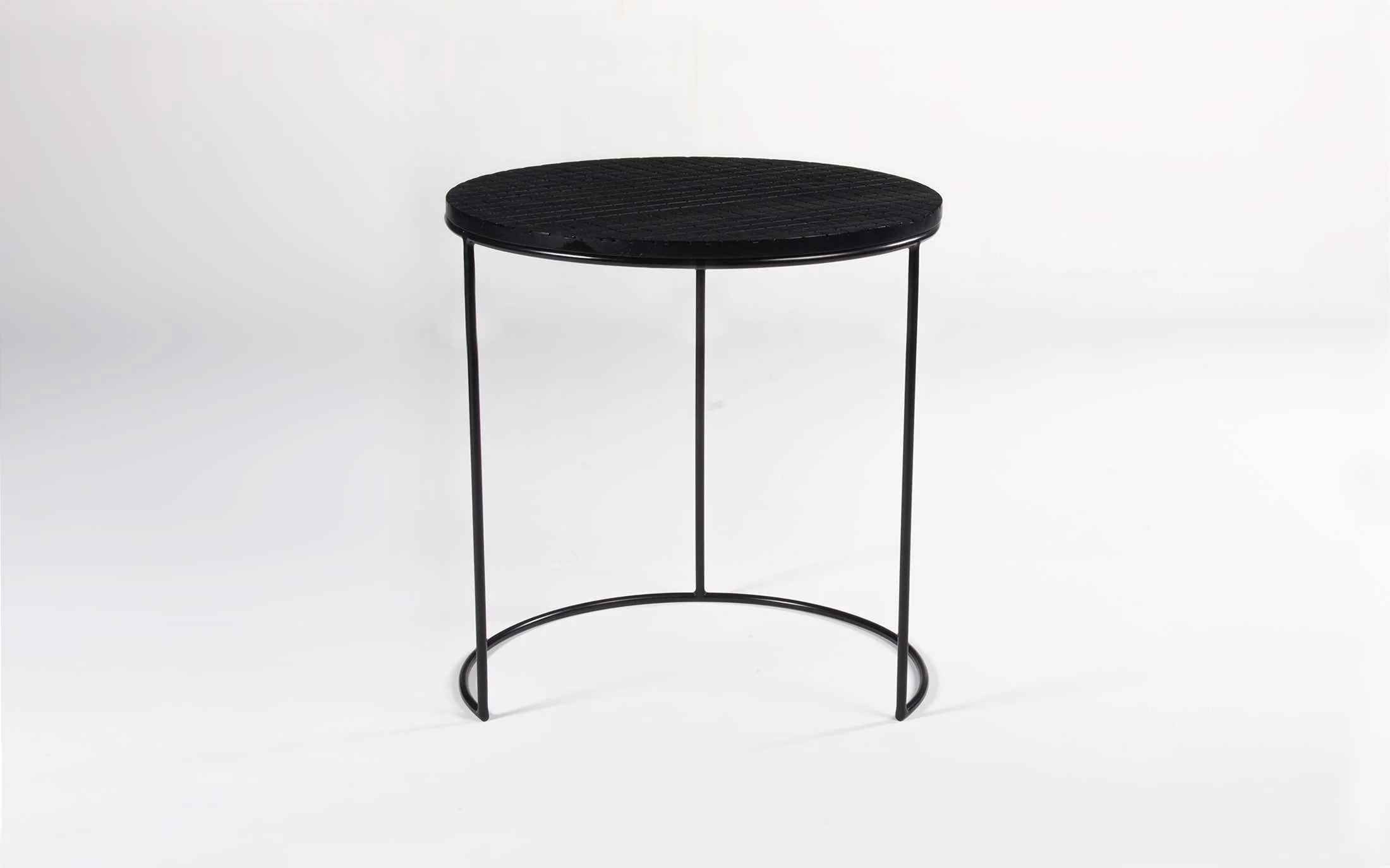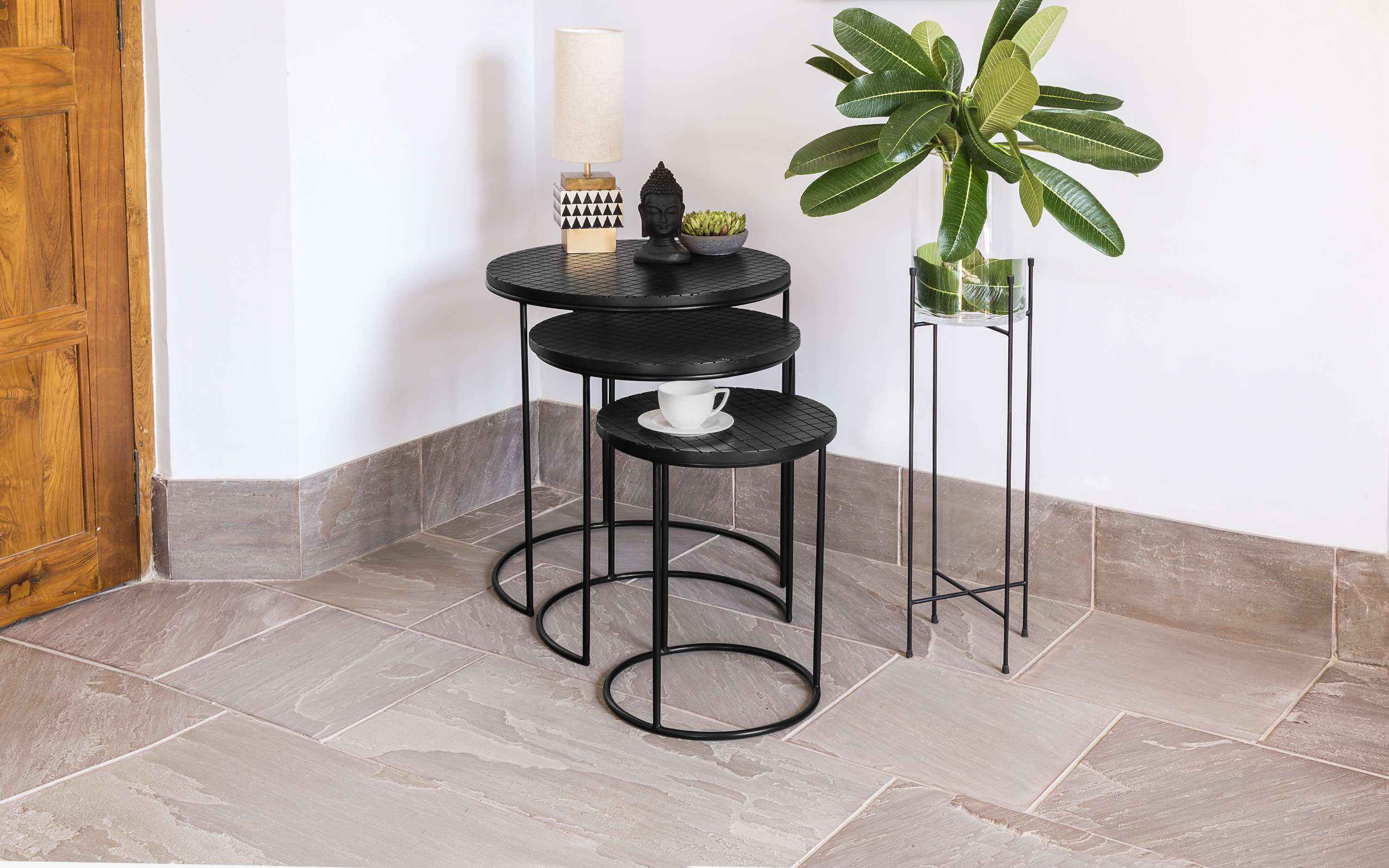 This Round trio of nesting tables serves up flexible functionality along with fun shapes and textures. Rising to three different heights, the tables stand on slim iron legs. Black colour powdercoating finish adds a trend-conscious note of industrial chic. Tables cluster together as a tiered arrangement and move about the room when company comes to call. "Depending on your screen settings and resolution on your device there may be a slight variance in fabric color and wood polish of the image and actual product. Wood grains will vary from product to product in case of solid wood furniture."