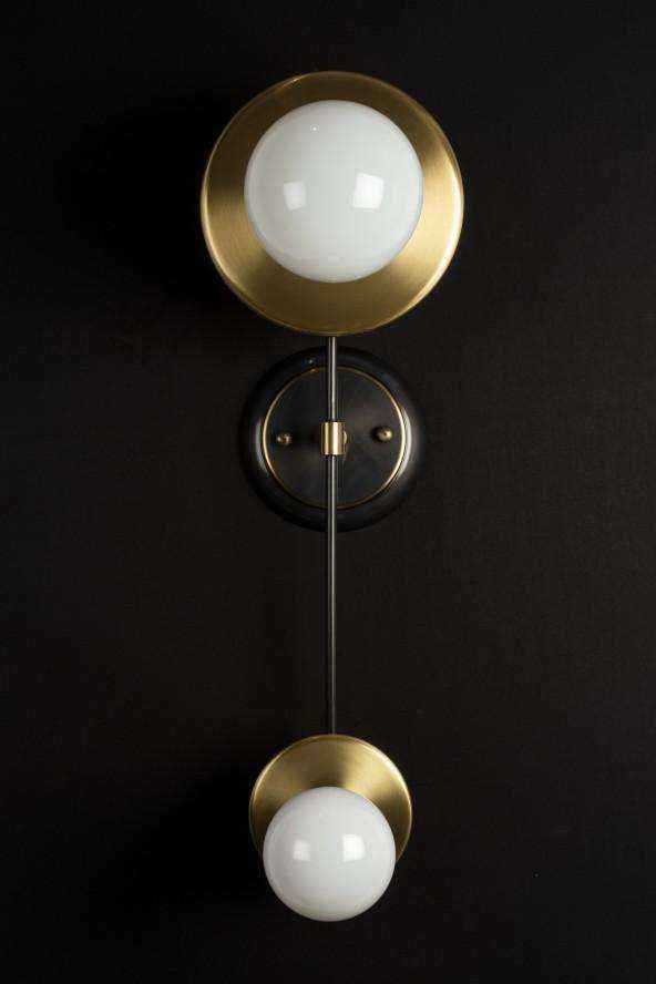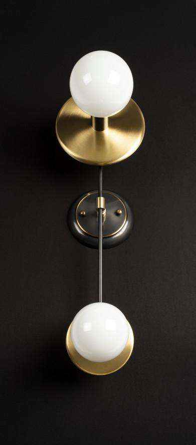 Classic forms conspire to create regally sculptural sophistication with the LED wall sconce. From a heavy circular backplate, slim vertical rod hosts two asymmetrical clean curved discs. Against these bold forms, two opal matte glass globes of different sizes are proudly showcased.