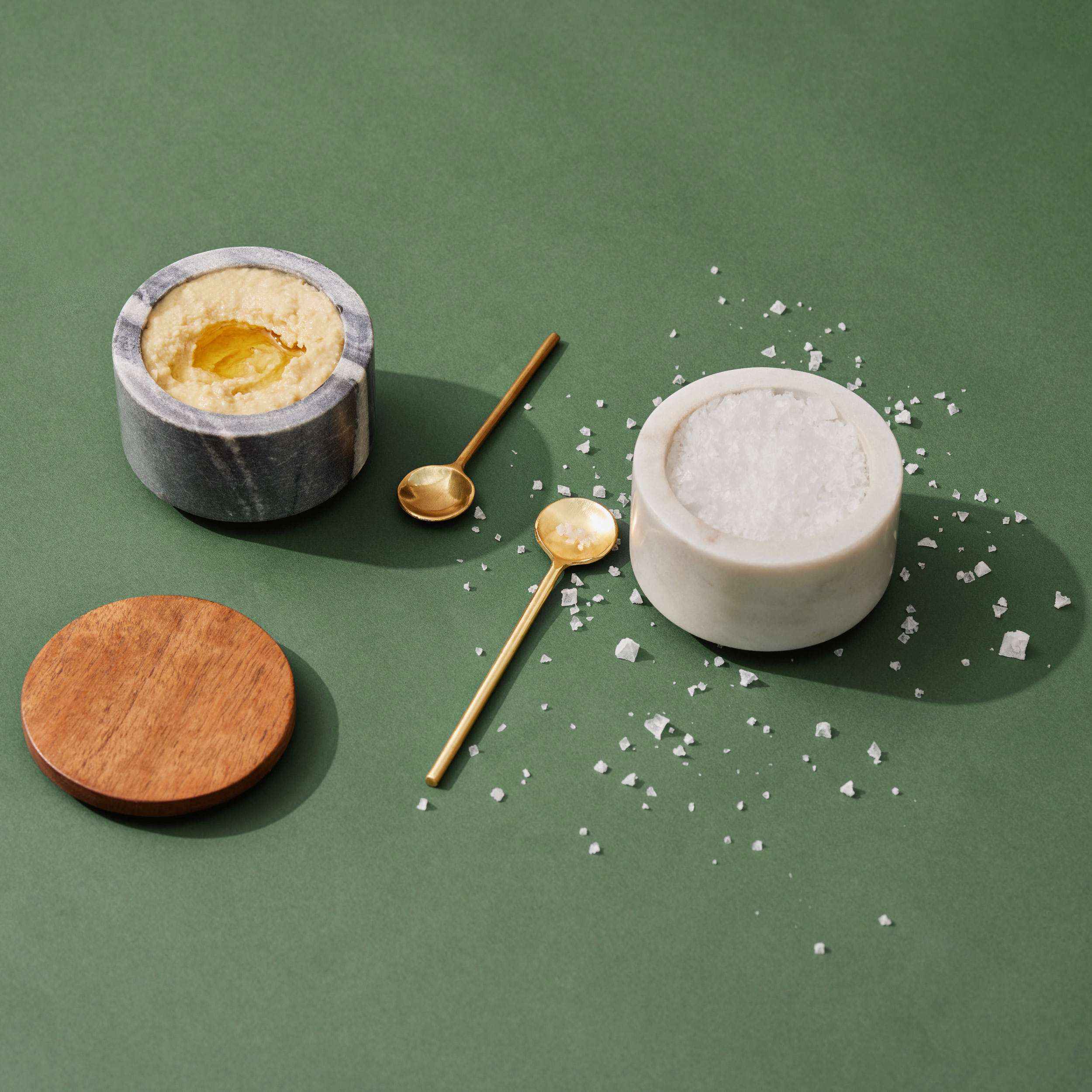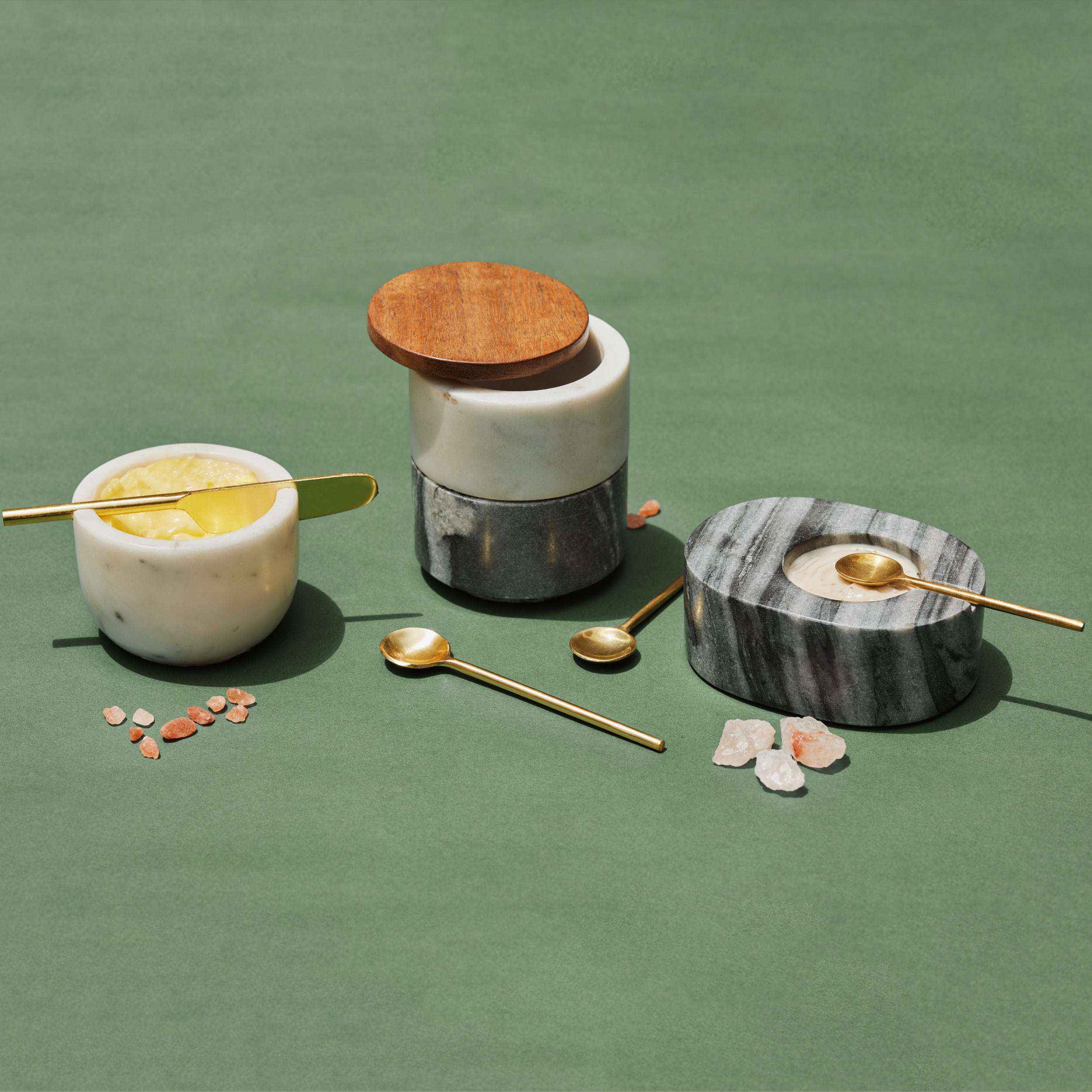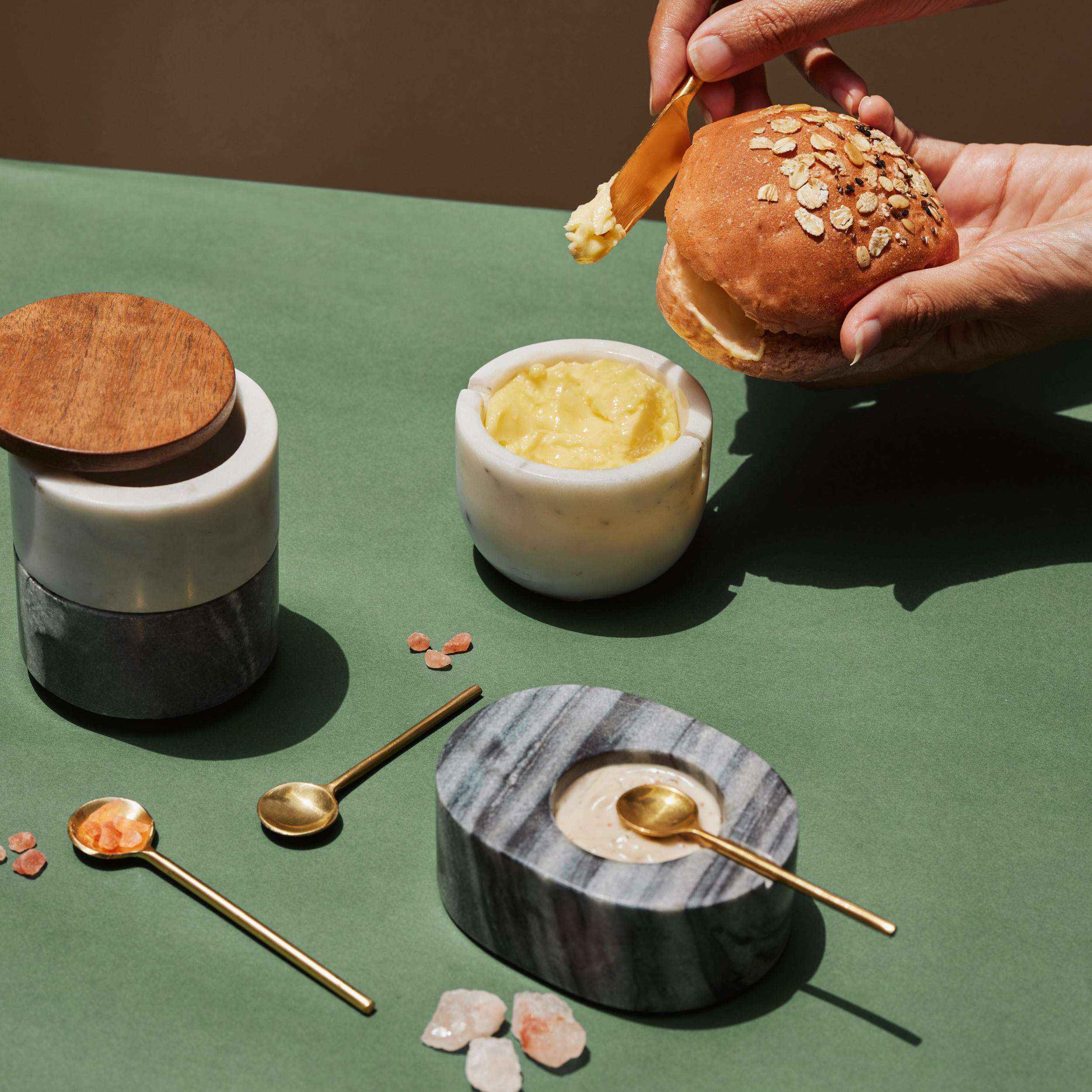 "Store and serve in style - No need to always look for somthing pretty to serve your dips, sauces or condiments in, the answer will now always be in your fridge. - Stackable design creates height on your table - comes with wooden lid and metal spoon to complete the look"