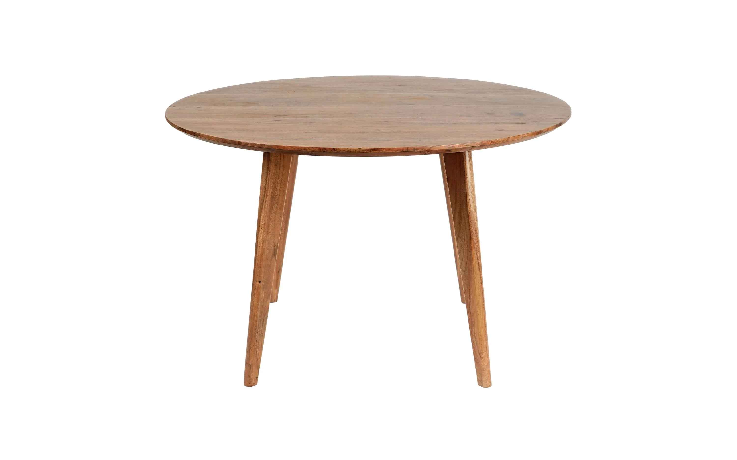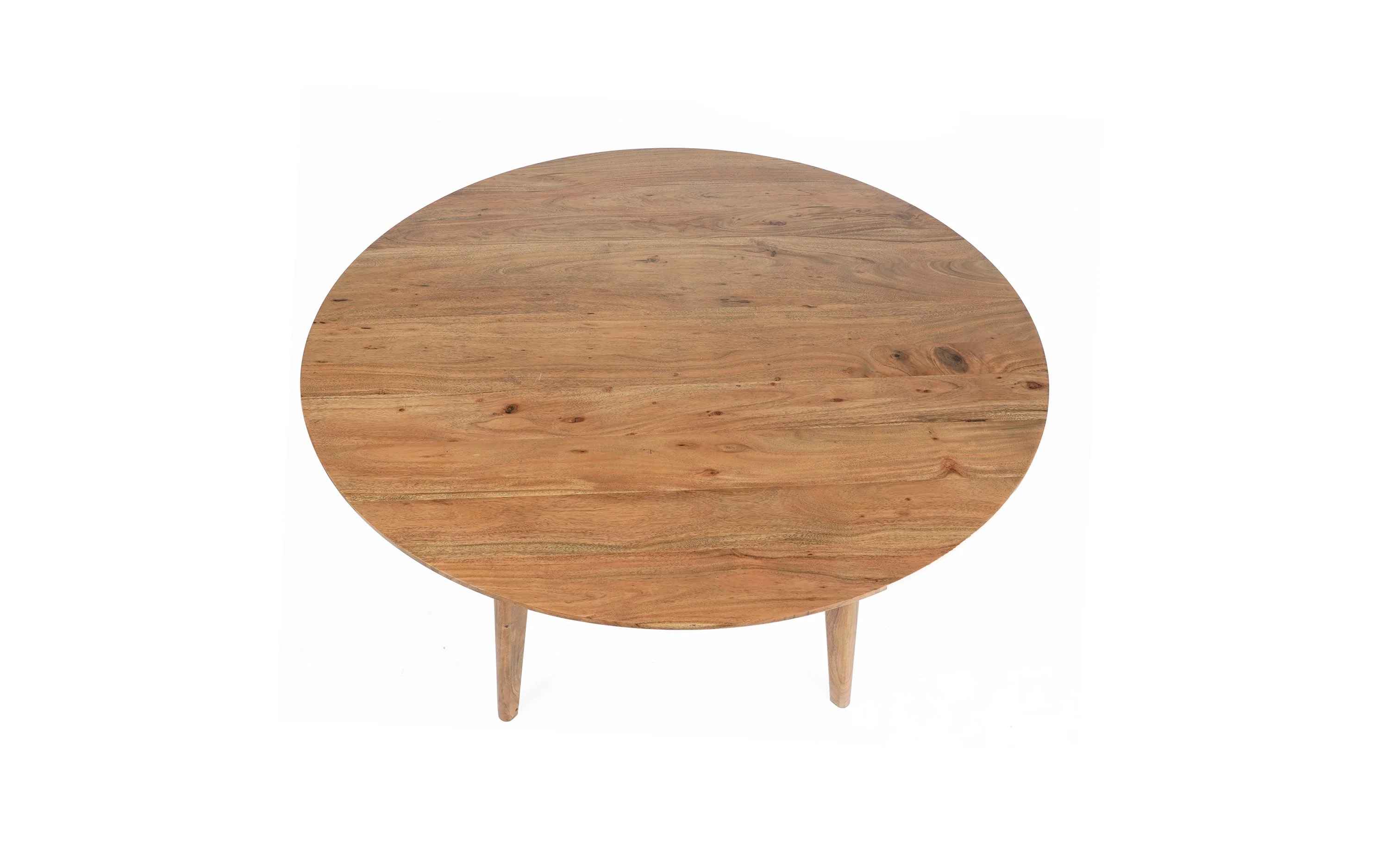 Our 1960s-inspired Sugoi dining table round recalls the timelessness of mid-century design with a tailored profile and streamlined shape. The tables base is beautifully crafted base made of sustainably sourced hardwood in natural finish. The base is both geometric and organic, showcasing rounded edges and tapered flange legs . No harmful chemicals or toxins are used in our furniture. Natural eco-friendly lacquers are used that helps in sustaining a healthy lifestyle. "Depending on your screen settings and resolution on your device there may be a slight variance in fabric color and wood polish of the image and actual product. Wood grains will vary from product to product in case of solid wood furniture."