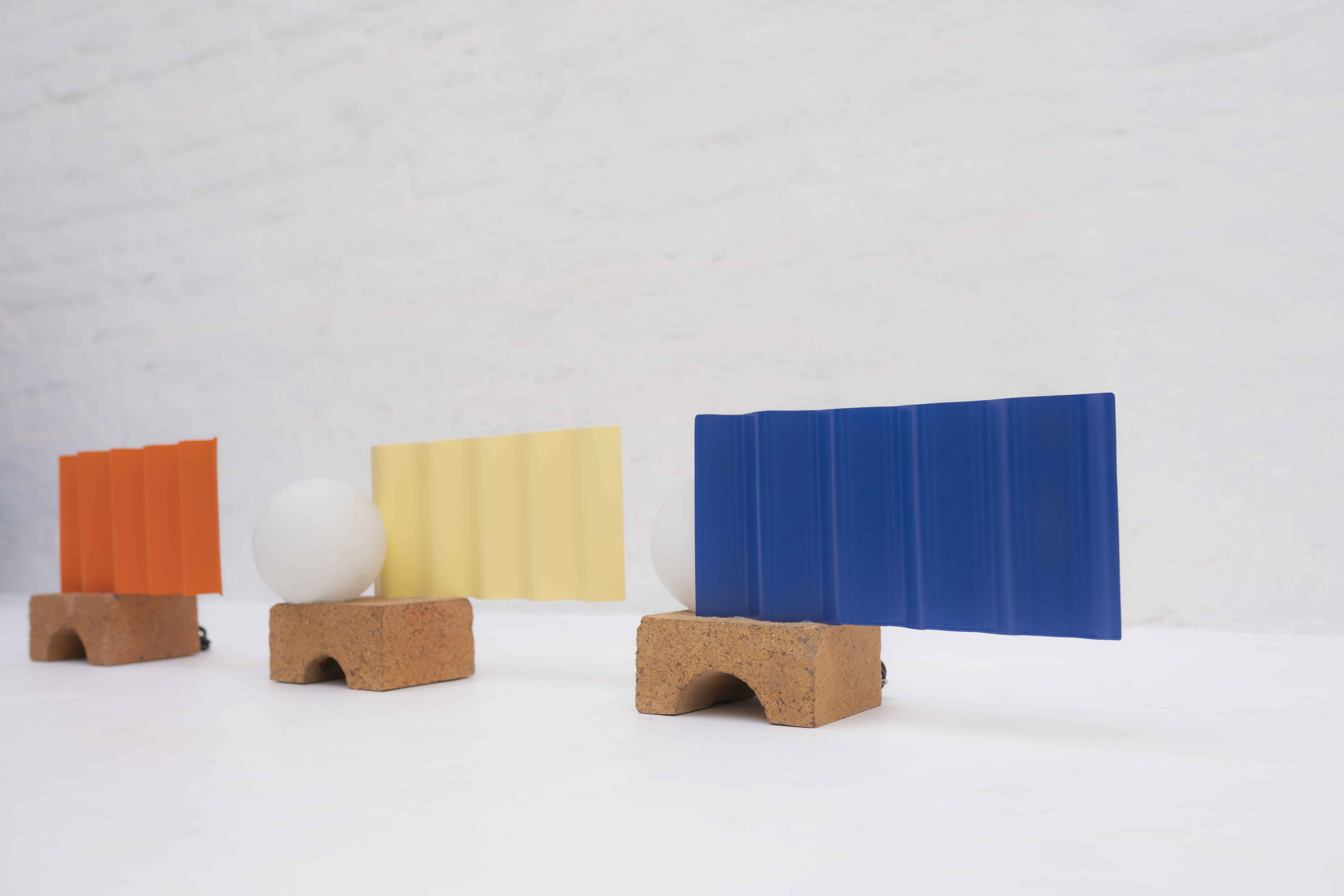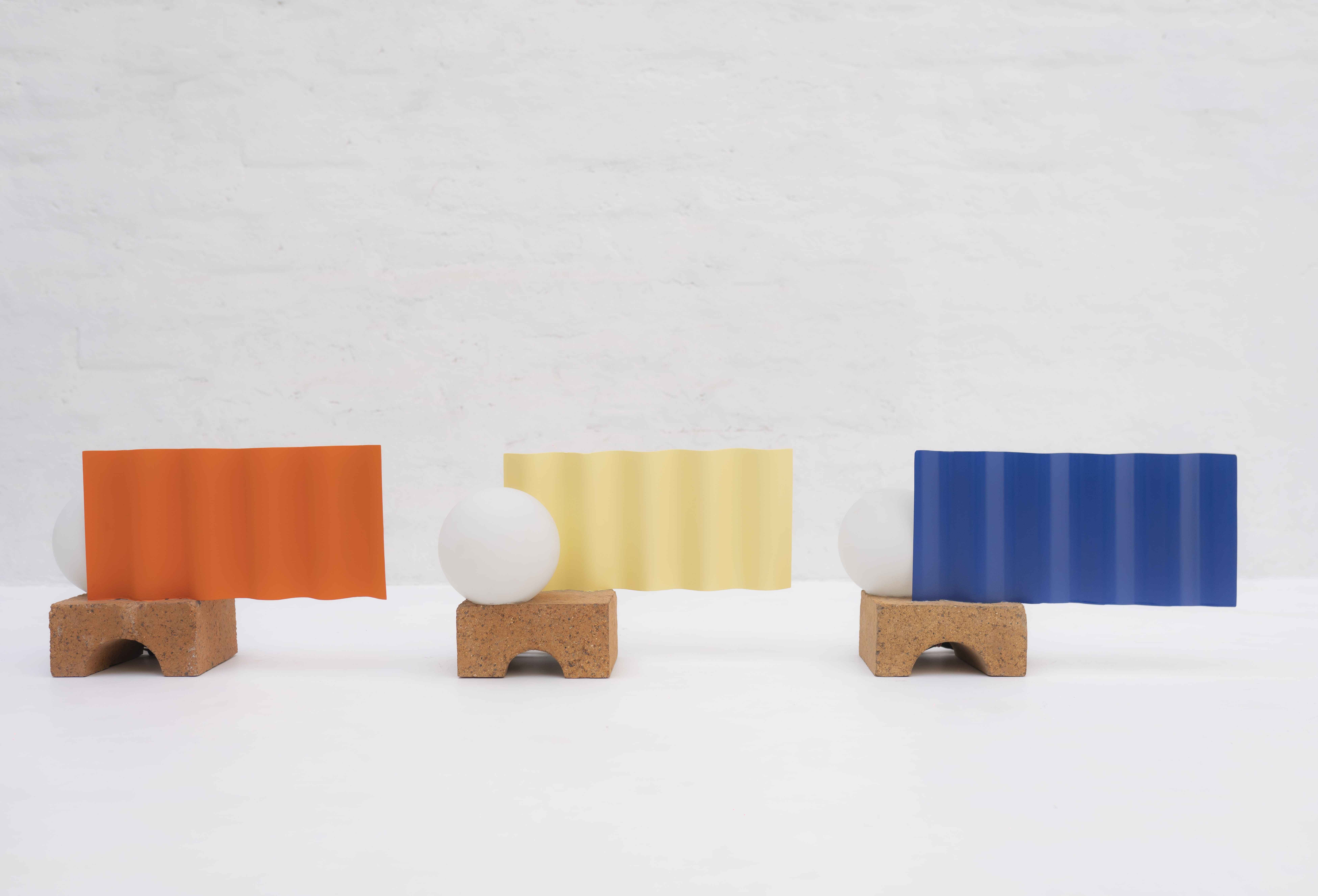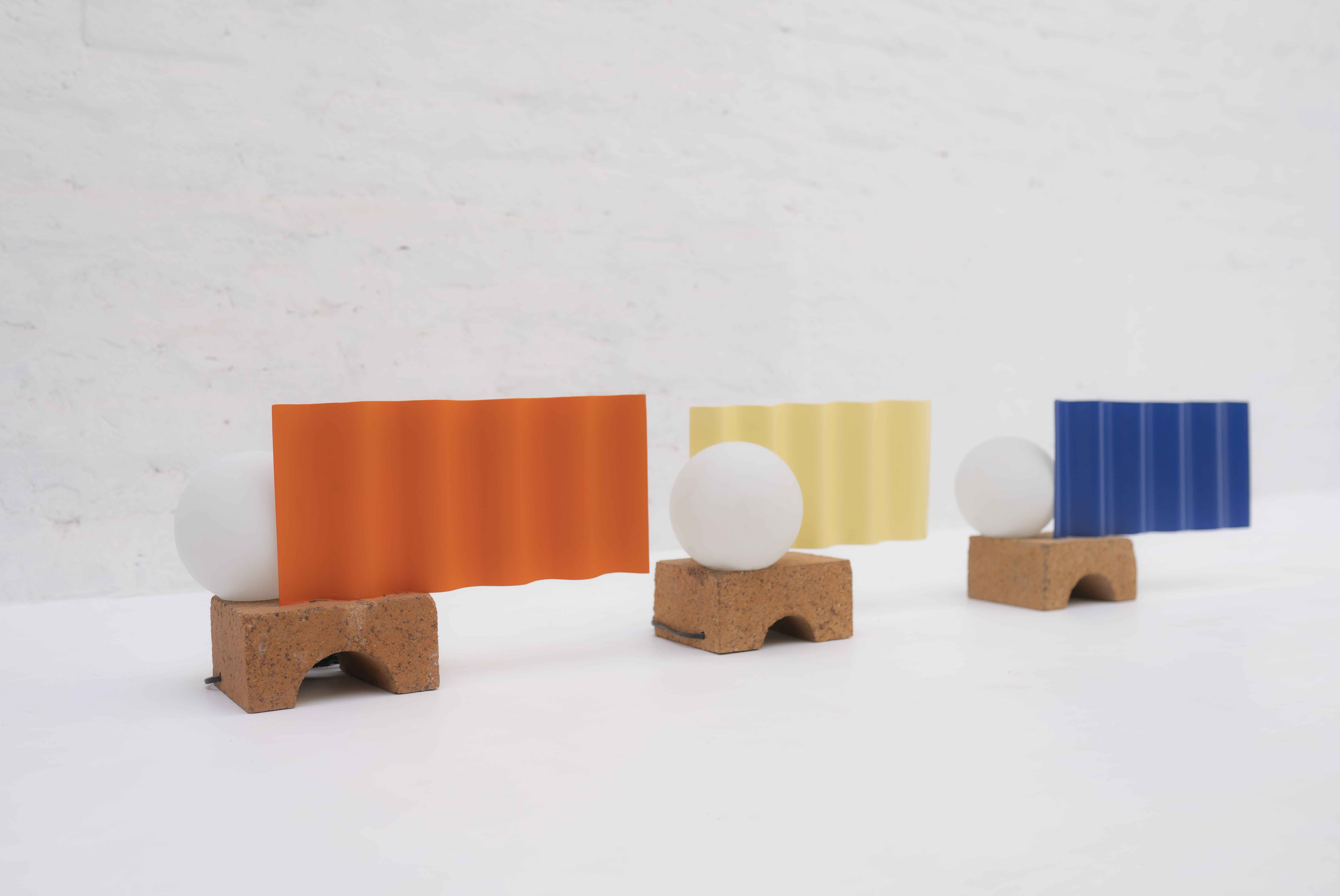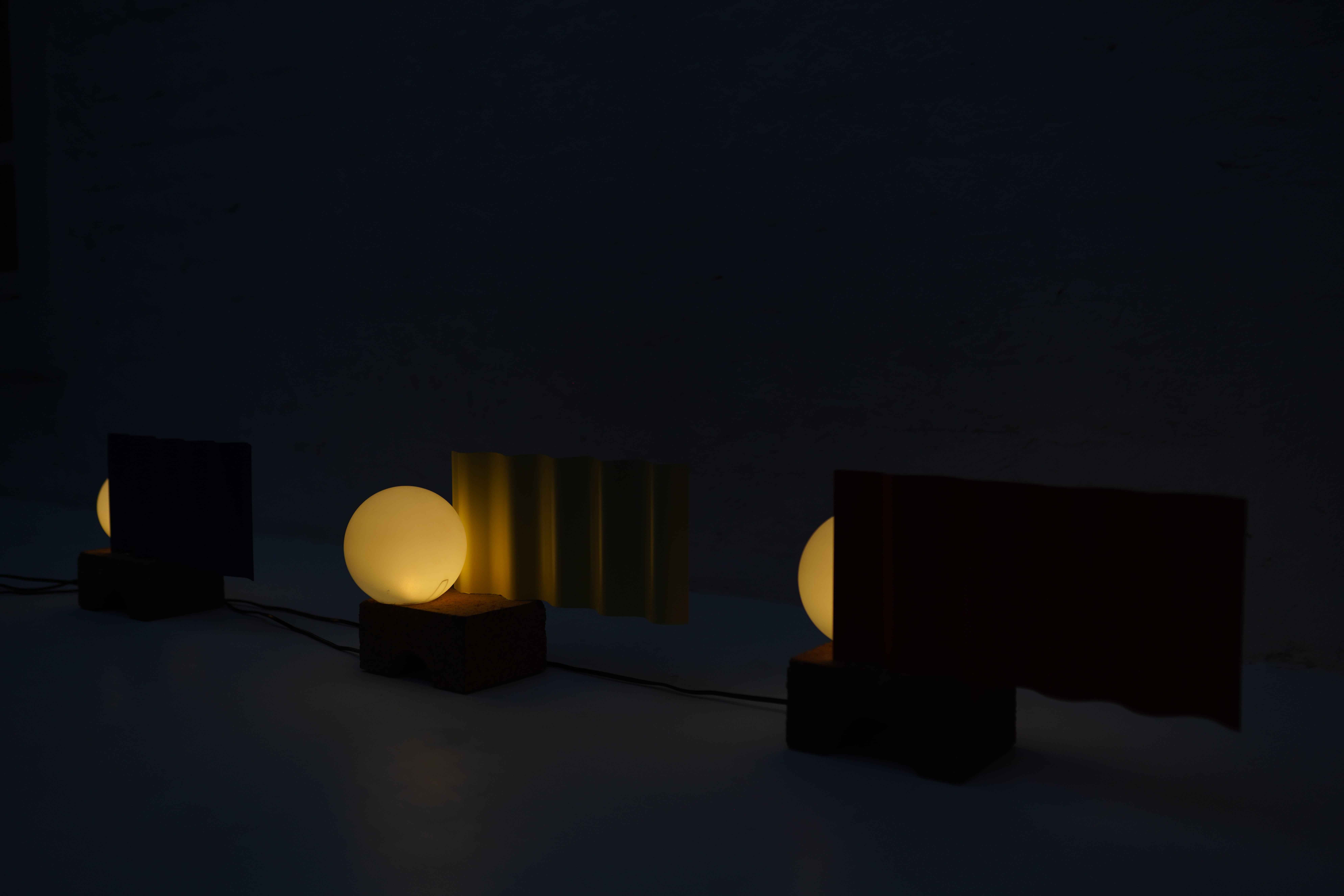A table lamp made of corrugated metal sheet and a dome lamp balanced on a upcyled furnace brick. All of the pieces are arranged in such a way that it resembles a superman dog wearing a brightly coloured cape.