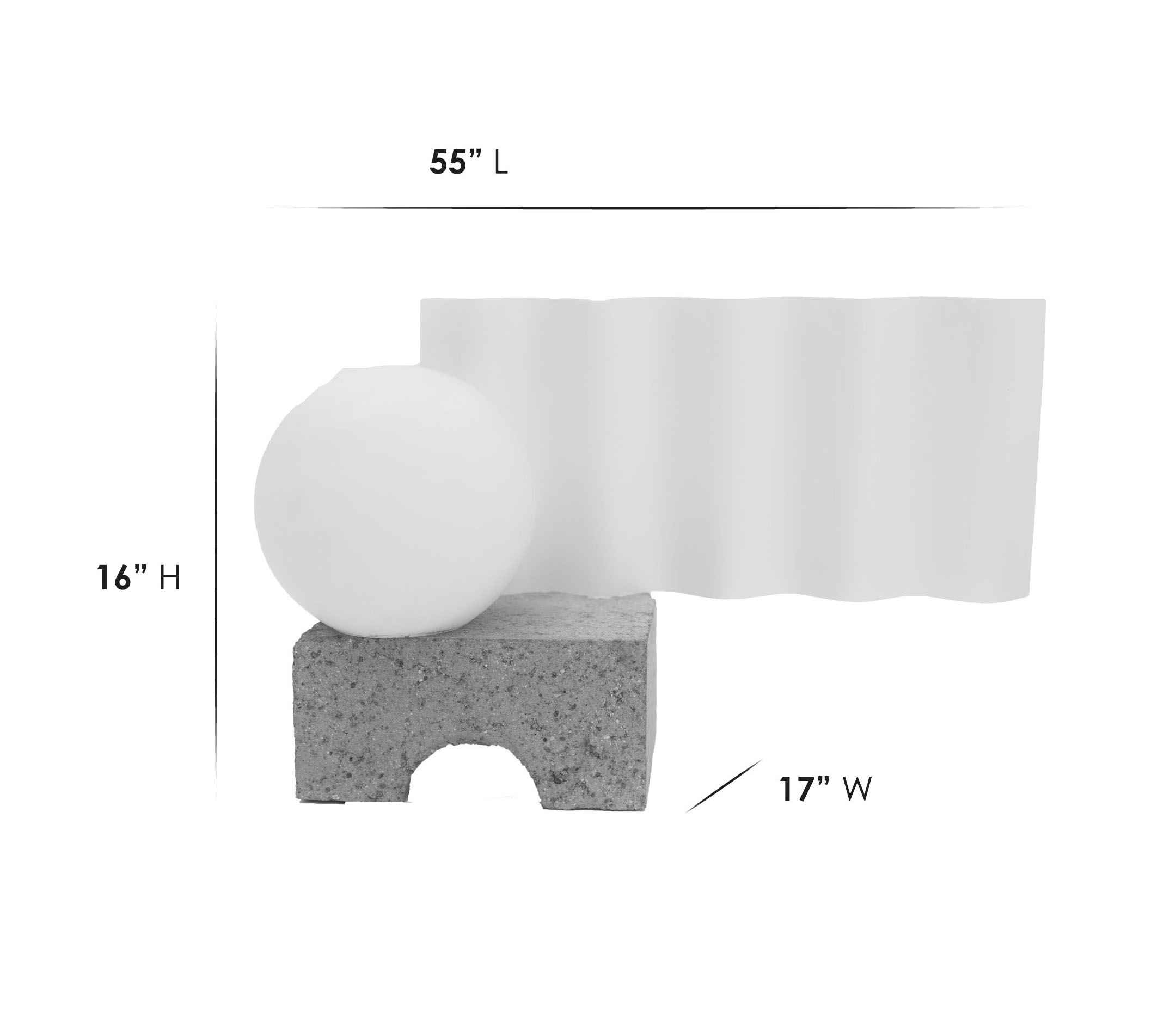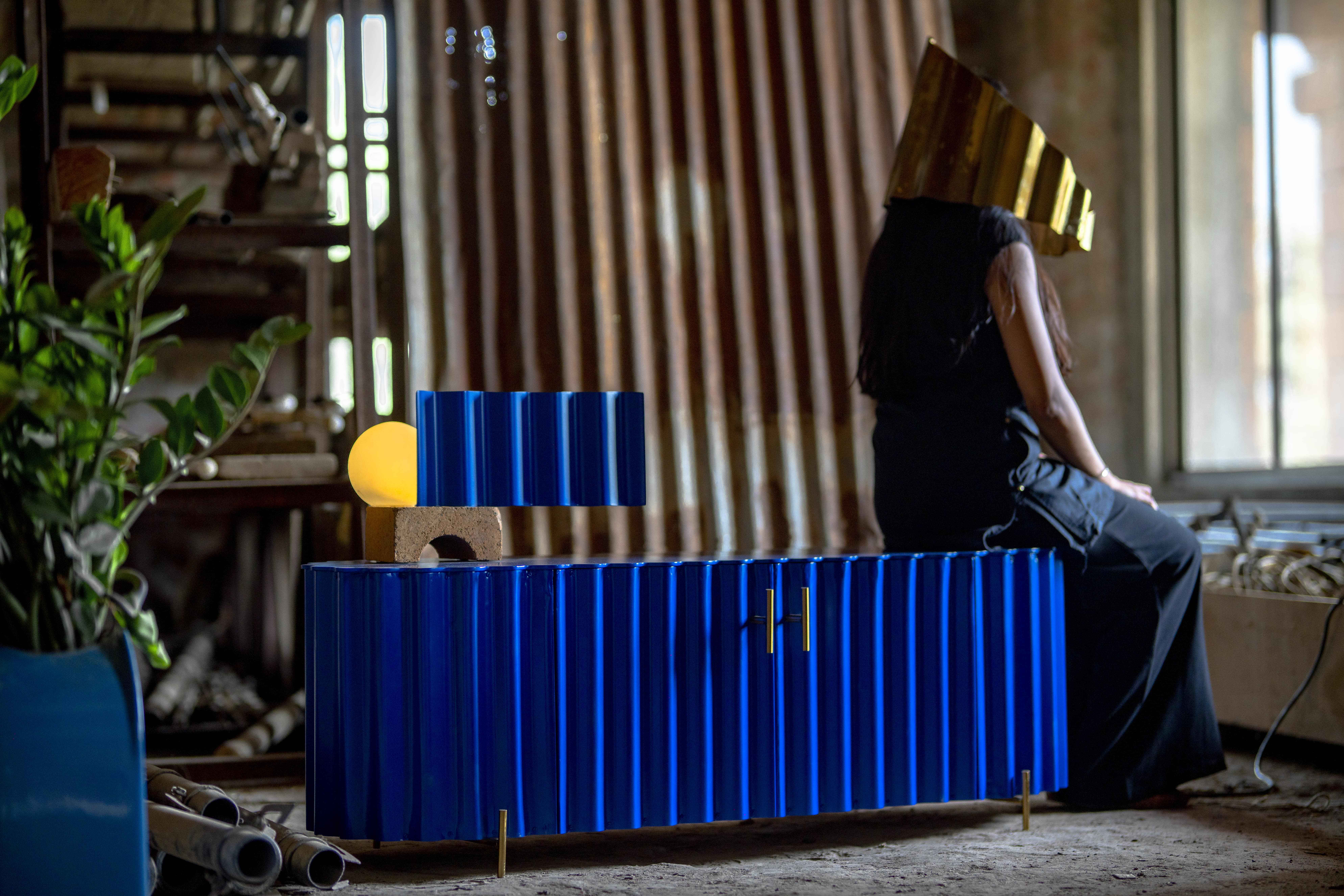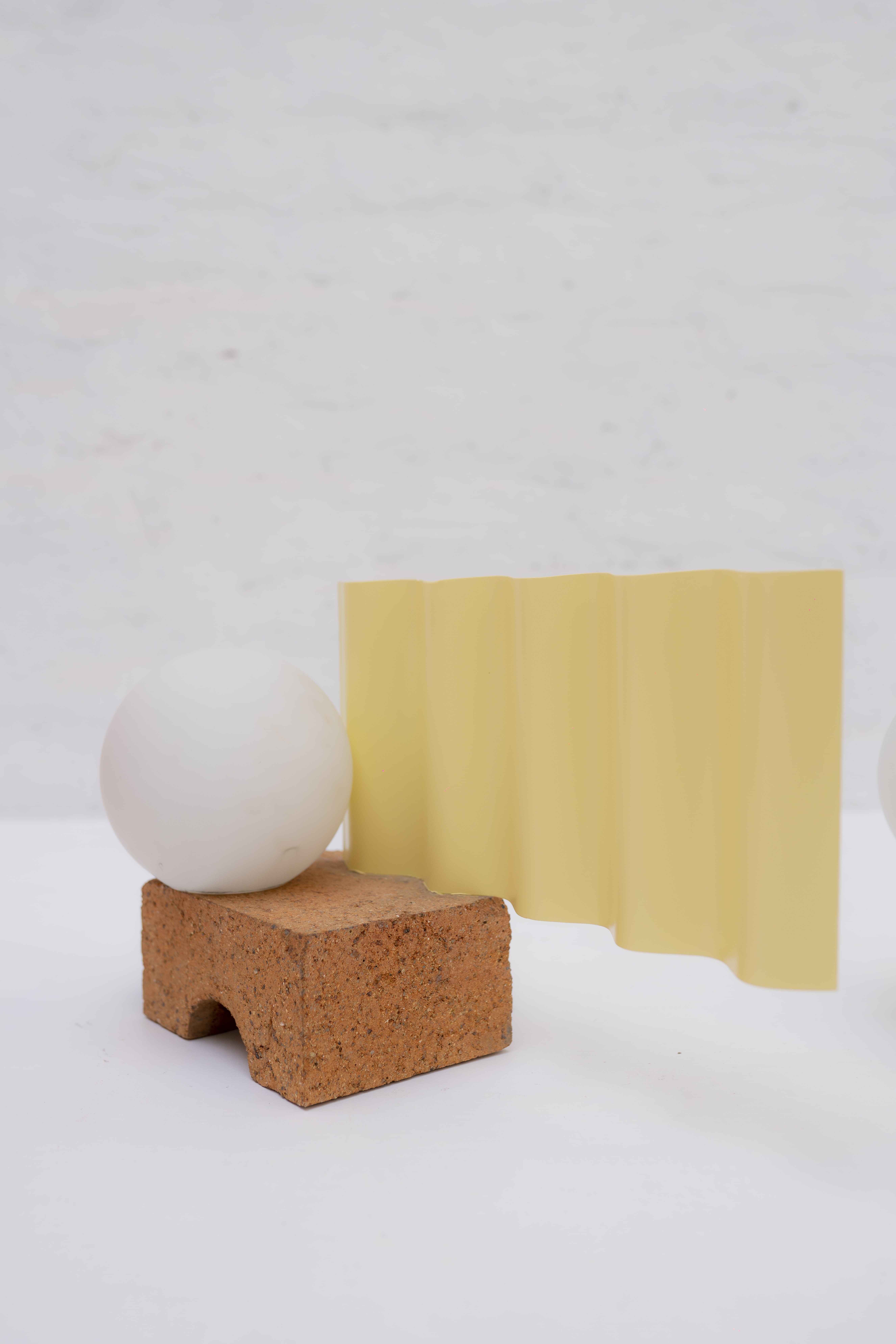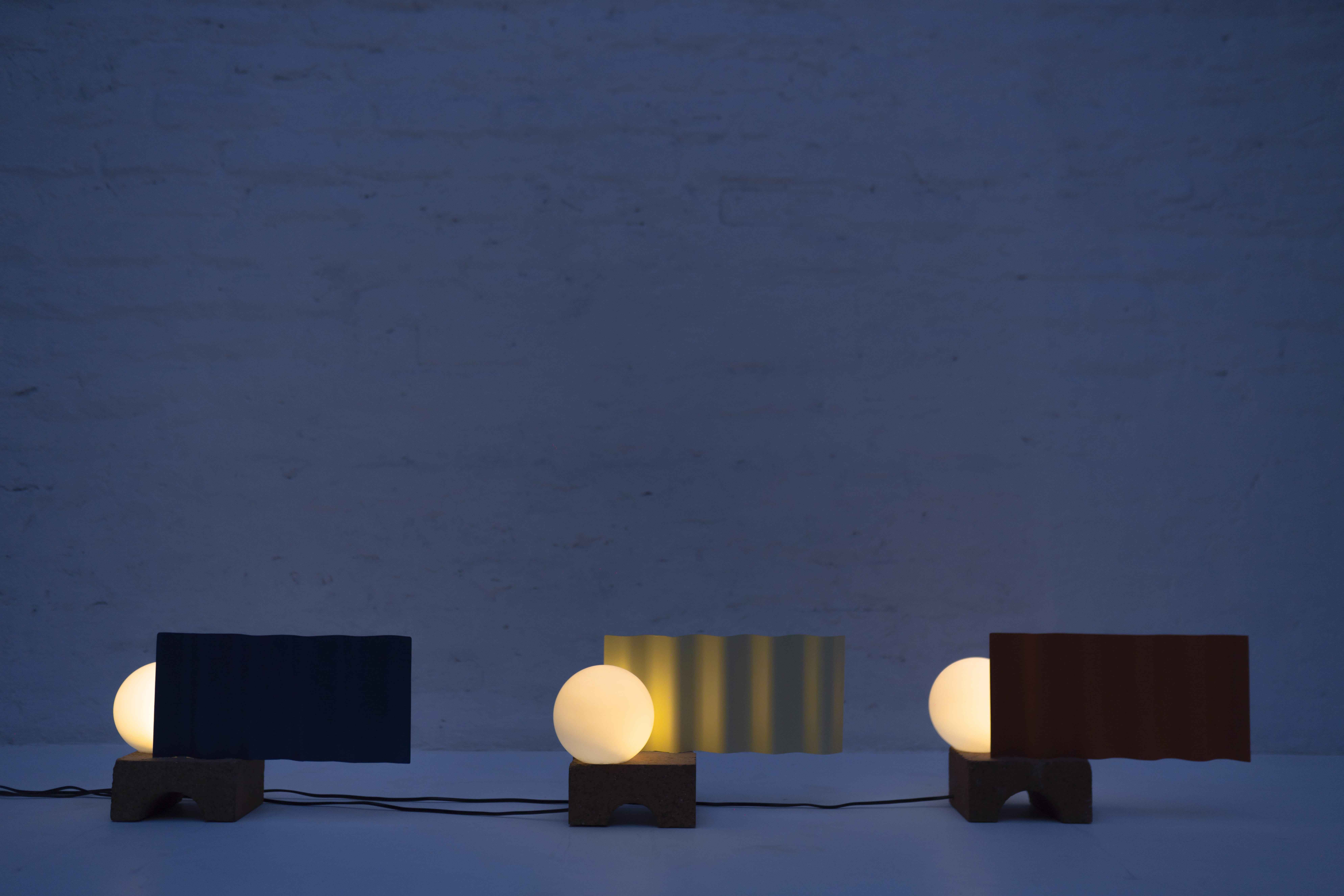 A table lamp made of corrugated metal sheet and a dome lamp balanced on a upcyled furnace brick. All of the pieces are arranged in such a way that it resembles a superman dog wearing a brightly coloured cape.