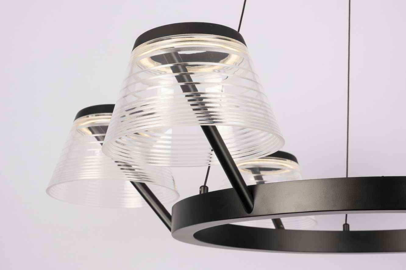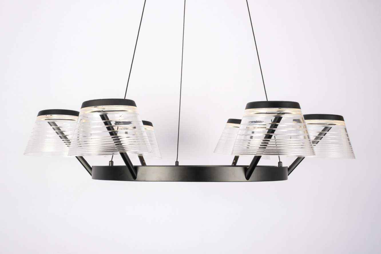 This six-light island pendant lights up a room in style with its no-nonsense glamour and stately appeal. Elegant clear seeded arcylic shades are affixed to a long cirular metalic frame and suspended from a circular canopy.