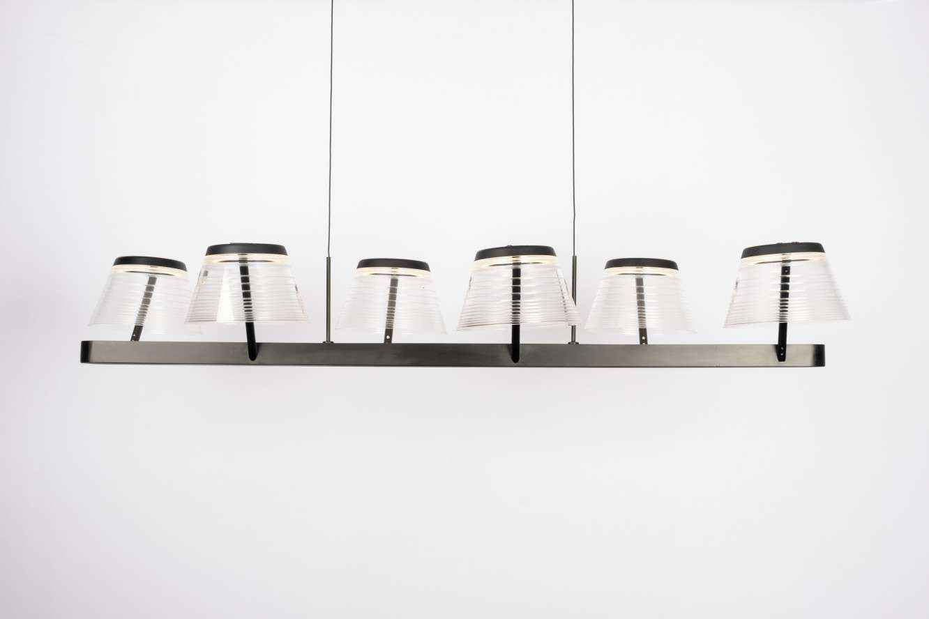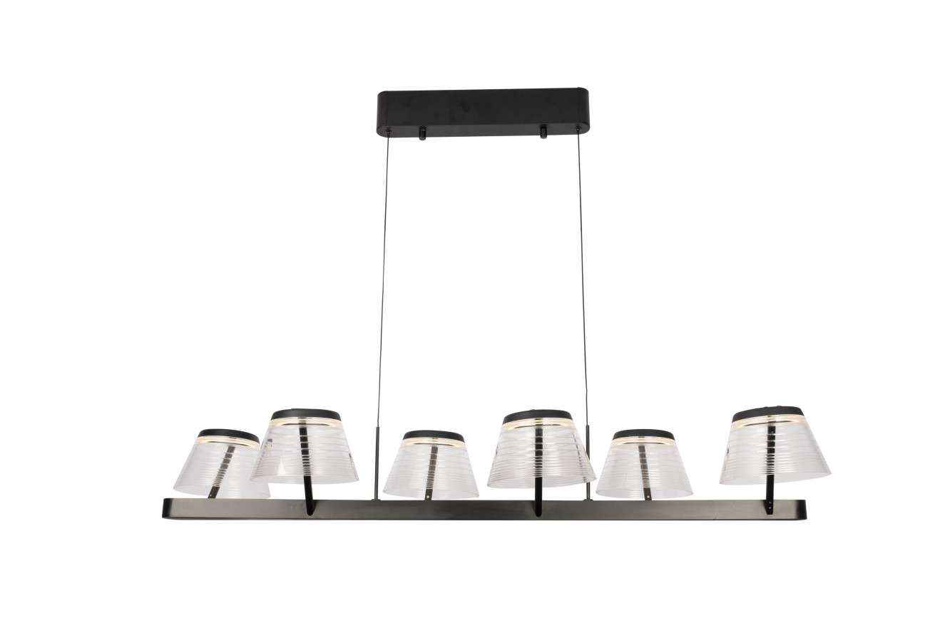 This six-light island pendant lights up a room in style with its no-nonsense glamour and stately appeal. Elegant clear seeded arcylic shades are affixed to a long linear metalic frame.