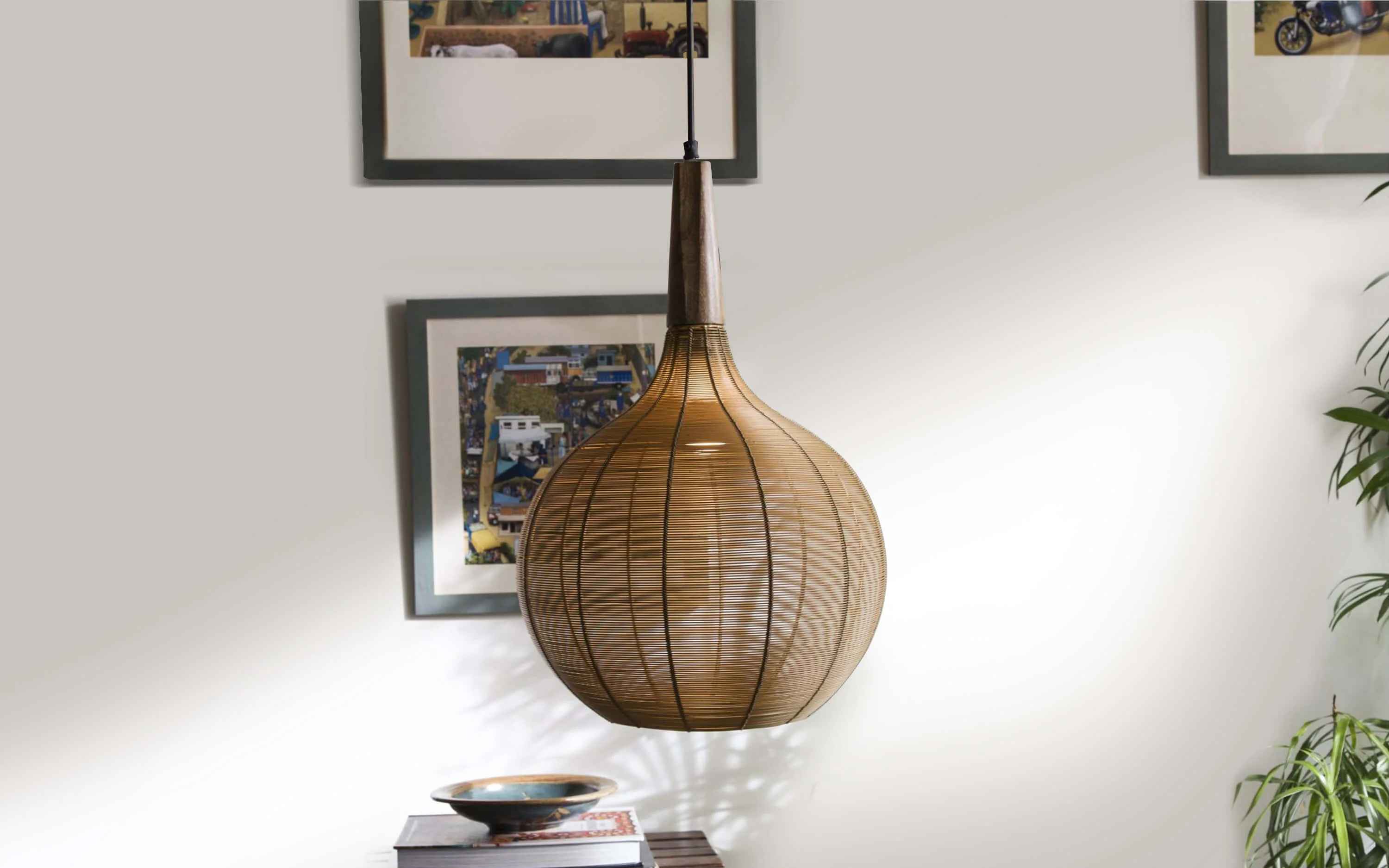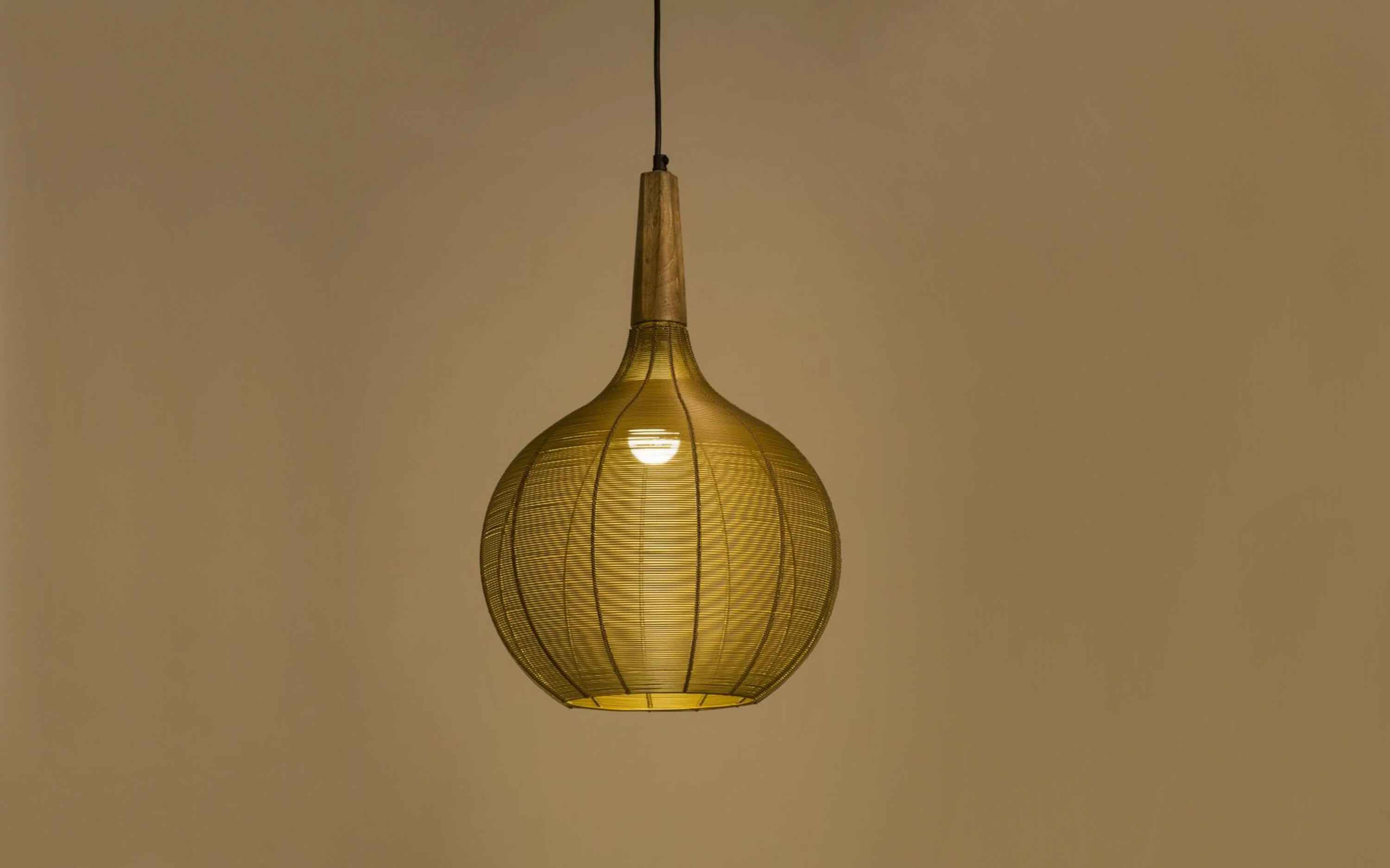 Intricately woven from metal wire with wooden canapy, parasol-shaped lightshade is inspired by Scandinavian style. The fabric shade on the inside hides the sharp light from the bulb within and makes it perfect for ambient lighting. Tappa Drop Hanging Lamp casts a warm and inviting glow in any space. This natural finish mango wood and gold finish iron lamp features an off-white cotton shade for a touch of elegance. Perfect for hanging in a living room, bedroom, office, or dining room, this lamp is sure to brighten up your space. "Depending on your screen settings and resolution on your device there may be a slight variance in fabric color and wood polish of the image and actual product. Wood grains will vary from product to product in case of solid wood furniture."