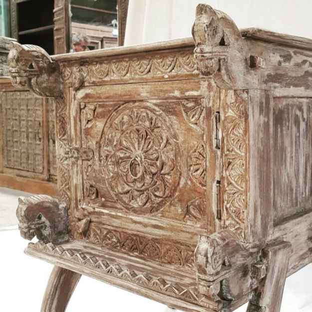 The Malhar, solid wooden bedside table given a rustic and distressed brown finish handcarved by skilled artisans. This exquisite vanity table or night stand has 1 shelf for small storage such as fabrics or furnishings with intricate mandala carvings and horse head design inspired from the Mughal era floral art. This beautiful art originates from centuries back which the mughal rulers brought to Indian from Persia. The exceptional art gives your interiors a rustic and vintage look with finish in antique white and brown color. This unique cabinet would look fabulous in your entryway, bathroom, living room, dining area and bring your interiors alive with the rustic and vintage feel. This beautiful cabinet is handmade on order.