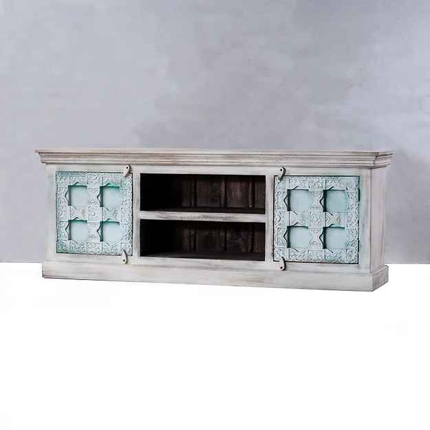 The Paresa, solid wooden storage cabinet in a rustic and distressed white, brown and blue finish handcarved by skilled artisans. This exquisite full size cabinet has 2 drawers and 2 shelves with intricate abstract cosmos inspired carvings from the Mughal era. This beautiful art originates from centuries back which the mughal rulers brought to Indian from Persia. The exceptional art gives your interiors a rustic and vintage vibe and a stylish look. This unique cabinet would look fabulous in your entryway, living room, dining area and bring your interiors alive with the rustic and vintage feel. This cabinet is usually used as a TV unit cabinet and gives an antique vibe to your living area. This beautiful cabinet is handmade on order. It has 2 vertically divided shelves in middle and 2 drawers on each side.