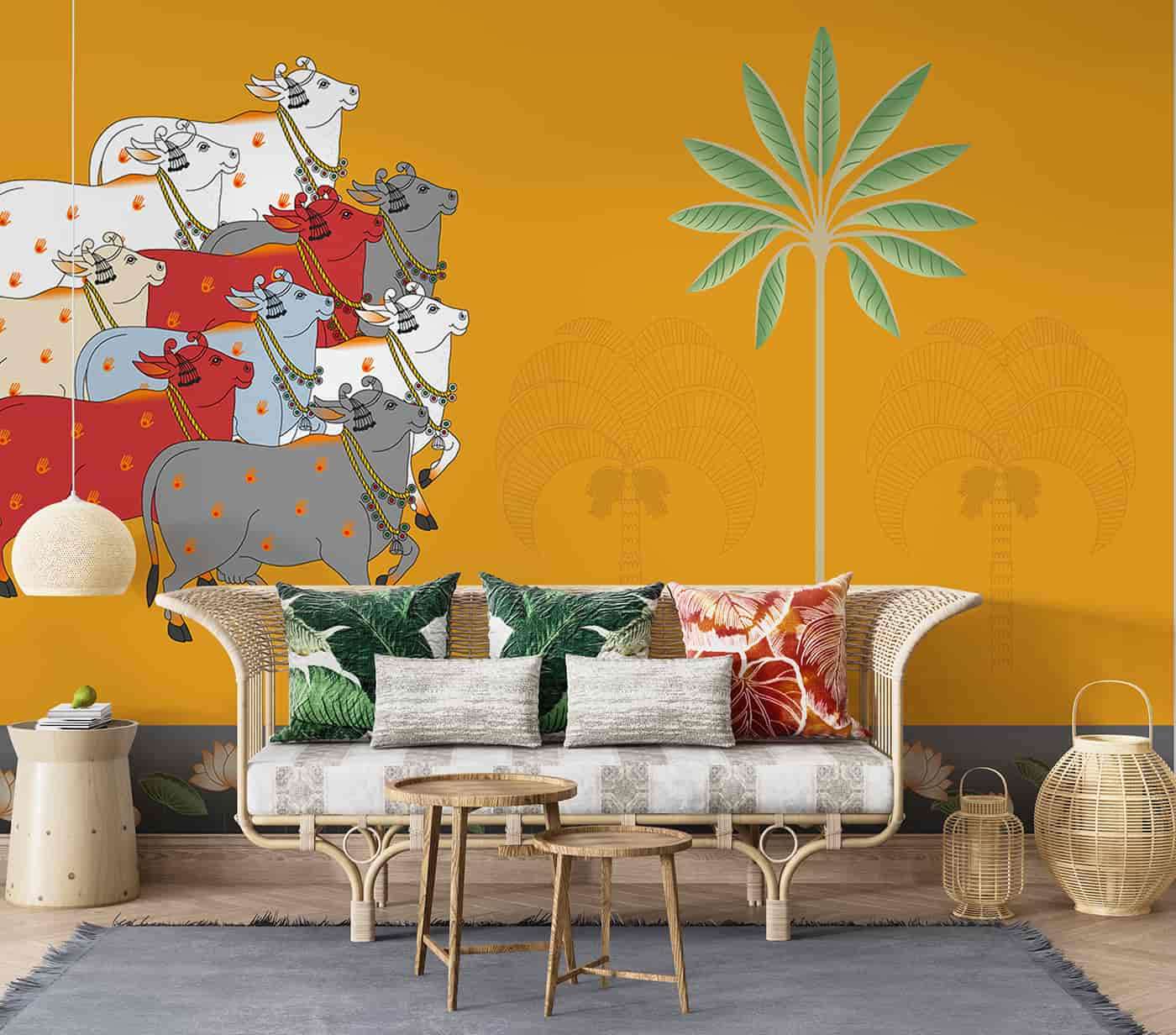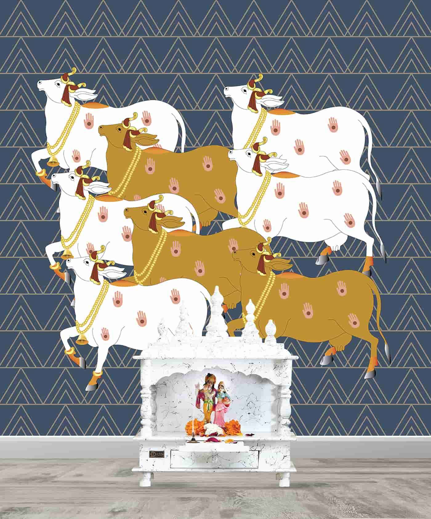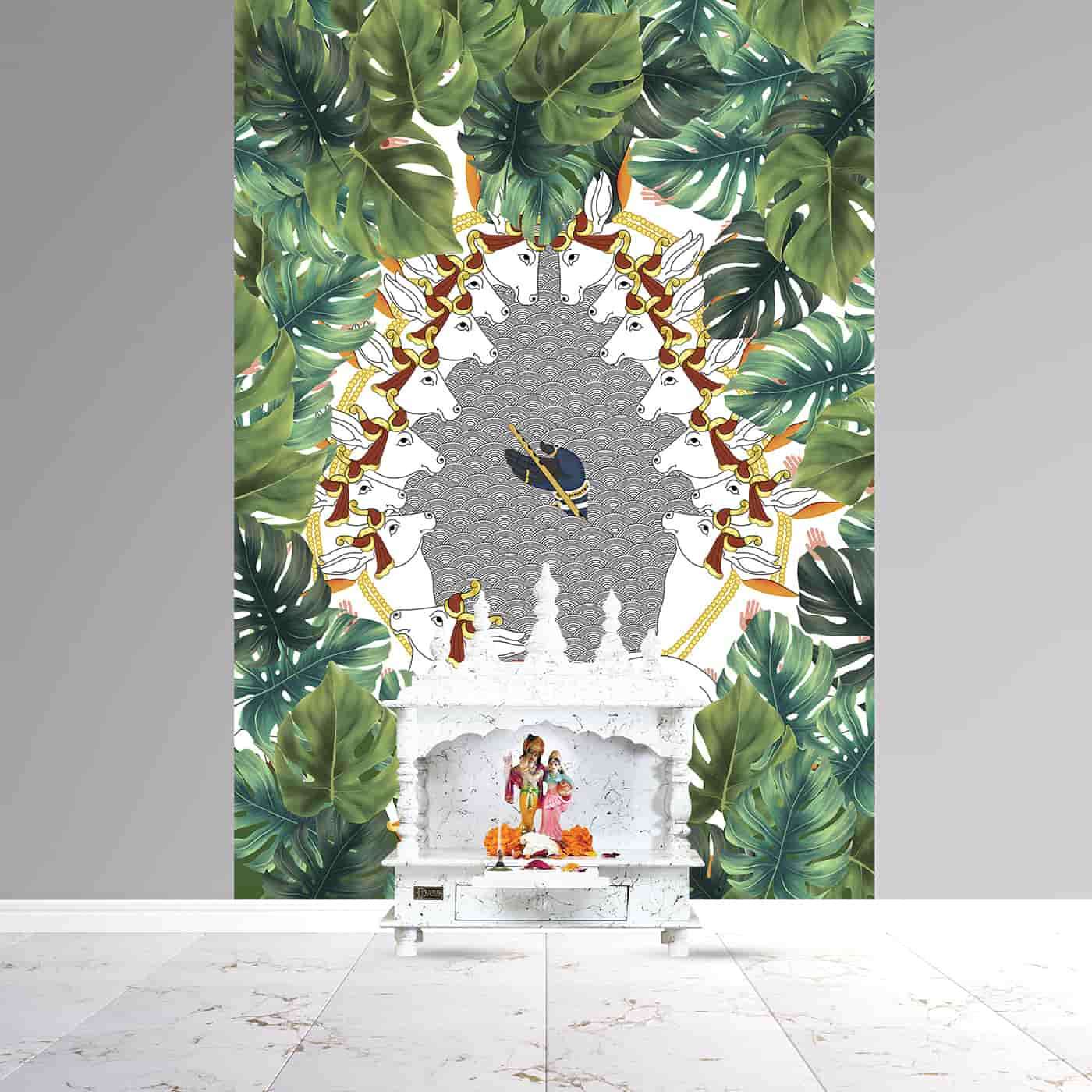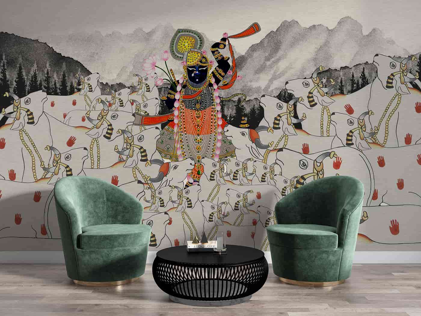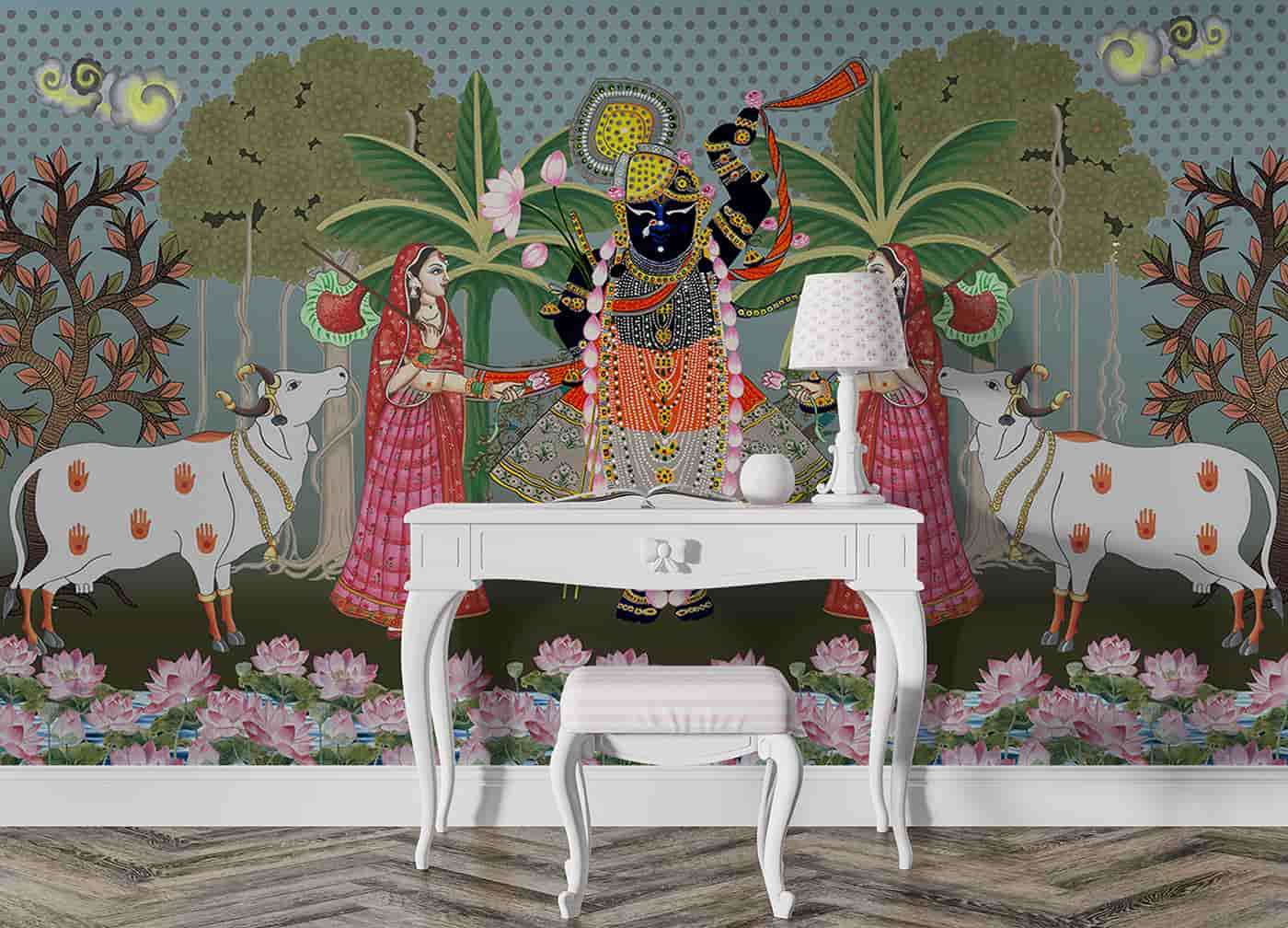 Pichwai or Pichvai is a style of painting that originated over 400 years ago, in the town of Nathdwara near Udiapur, India.The word Pichwai comes from 'pichh' meaning back, and 'wai', meaning textile hanging. Originally, pichwai paintings were used to decorate the temple of Krishna/Shrinathji in Nathdwara,Rajasthan, India. Intricate and visually appealing Pichwai paintings, originally made on cloth, were hung behind the deity to celebrate different seasons, festivals and events in Lord Krishna's life. The purpose of Pichwais other than artistic appeal is to narrate tales of Krishna to the illiterate. Over time, pichwais have found a place in the homes of art connoisseurs, owing to their visual appeal. We have put in efforts to recreate this dying art form and present it to the world. All our murals are custom-made to fit your wall?s dimensions and they are all supplied in panels. Every wallpaper mural we produce is unique to you. We don?t hold stock.