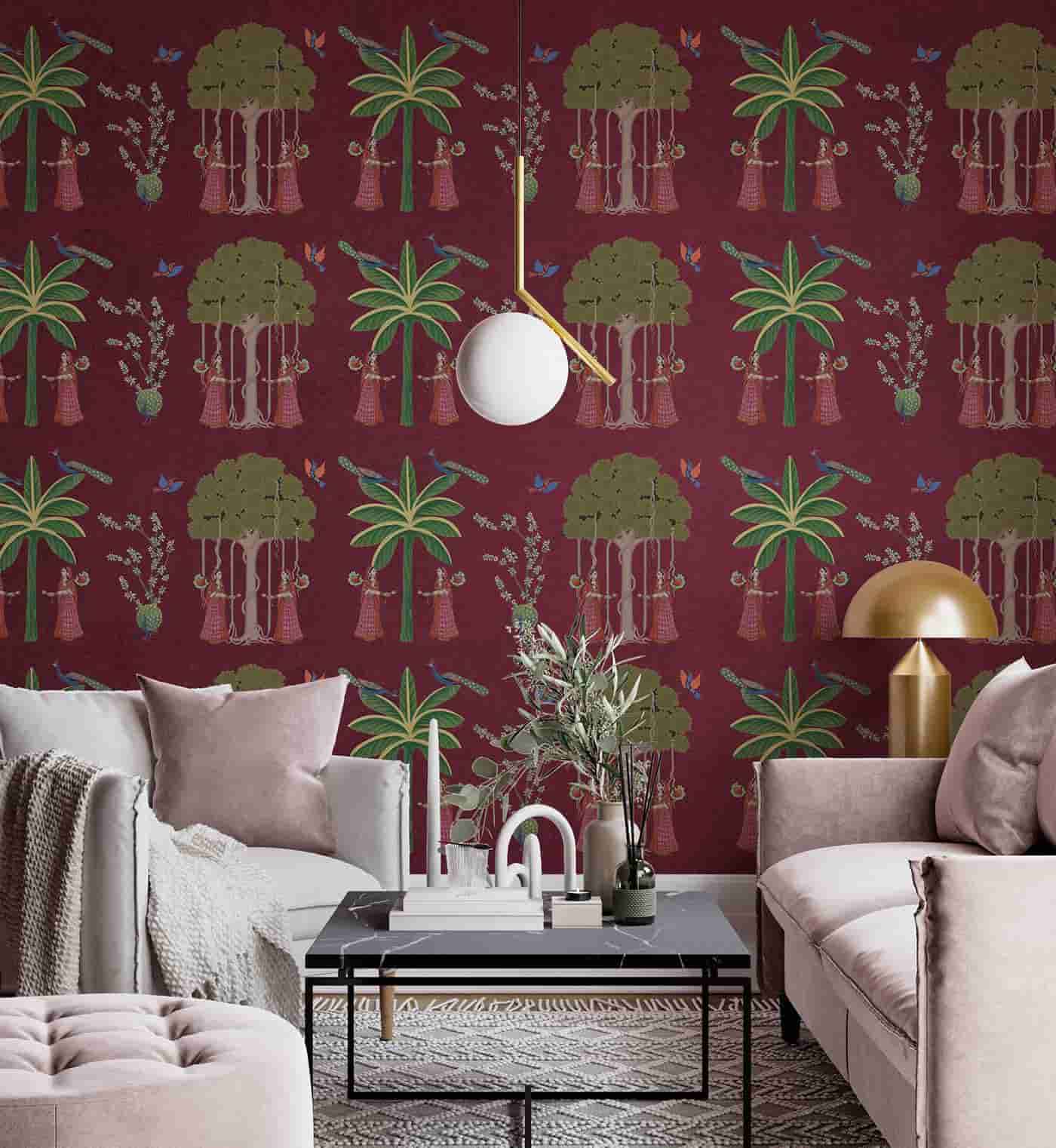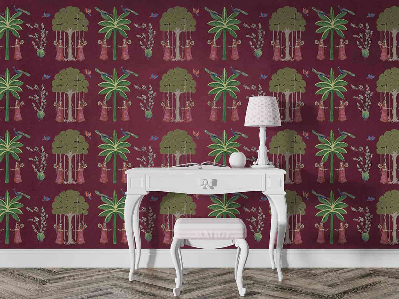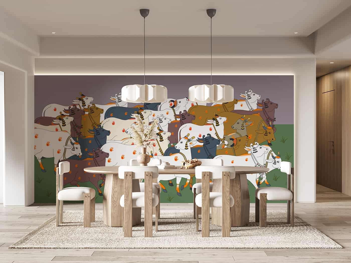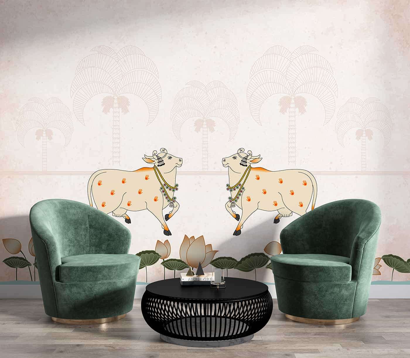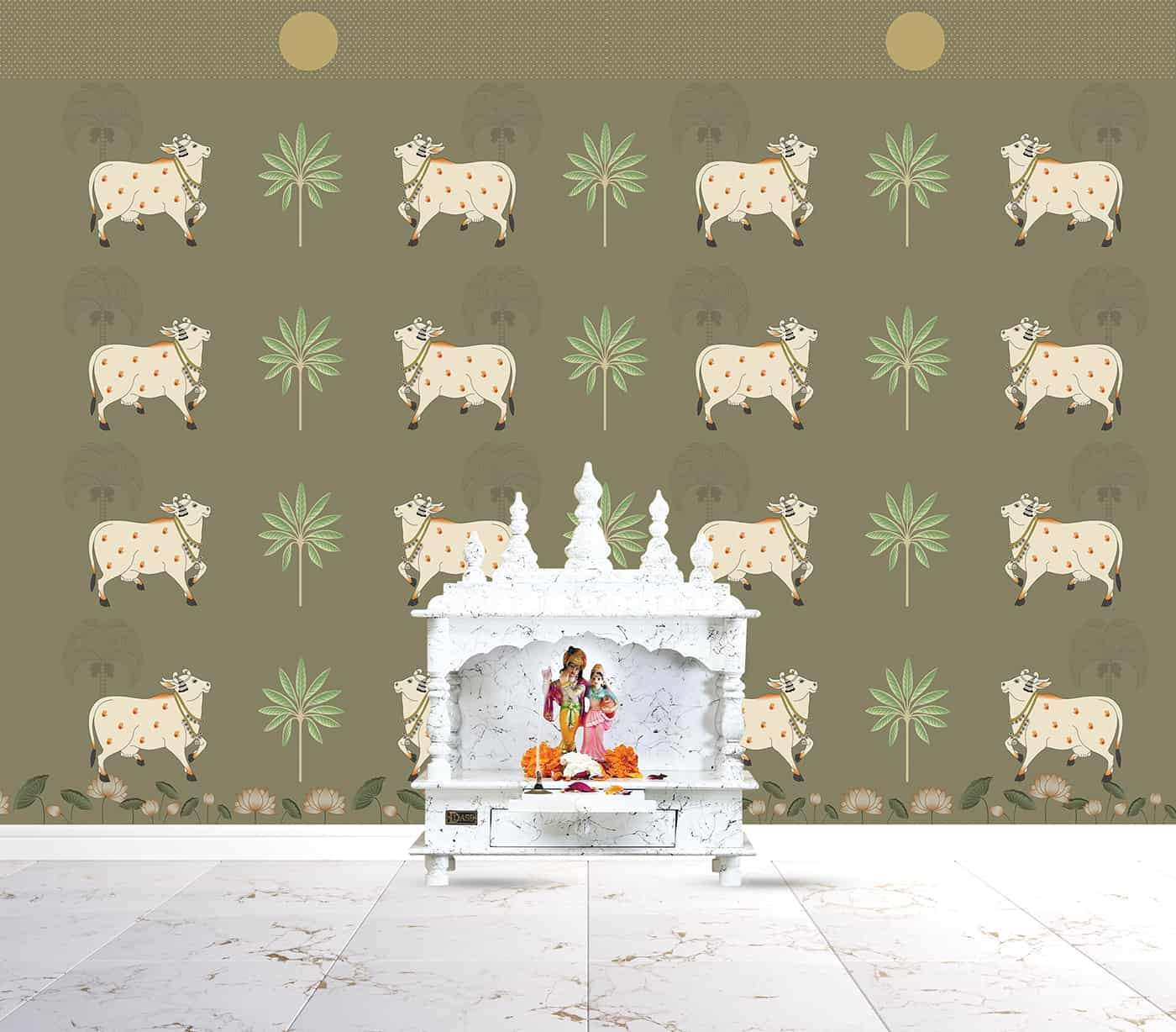 Pichwai or Pichvai is a style of painting that originated over 400 years ago, in the town of Nathdwara near Udiapur, India.The word Pichwai comes from 'pichh' meaning back, and 'wai', meaning textile hanging. Originally, pichwai paintings were used to decorate the temple of Krishna/Shrinathji in Nathdwara,Rajasthan, India. Intricate and visually appealing Pichwai paintings, originally made on cloth, were hung behind the deity to celebrate different seasons, festivals and events in Lord Krishna's life. The purpose of Pichwais other than artistic appeal is to narrate tales of Krishna to the illiterate. Over time, pichwais have found a place in the homes of art connoisseurs, owing to their visual appeal. We have put in efforts to recreate this dying art form and present it to the world. All our murals are custom-made to fit your wall?s dimensions and they are all supplied in panels. Every wallpaper mural we produce is unique to you. We don?t hold stock.