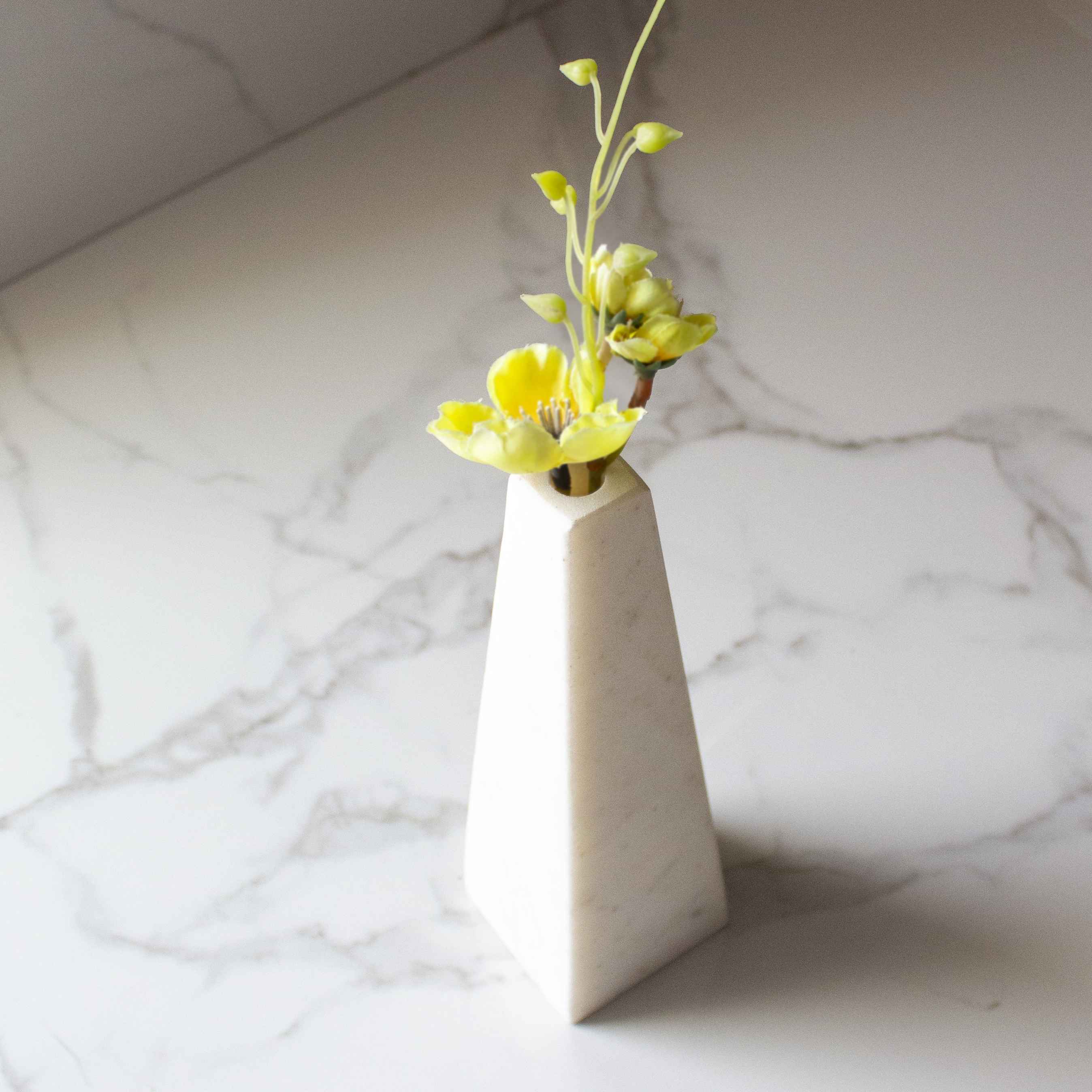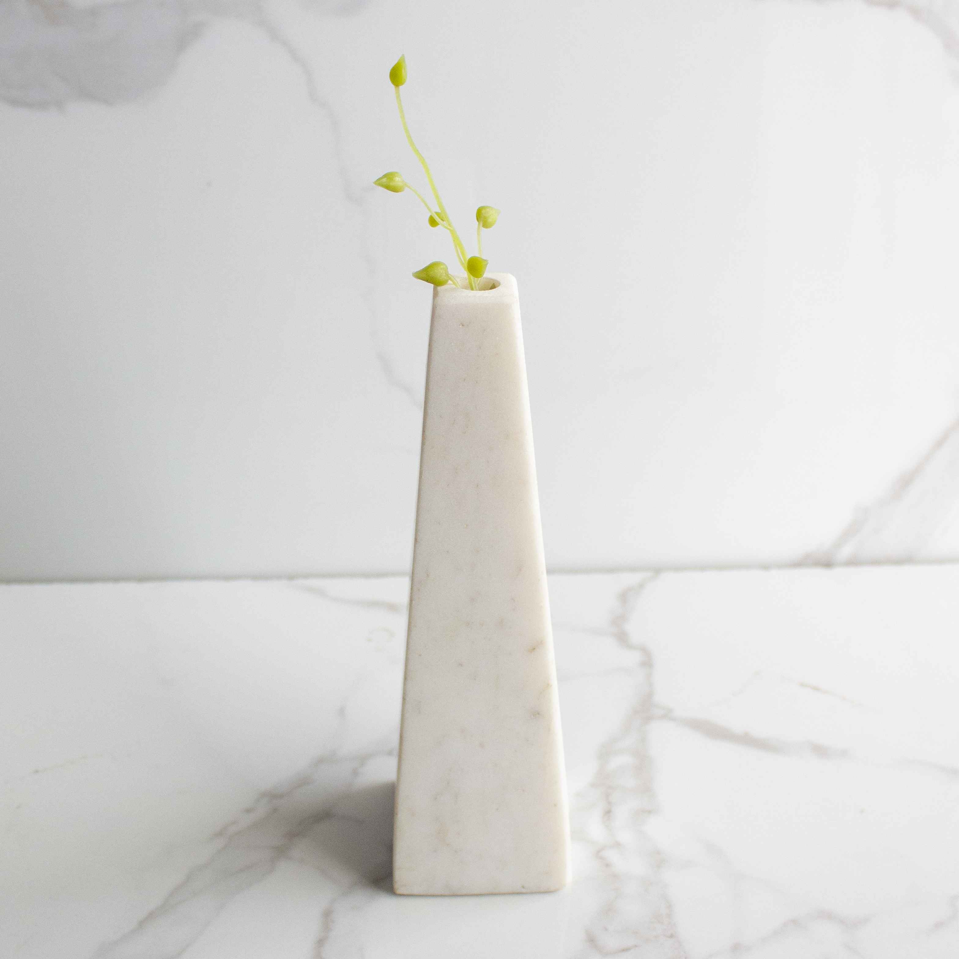 This Truncated Pyramid Vase will give a contemporary appeal to your dining room. Hand-cut and carved into a refined vase. Each piece is buffed and sanded to reveal the natural luster of marble. It can be paired with real or artificial scented flowers.