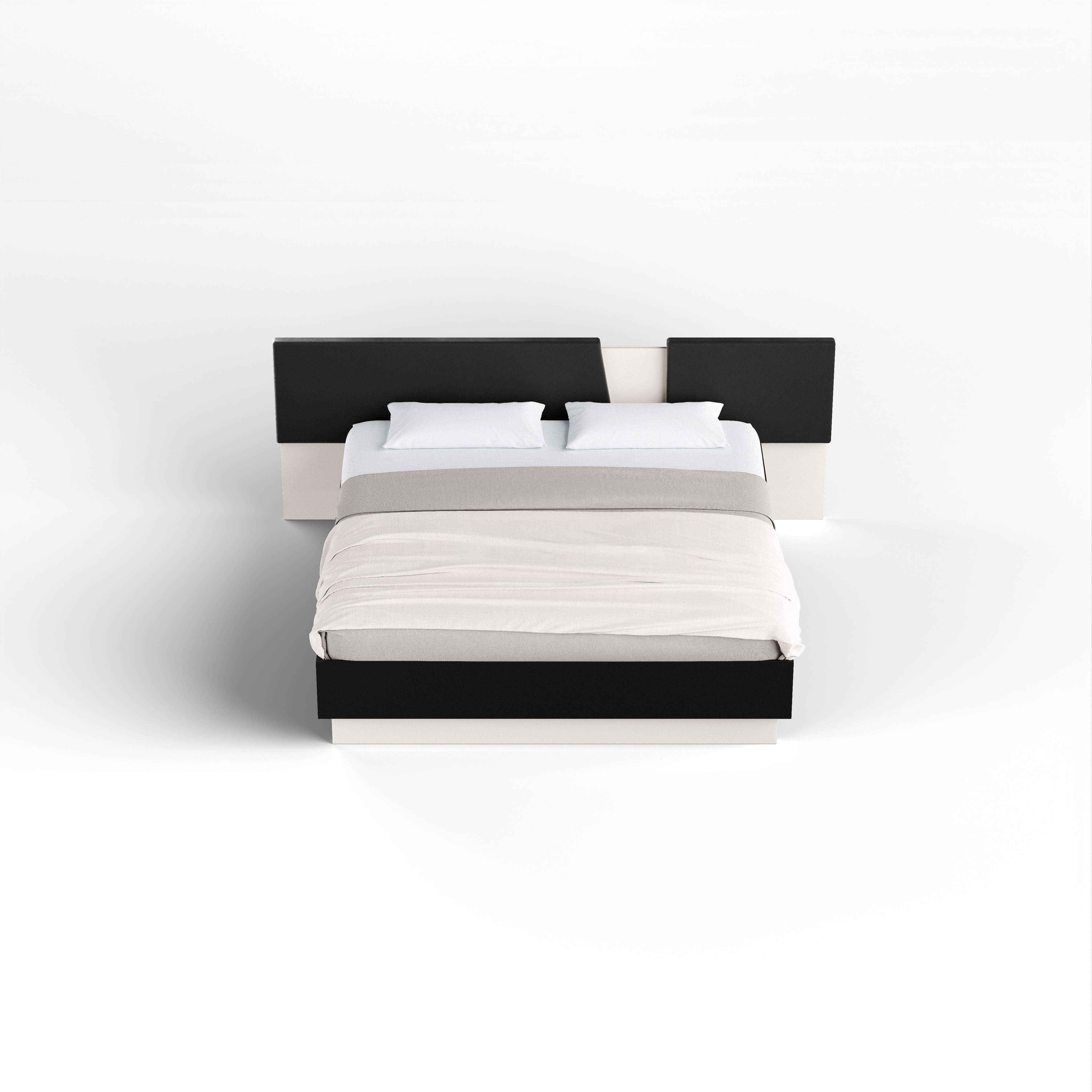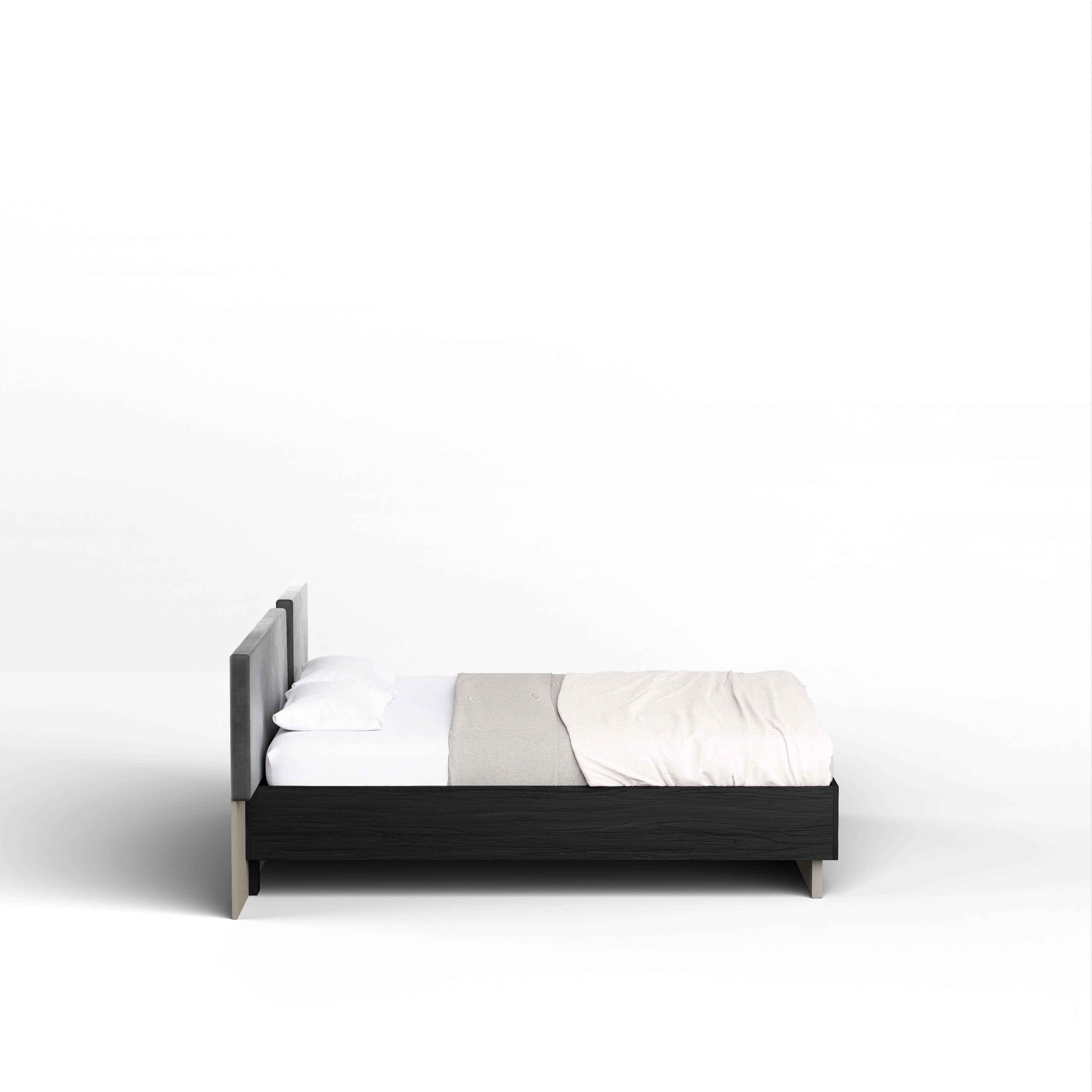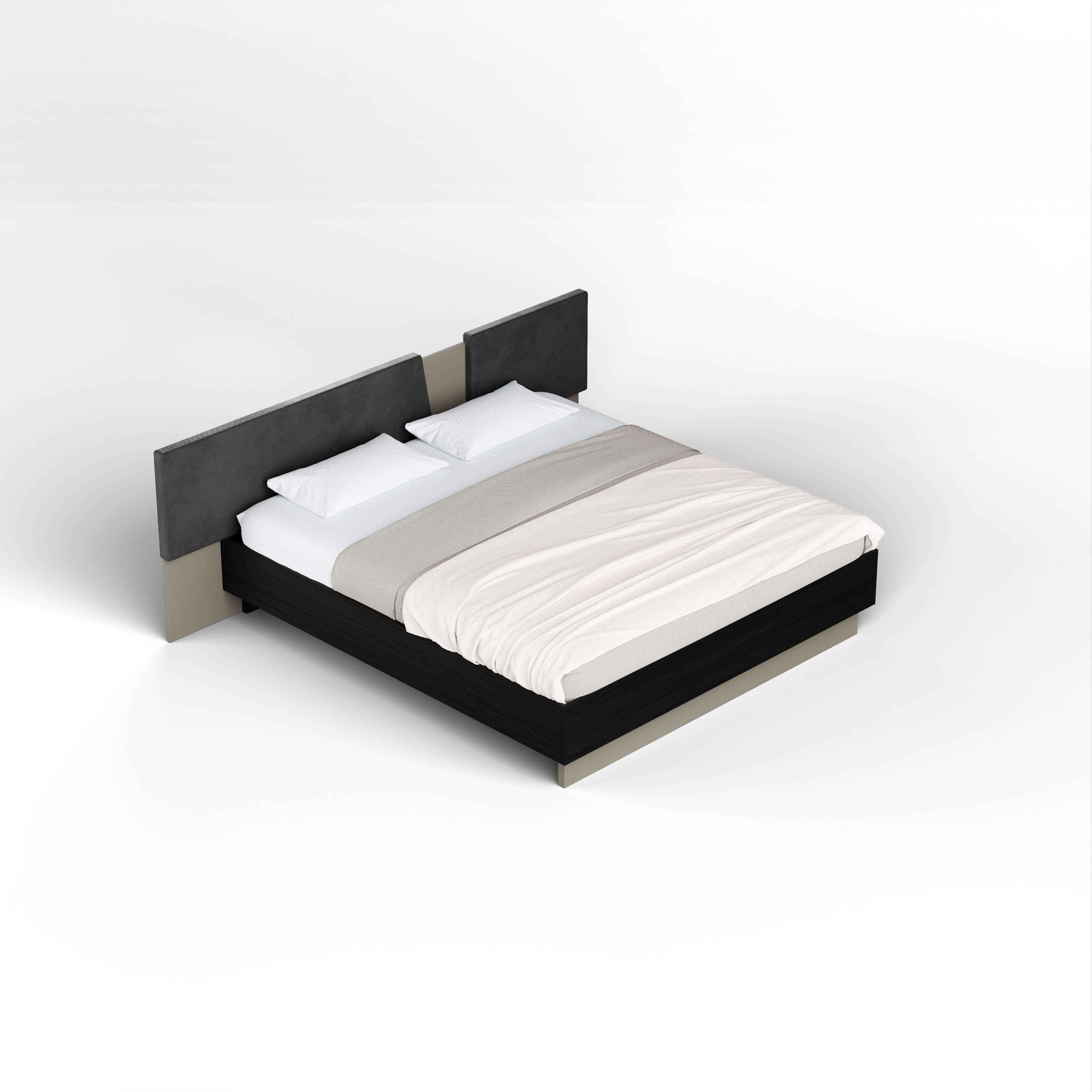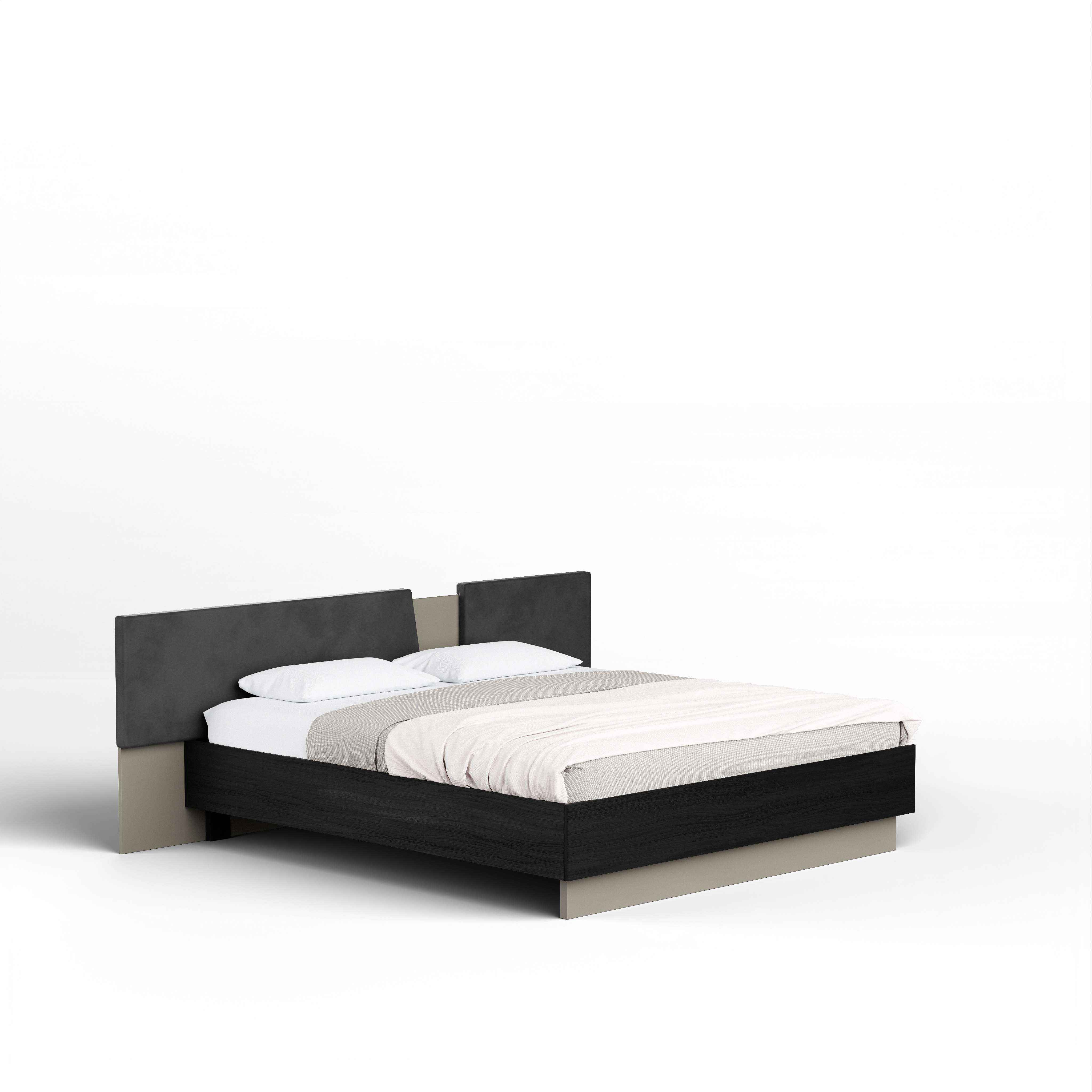 Taupe Pre-Laminated MDF Headboard; Ply & Foam Upholstery Headboard Panel; Charcoal Pre-Laminated MDF Side-Rail; Charcoal Pre-Laminated MDF Footboard Rail; Charcoal Pre-Laminated MDF Headboard Rail; Pre-Laminated MDF Legs; Frosty White Pre-Laminated MDF Bed Top Slat Support; Frosty White Pre-Laminated MDF Bed Bottom Slat Support